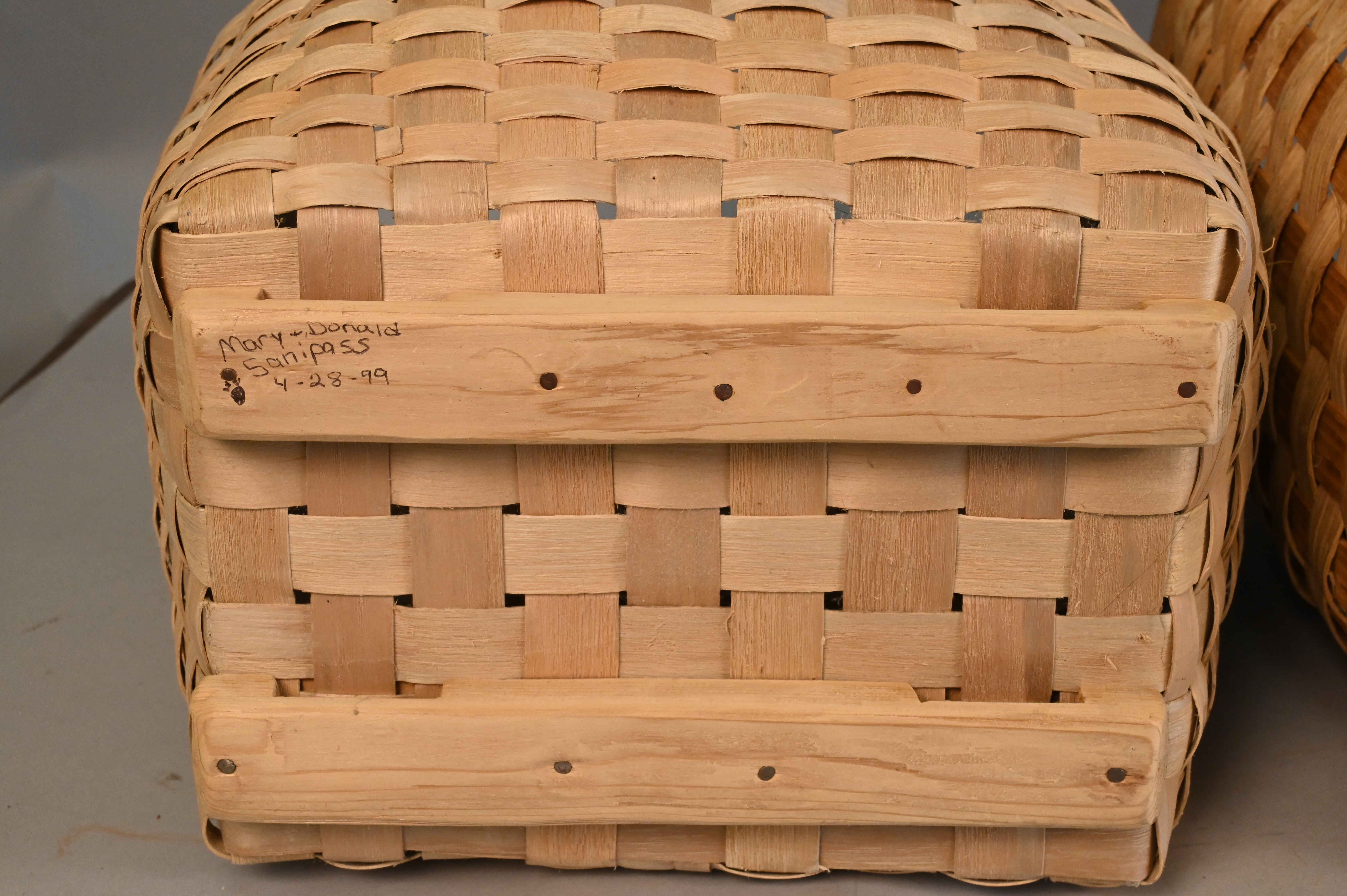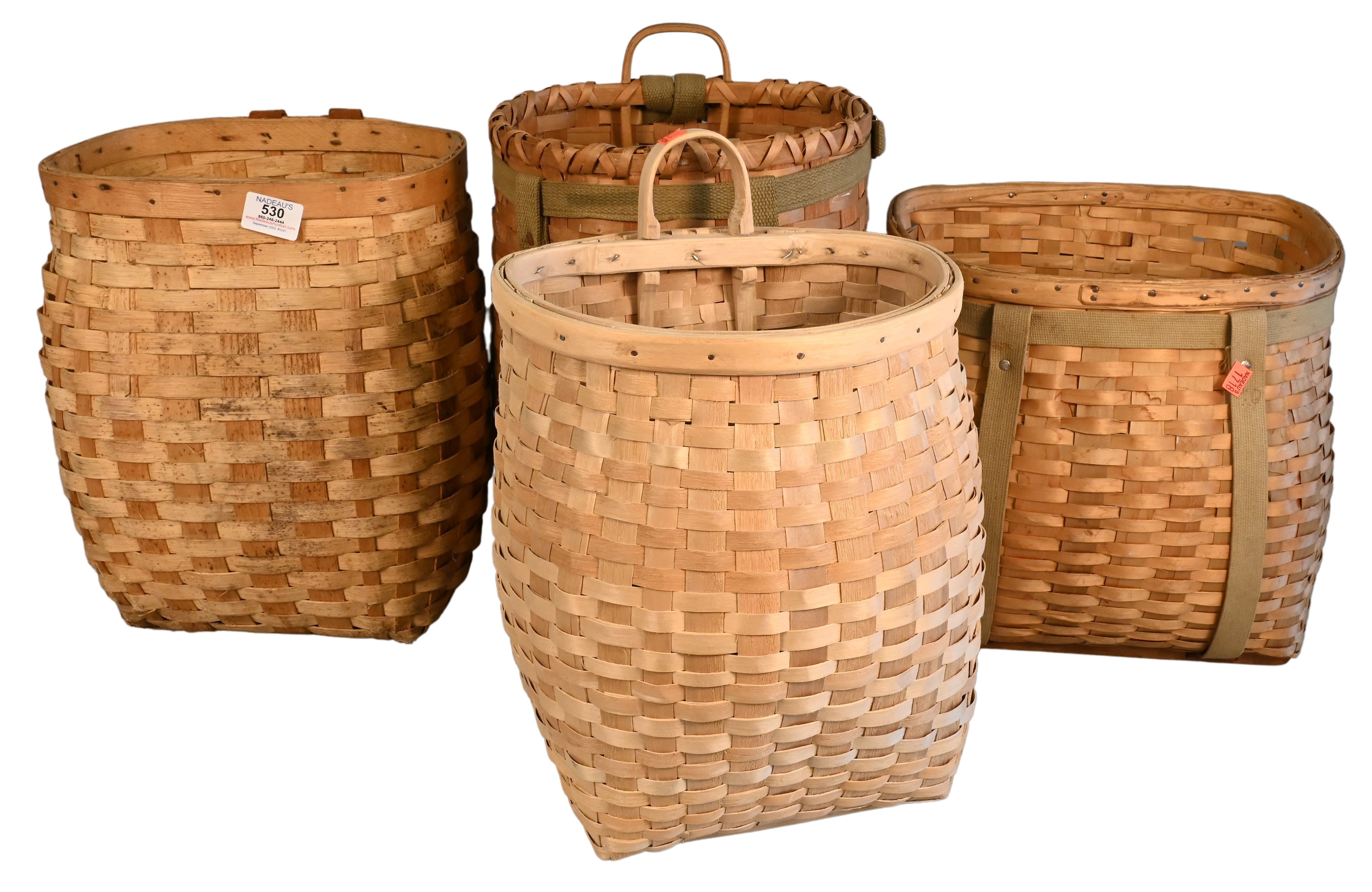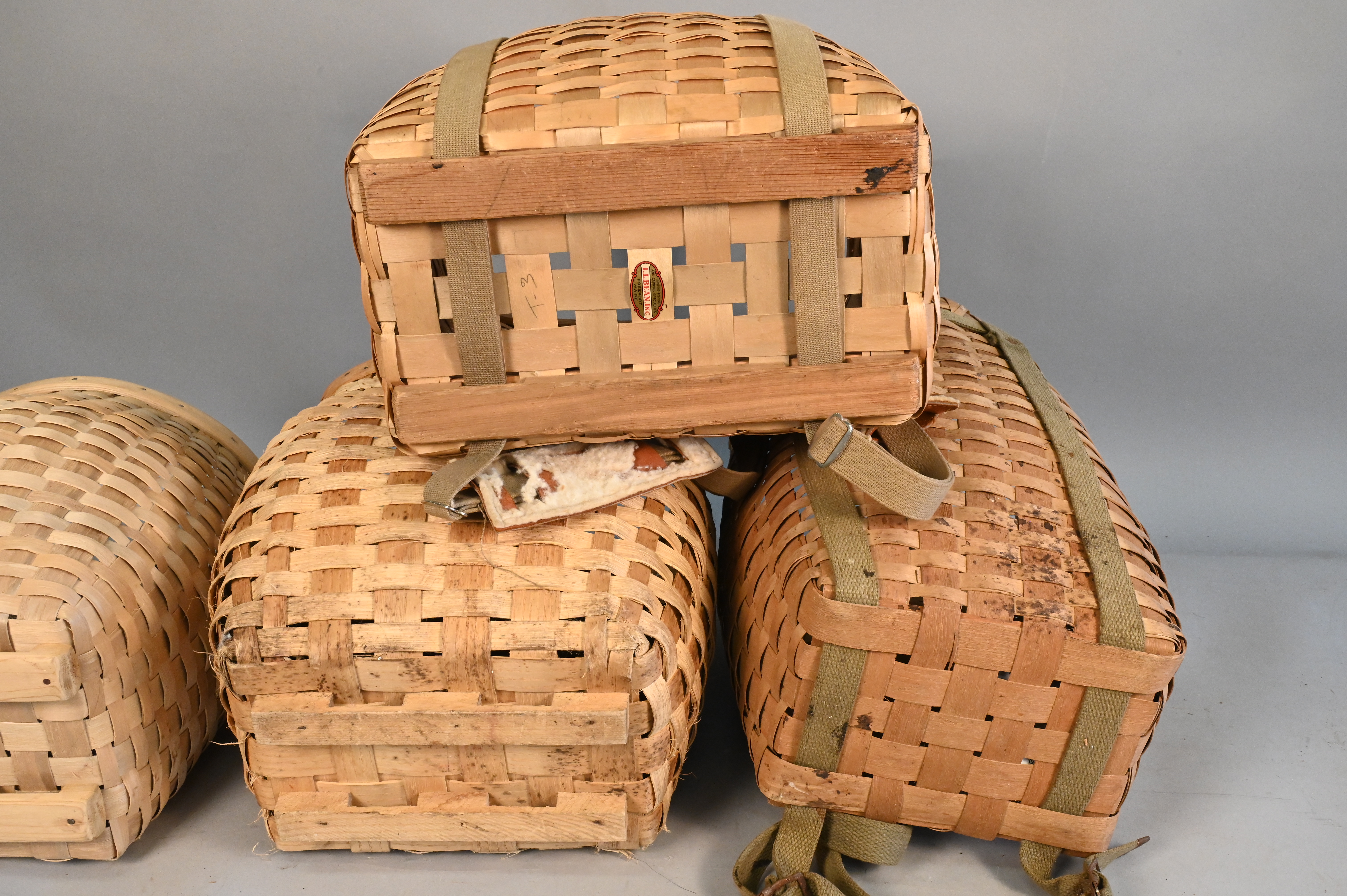 Group of Four Children’s Adirondack Pack Baskets, two of which have canvas straps, height is 16 inches.