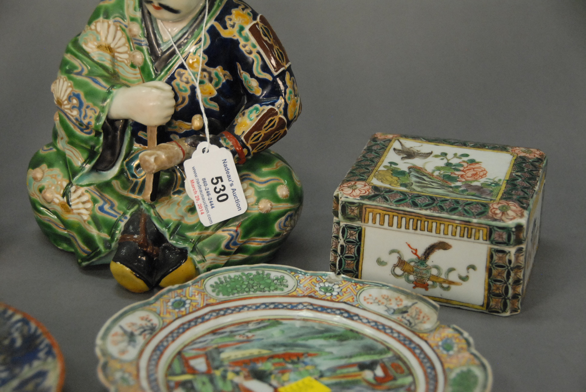 Lot 530: Nine piece lot to include three famille rose plates as is, famille rose oversize tea cup and saucer, famille verte covered box, three Satsuma figures ht. 6 1/2in. & 9 1/2in., and Satsuma pot ht. 5in.