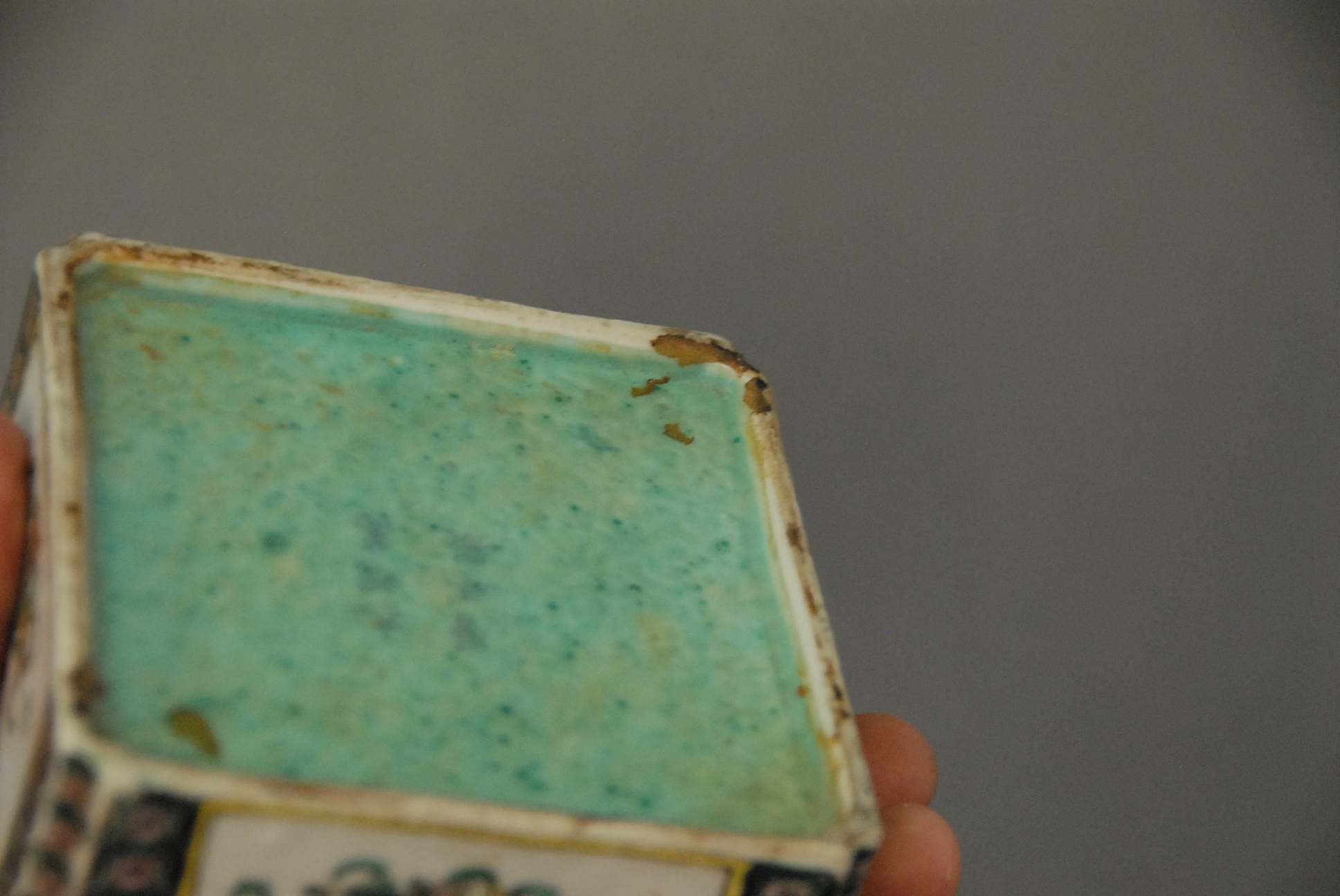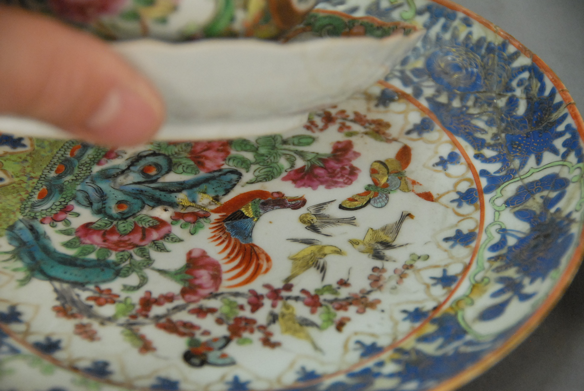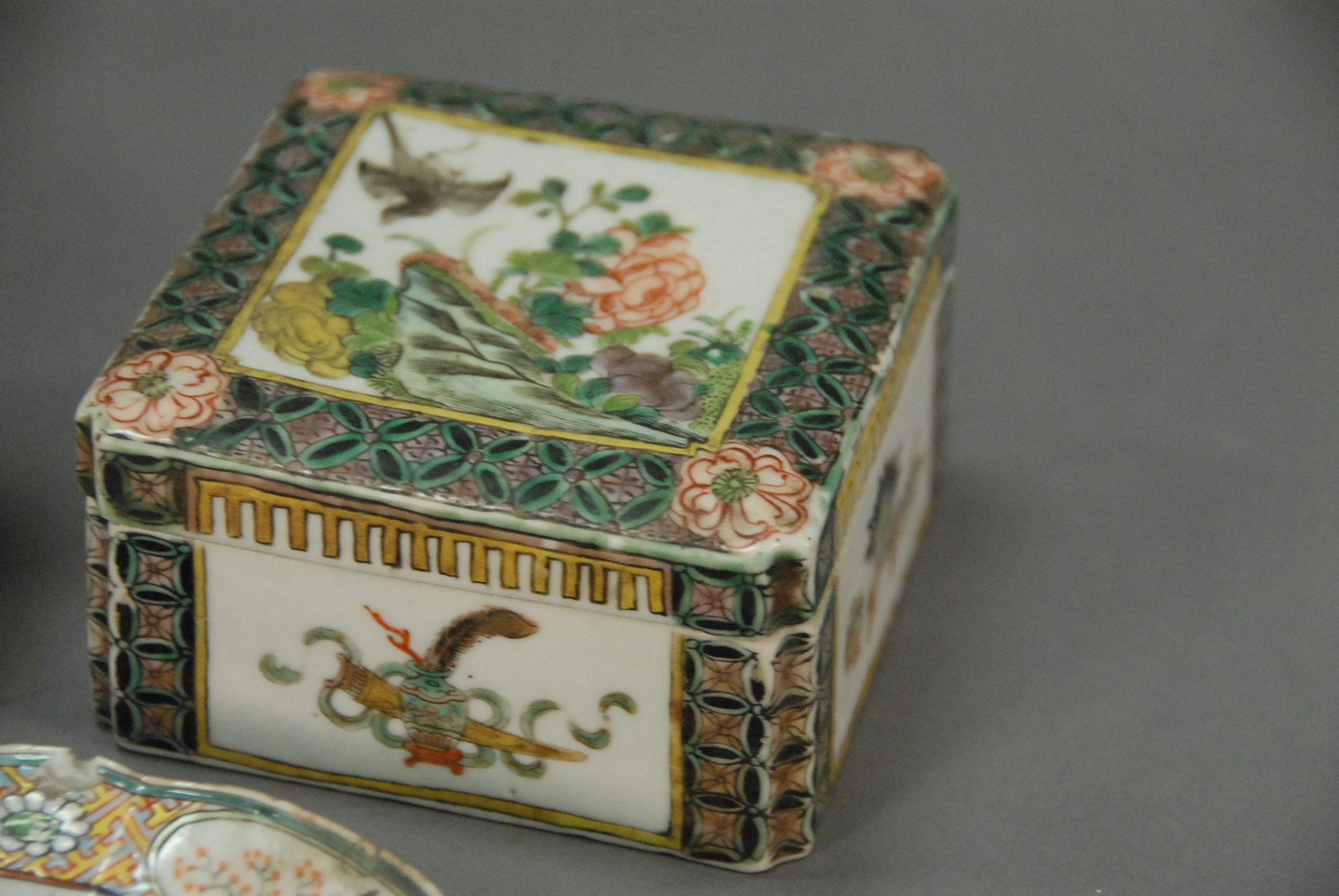 Nine piece lot to include three famille rose plates as is, famille rose oversize tea cup and saucer, famille verte covered box, three Satsuma figures ht. 6 1/2in. & 9 1/2in., and Satsuma pot ht. 5in.