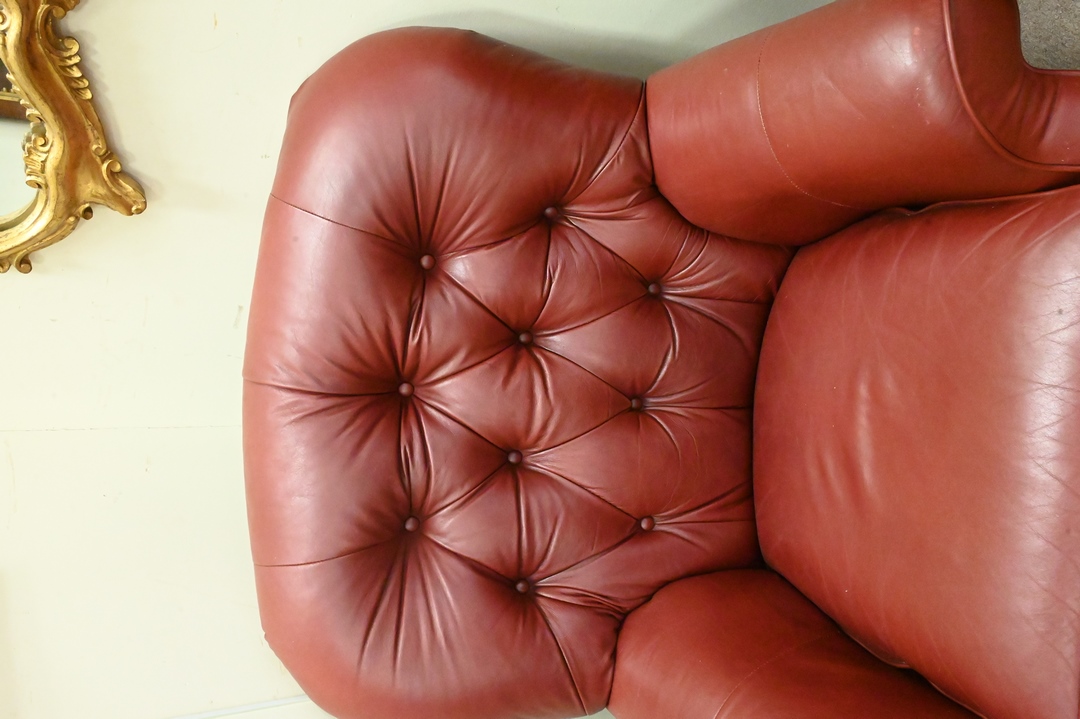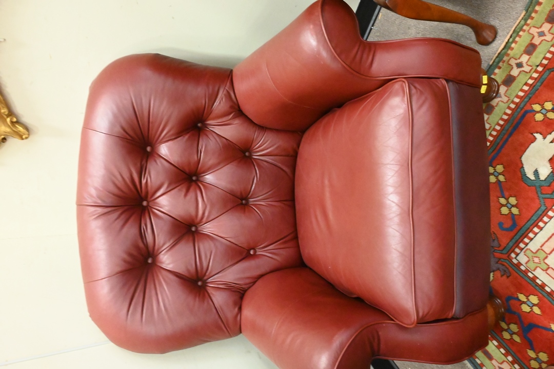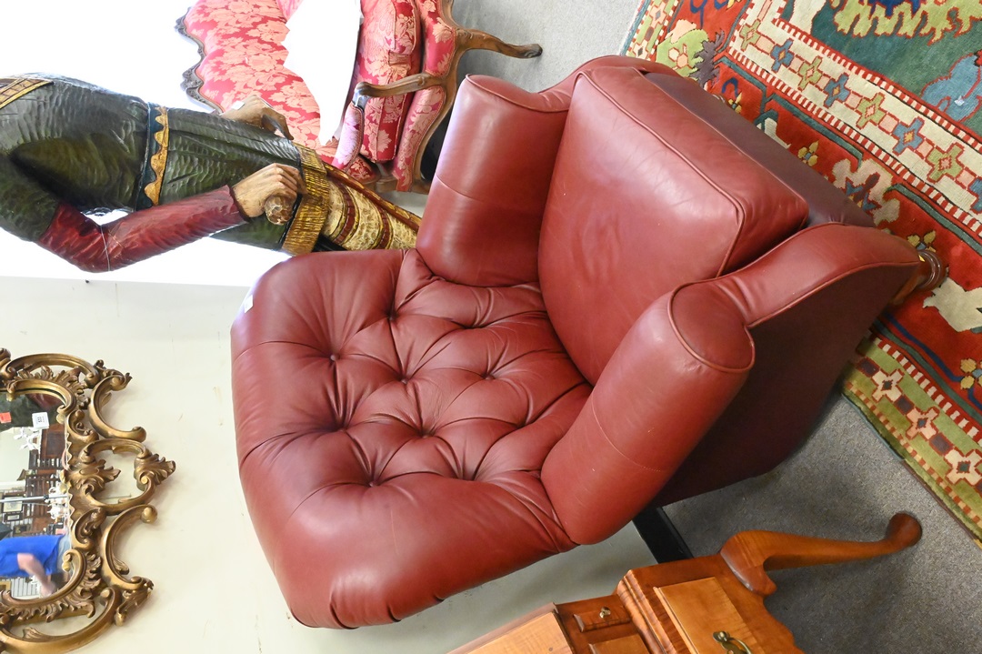 Pair of Leather Club Chairs, each having tufted back, height 40 inches, width 37 inches.