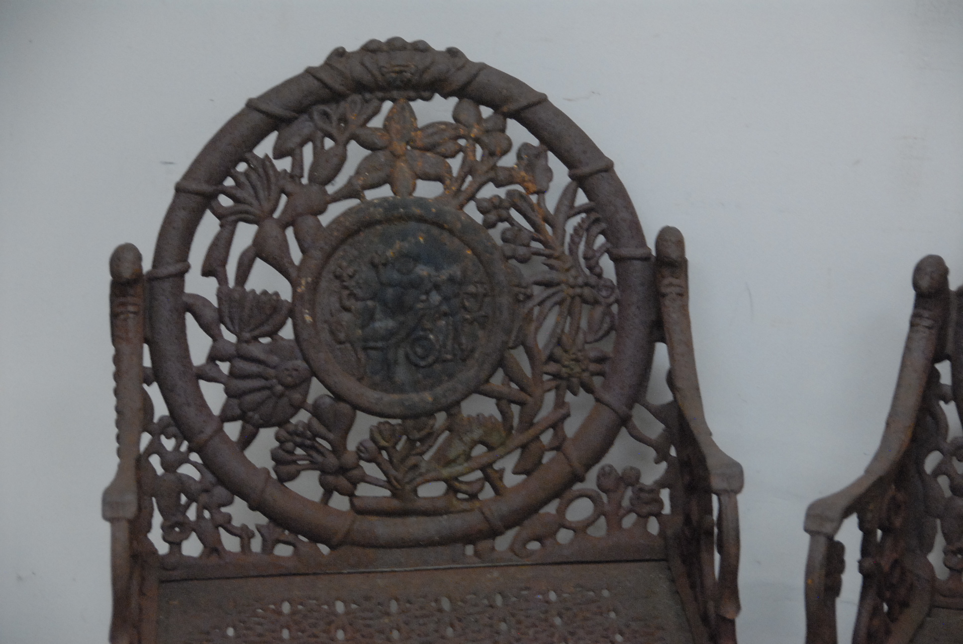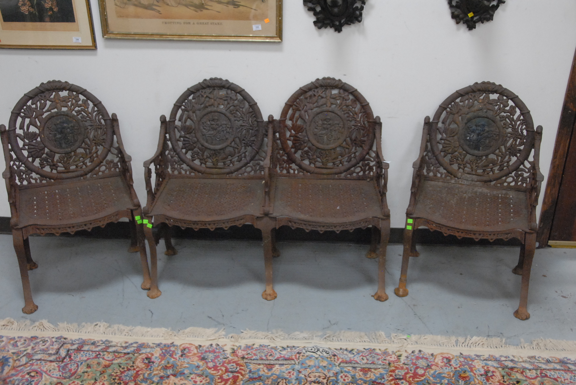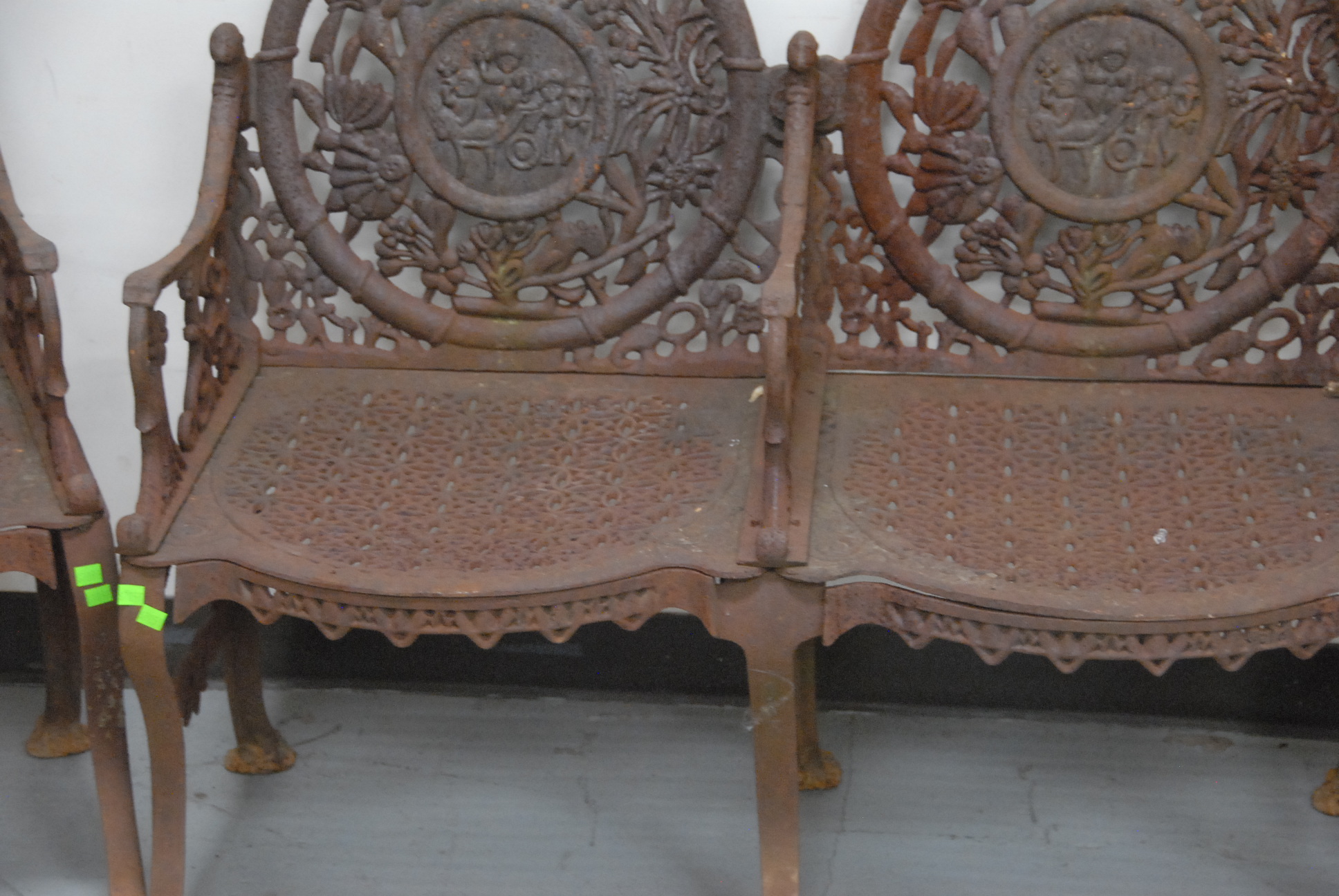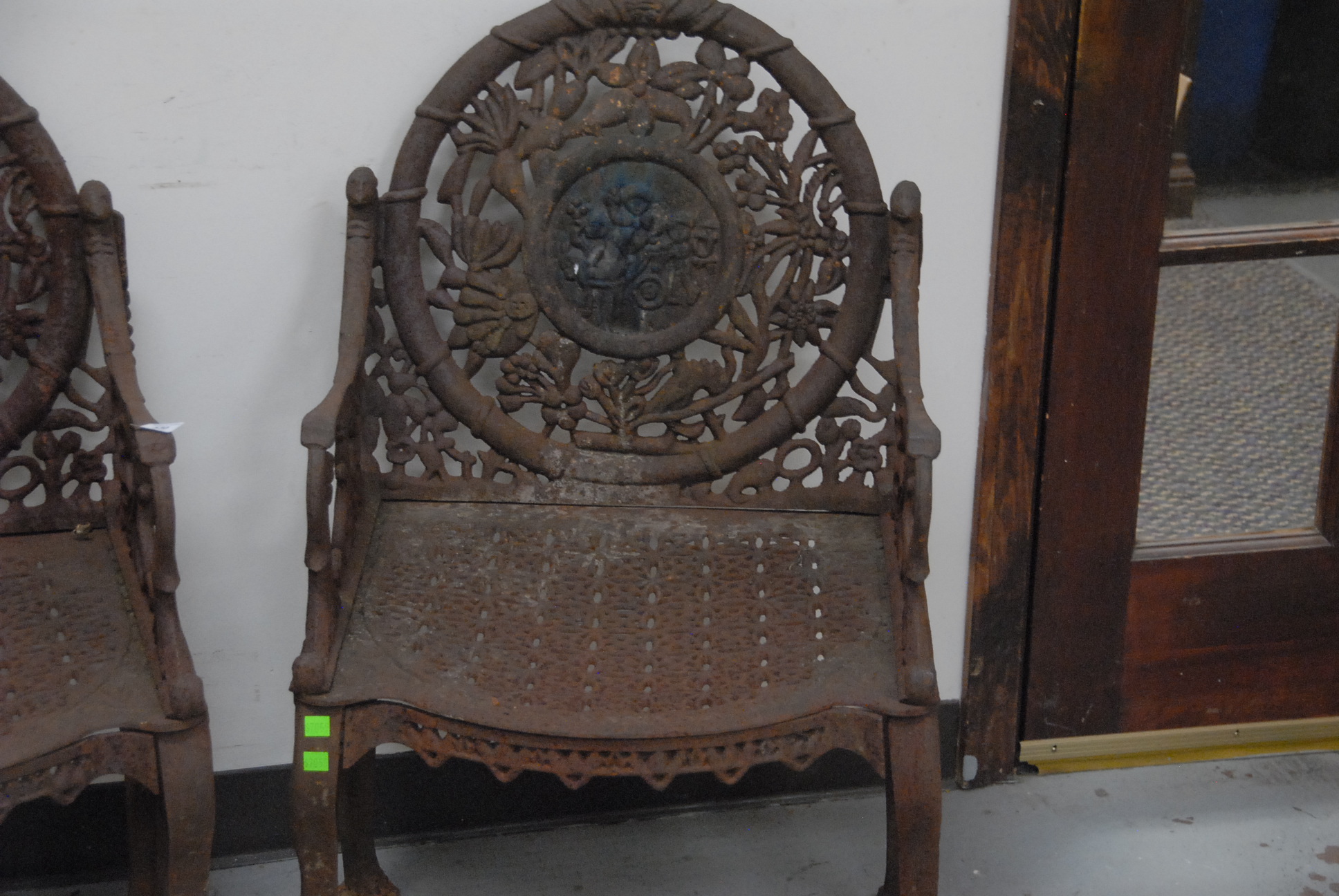 Lot 530: Three piece iron outdoor set to include settee and two armchairs, late 20th century. lg. 42in.
