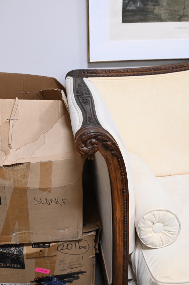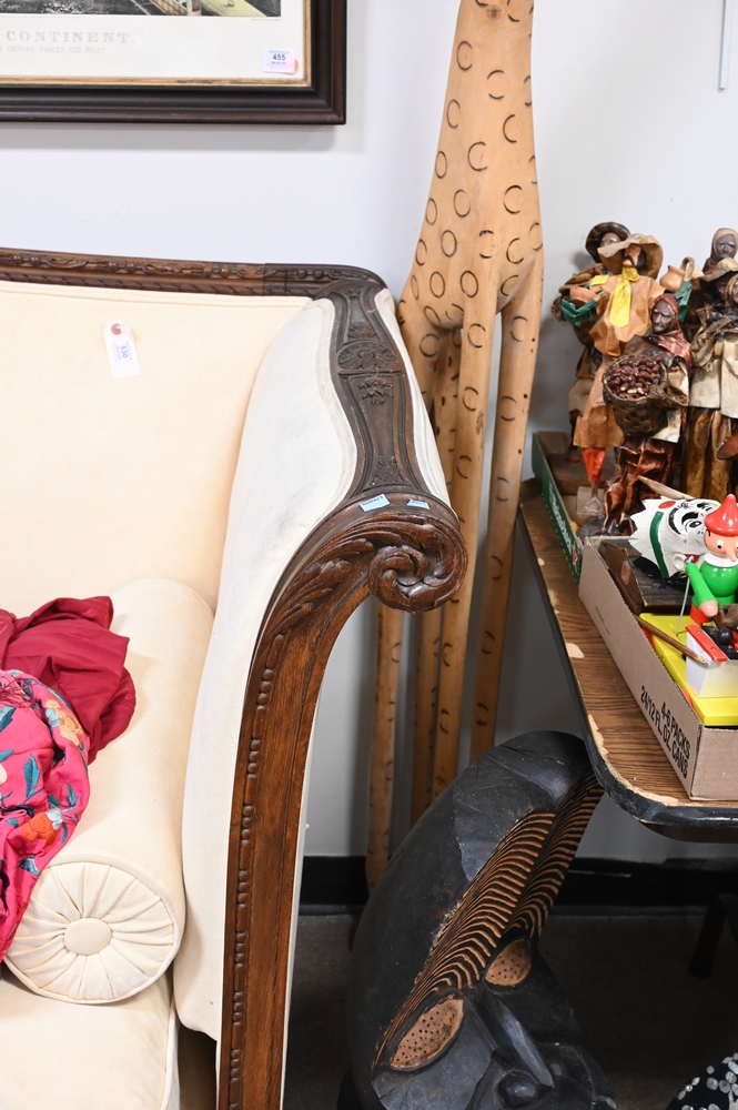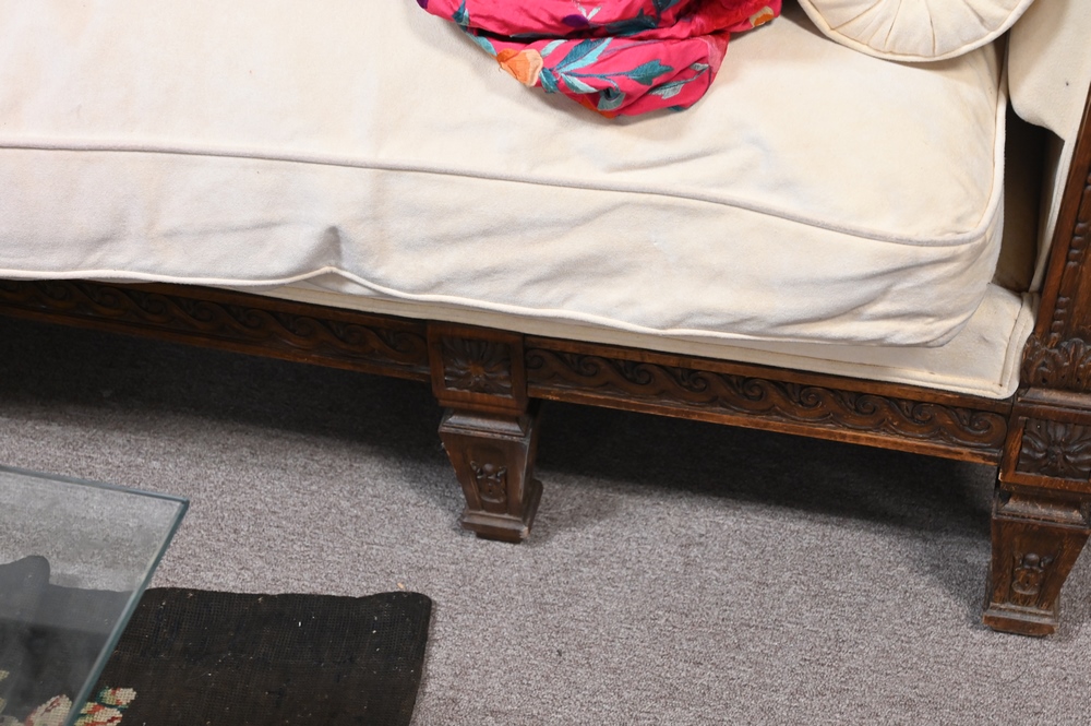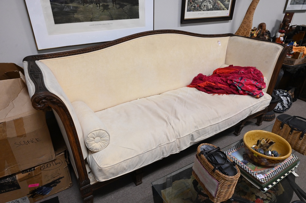 Victorian Sofa, having carved frame and rolled arms, height 44 inches, length 98 inches.