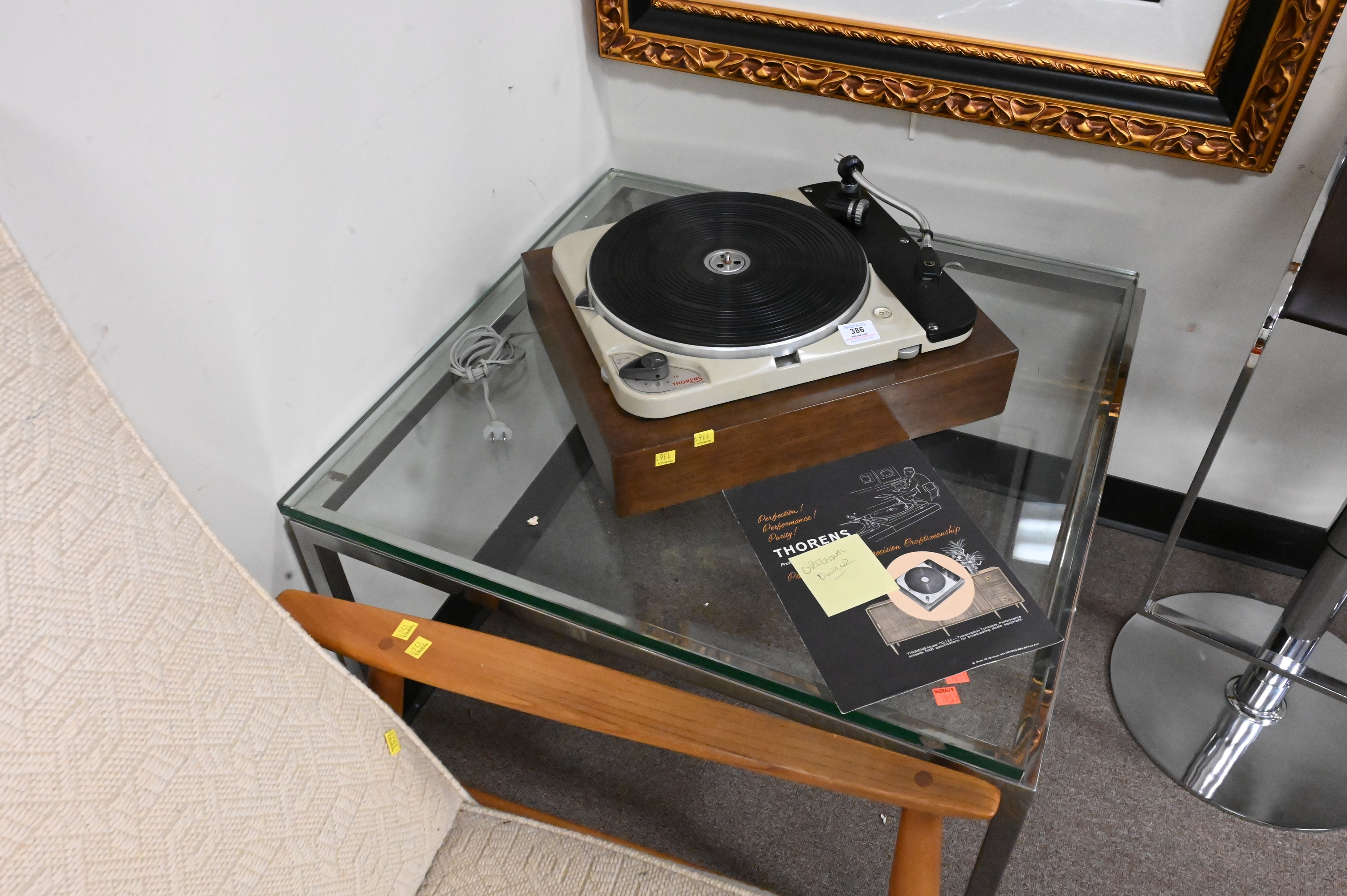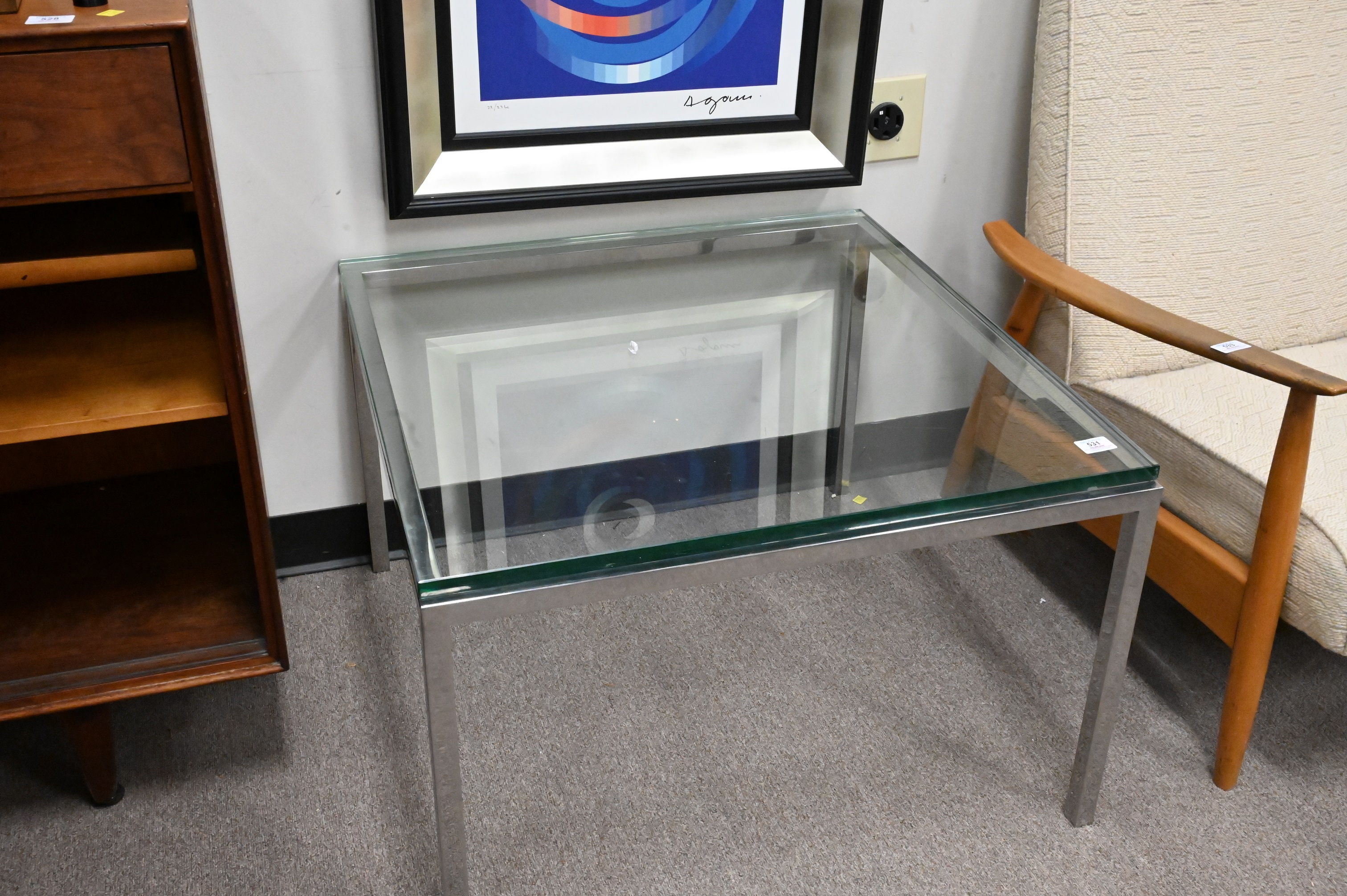 A Pair of Mies Van Der Rohe Chrome and Glass End Tables, height 19 1/2 inches, top 30″ x 30″.