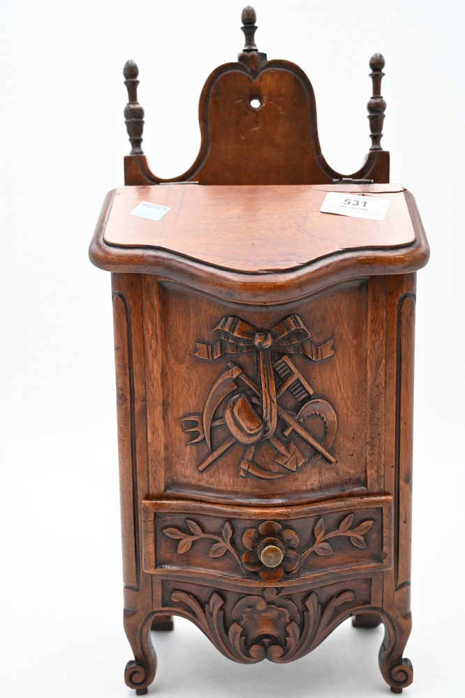 Lot 531: French Carved Pipe Box, having slant lid over one drawer, height without finial 12 1/2 inches, height with finial 17 3/4 inches.