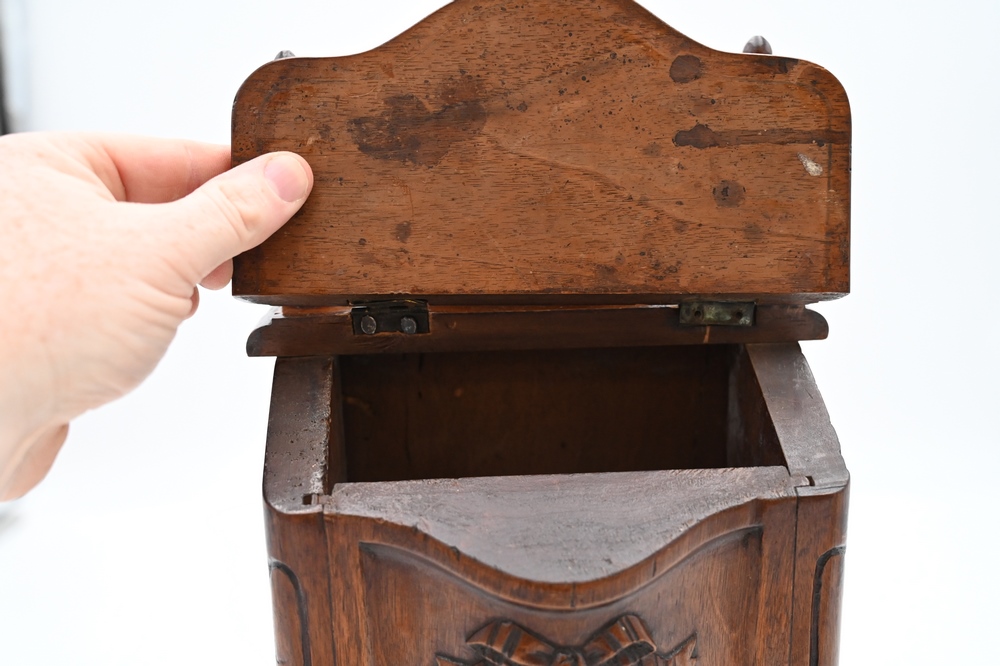 French Carved Pipe Box, having slant lid over one drawer, height without finial 12 1/2 inches, height with finial 17 3/4 inches.