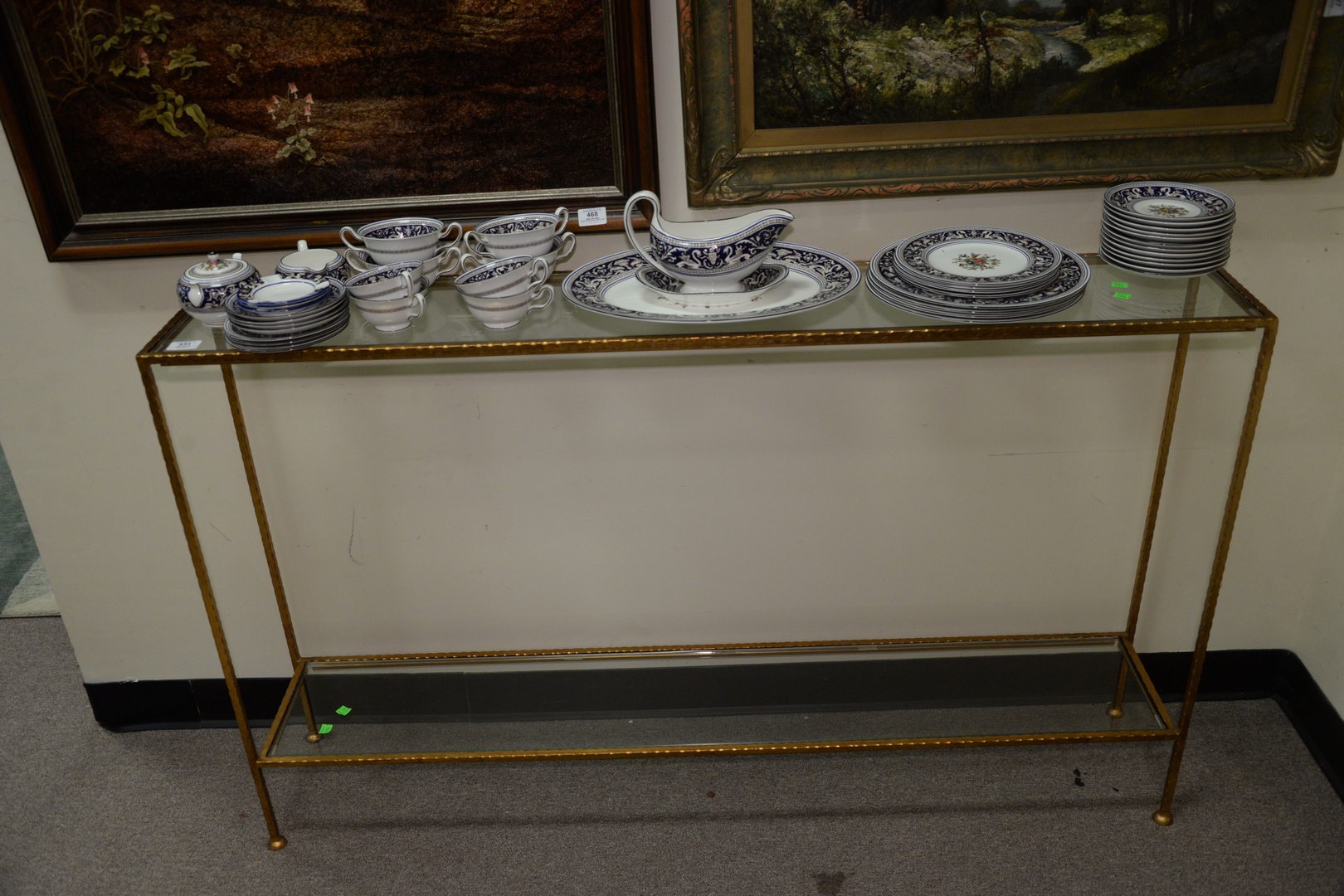 Lot 531: Glass Top and Brass Hall Table, height 33 inches, top 10″ x 55″. Provenance: David and Cynthia Kim, 22 Stoney Wylde Lane, Greenwich, Connecticut. View home by visiting: https://www.zillow.com/homedetails/22-Stoney-Wylde-Ln-Greenwich-CT-06830/177238281_zpid/