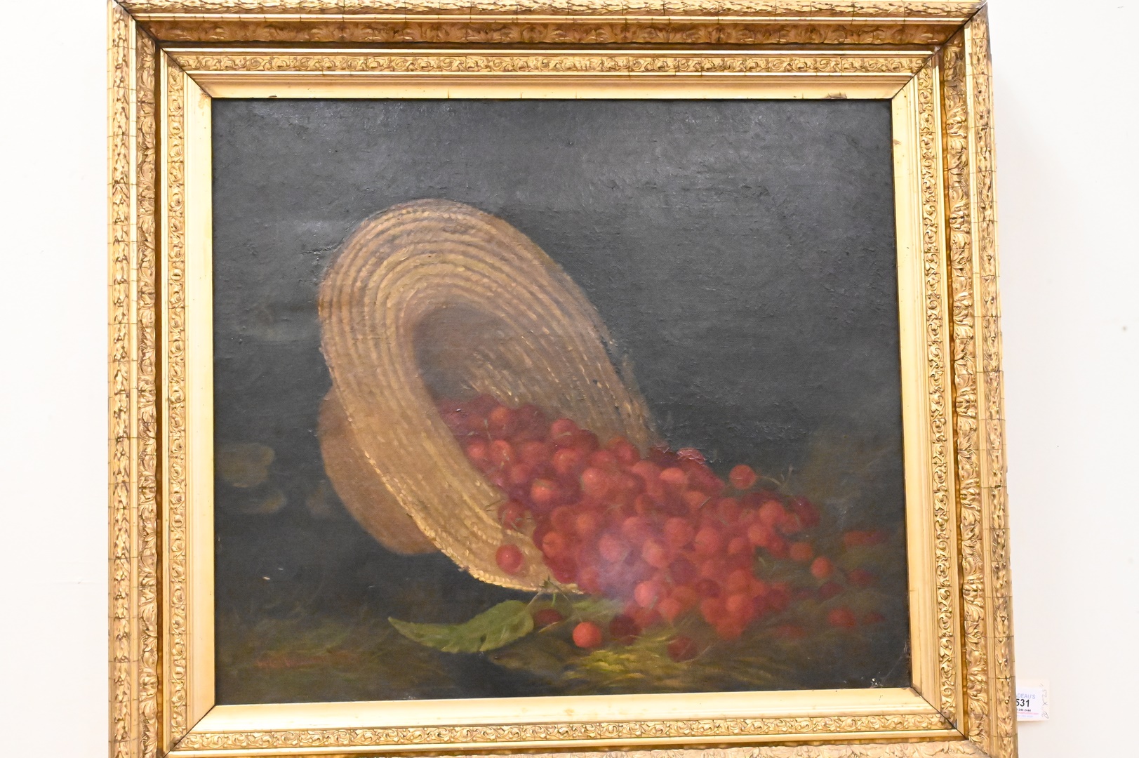 Hartwell Leon Woodcock (1853 – 1929), still life of cherries, oil on canvas, signed lower left H.L. Woodcock, 1896, 20″ x 23″. Provenance: Estate of Florence Yannios, Waterfront Home, Guilford, CT.