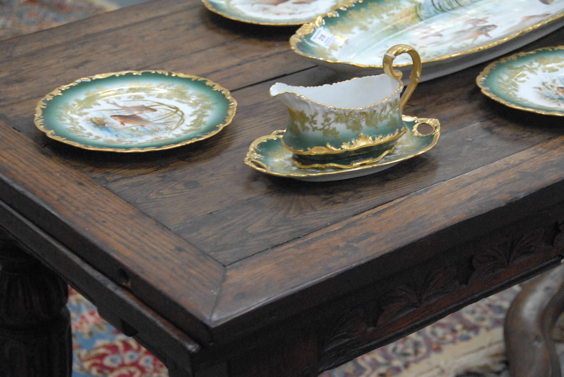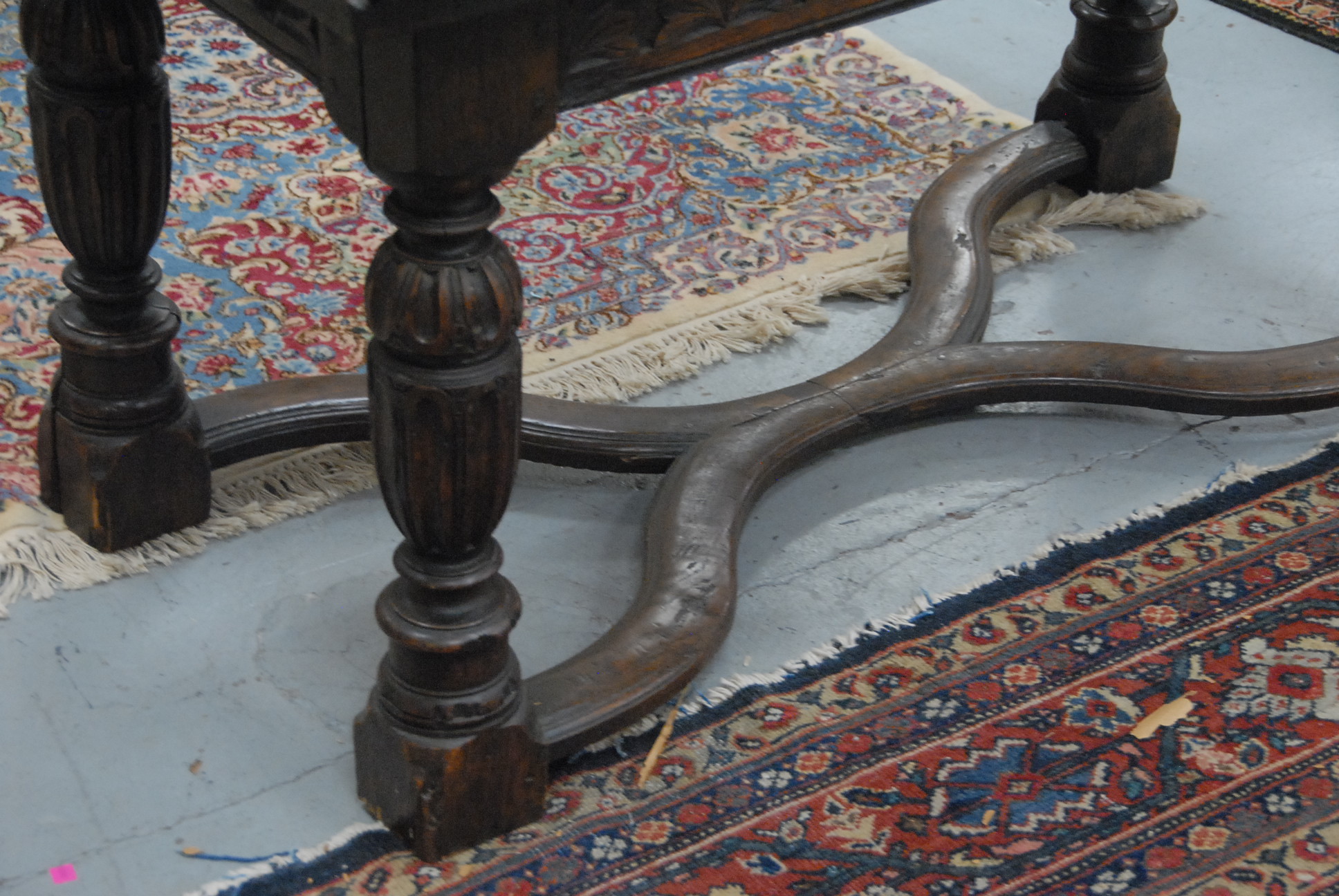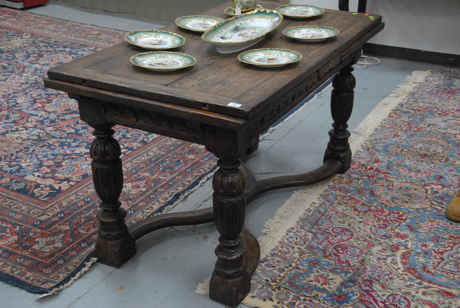 Lot 531: Jacobean table with rectangular top with pull out leaves on carved frame set on carved and turned legs with stretcher base. ht. 31in. wd. 30in. lg. 57in.
