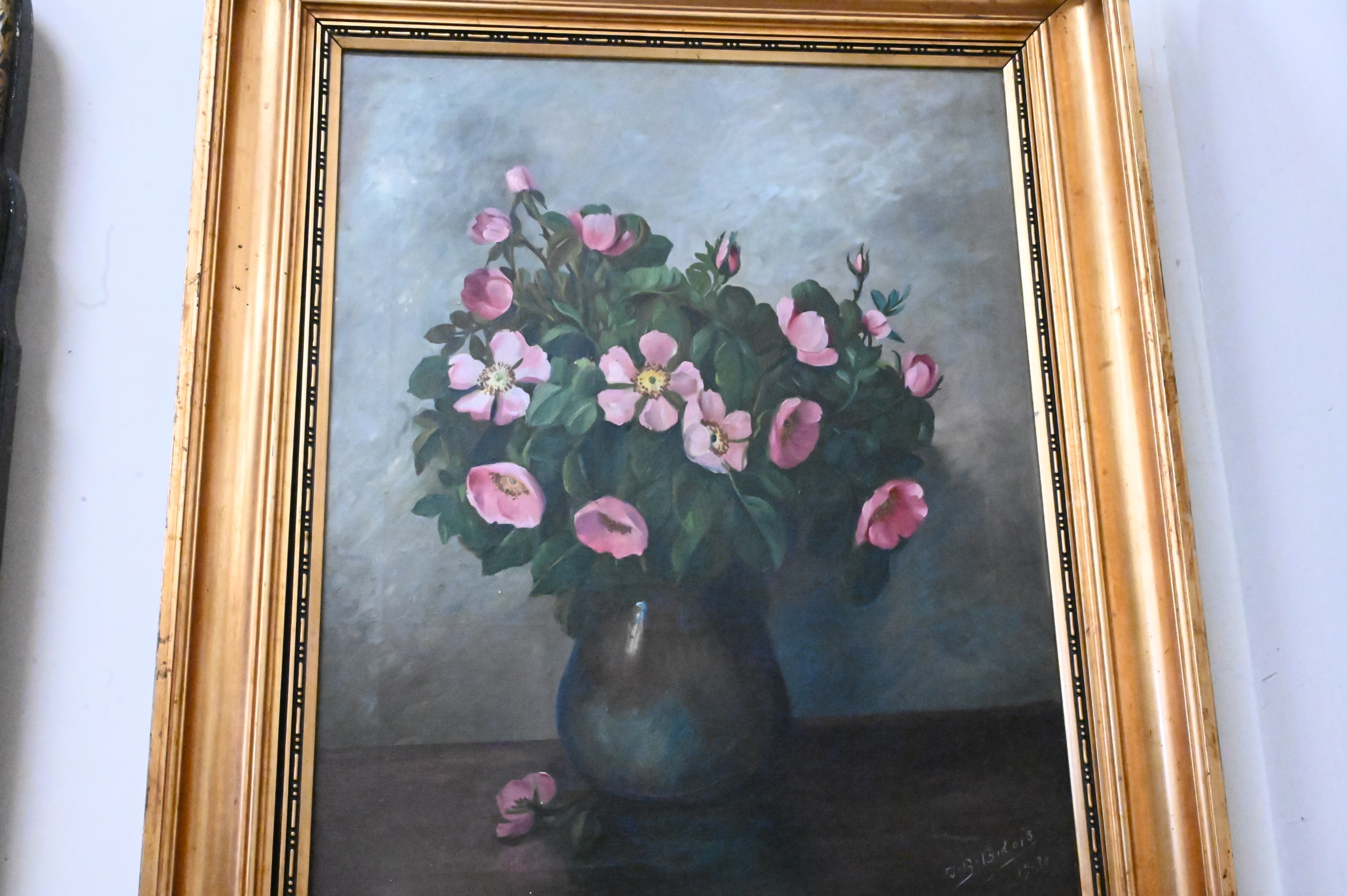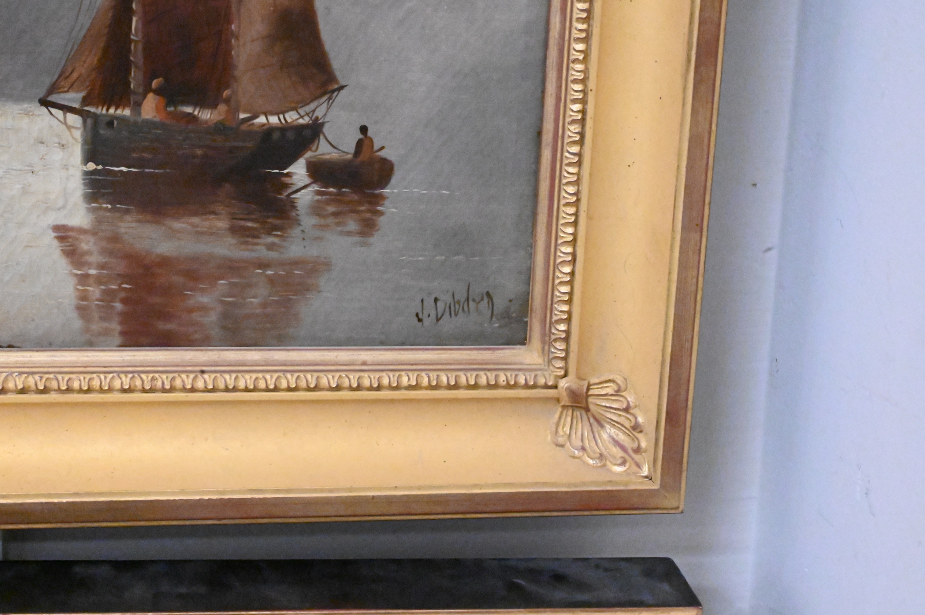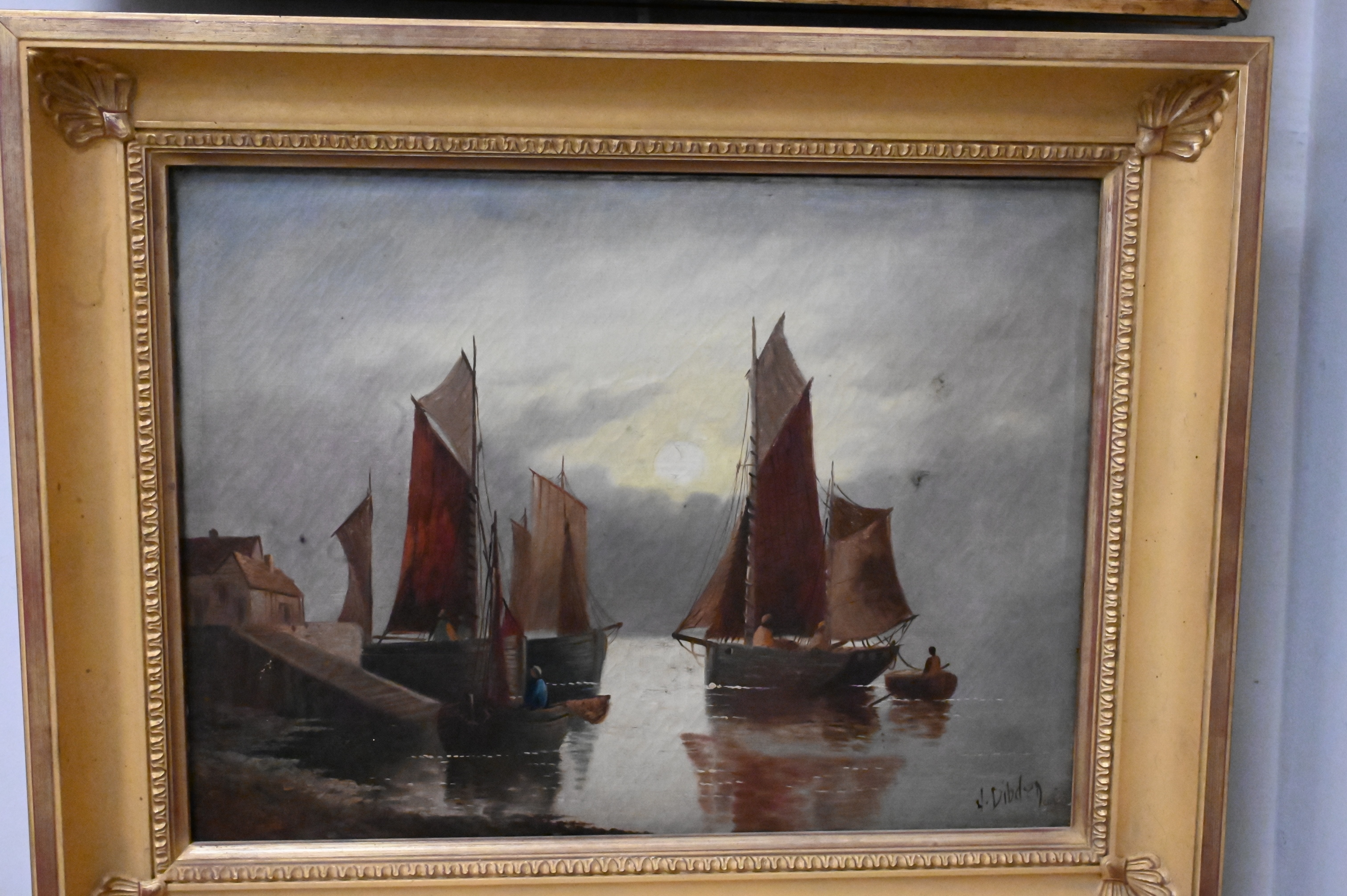 Decorative Arts Lot, to include a pair of oil on canvas harbor scenes with sailboats, signed indistinctly lower left “J. Dibden”, 16″ x 20″, still life of flowers, oil on canvas, signed lower right “J.B Bidois 1930”