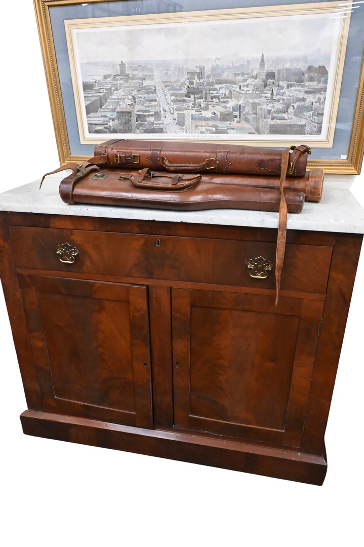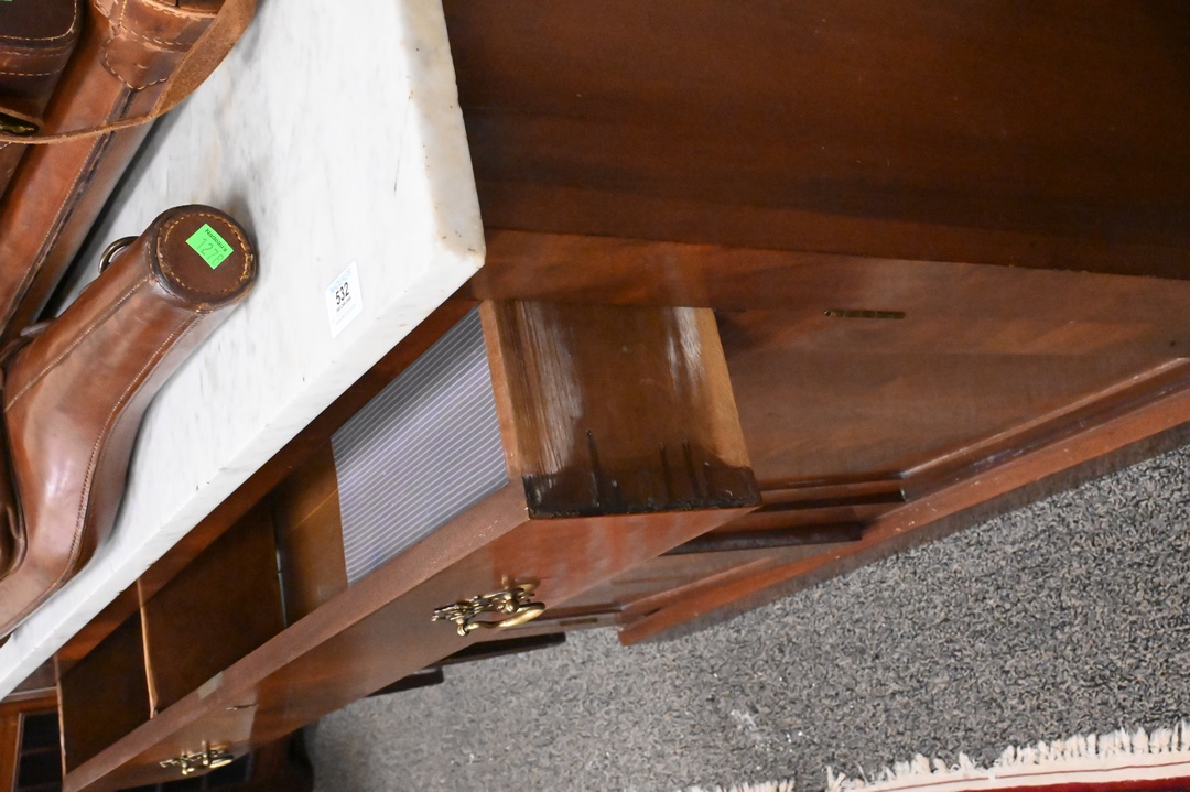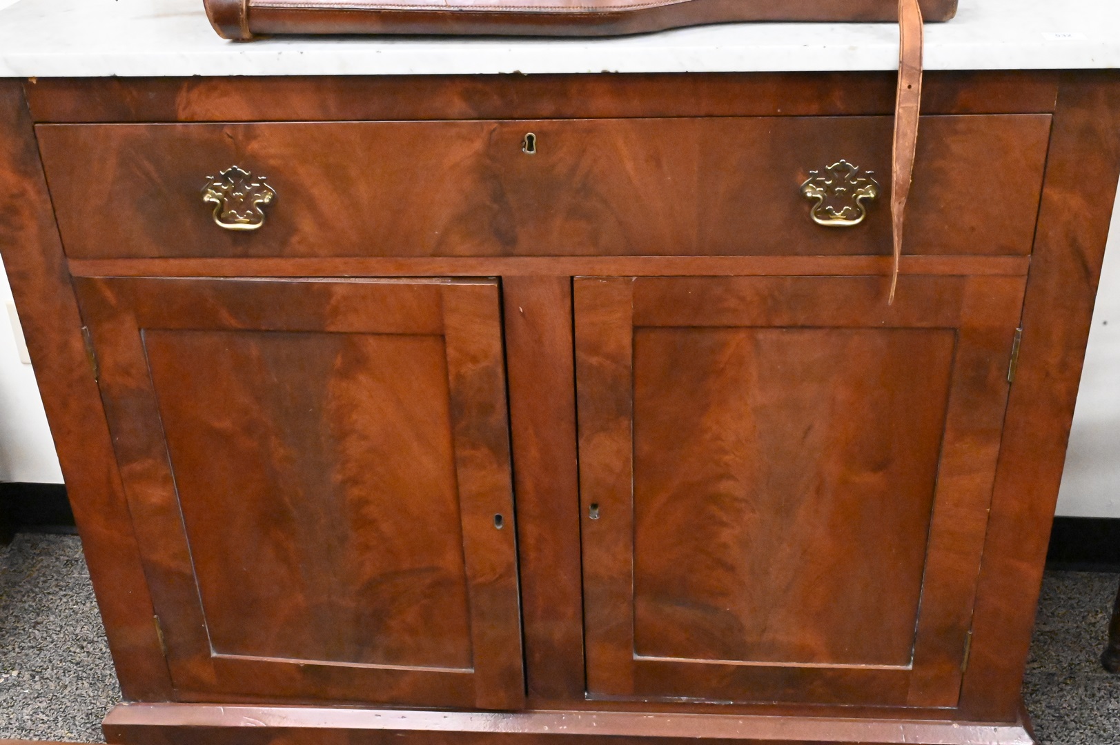 Empire Mahogany Marble Top Server, having one drawer over two doors, height 40 inches, top 48″ x 18″.