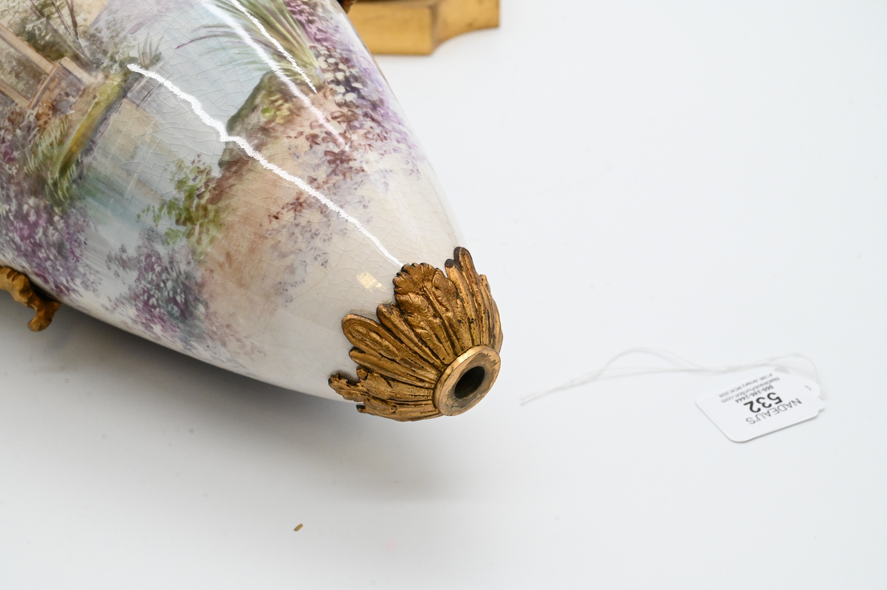 having ormolu handles and base, hand painted classical scenes of women and cherub in a landscape signed J. Aublet, repaired