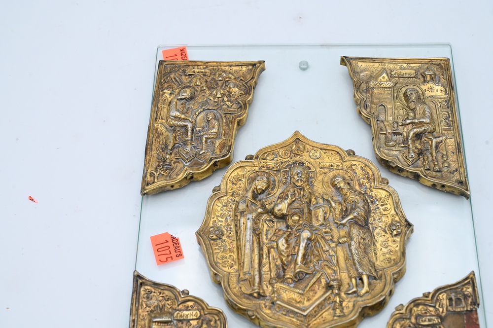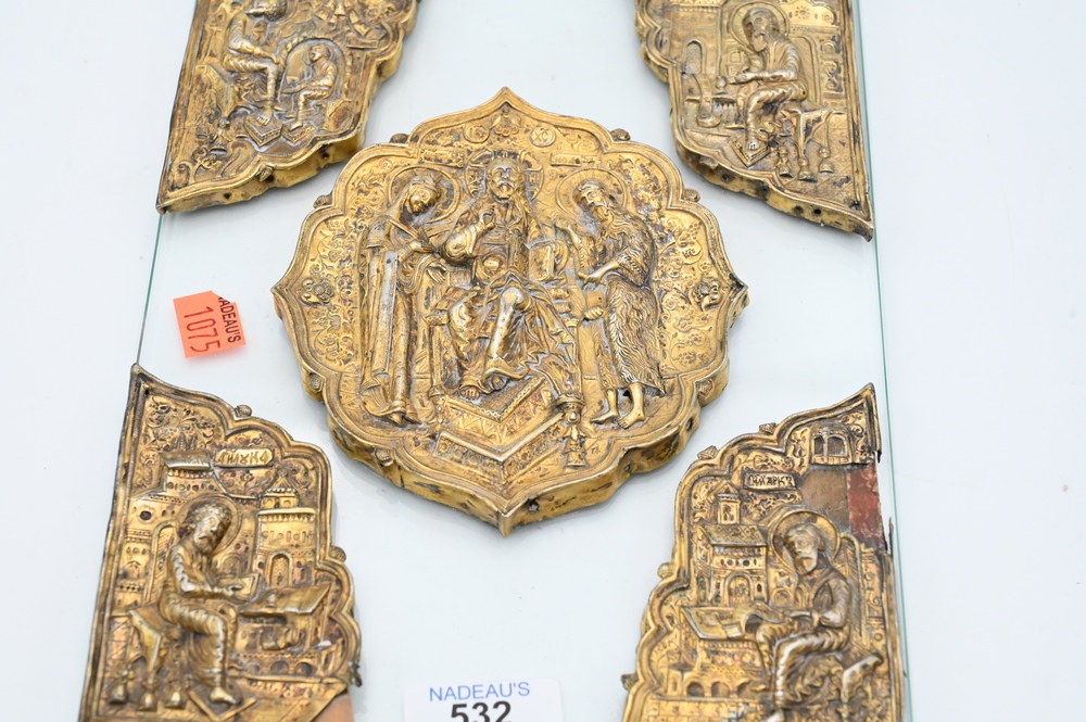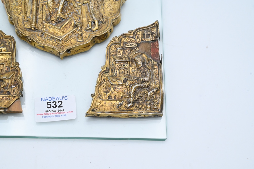 Russian Silver Vermeil, having embossed corners and center icons, now mounted on glass, with two chips, 12″ x 8″.