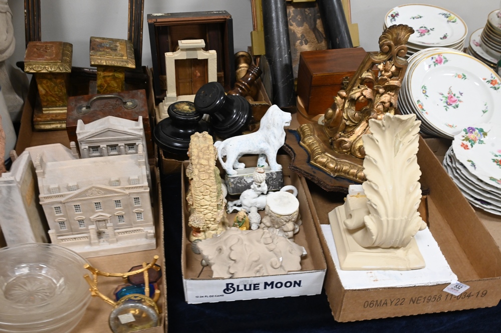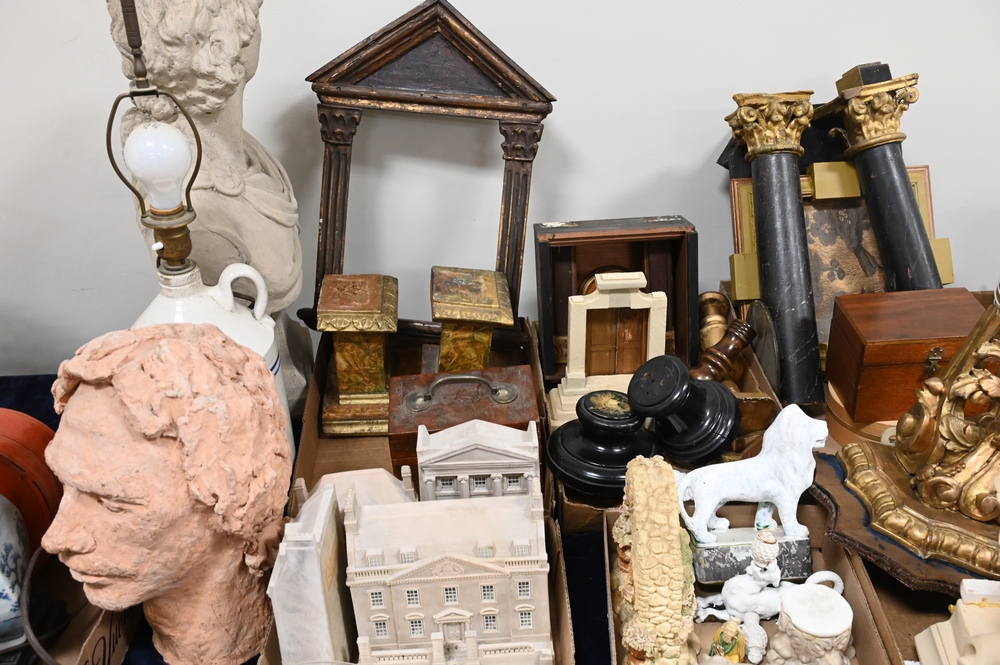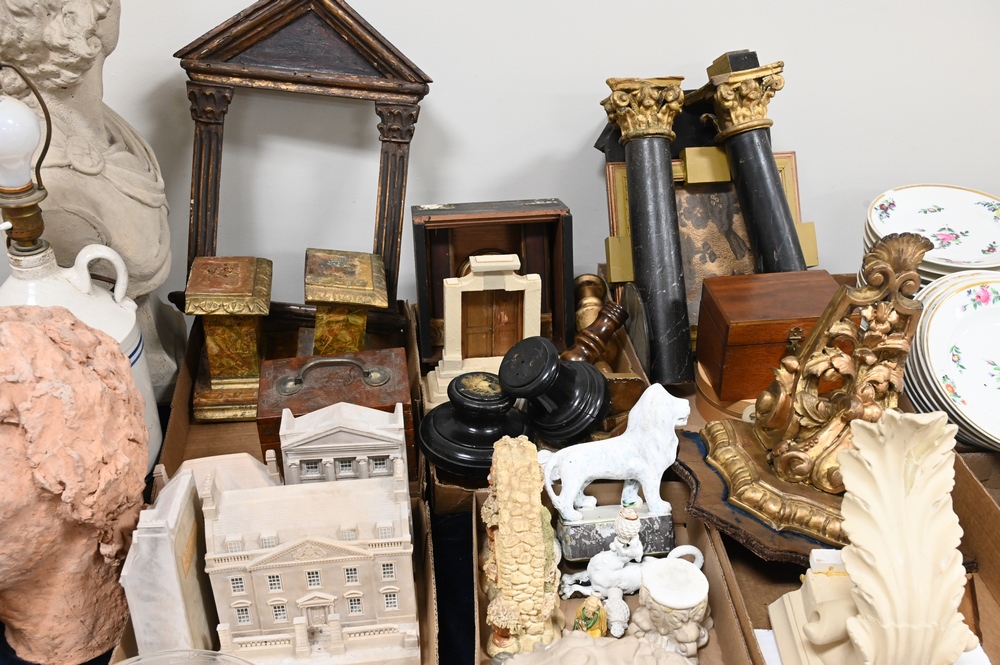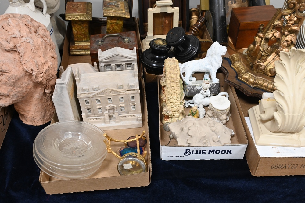 Lot 532: Six Box Lots of Assorted Items, to include carved shelves, pillars, busts, Timothy Richards houses, brass inlaid box marked “Boston”…