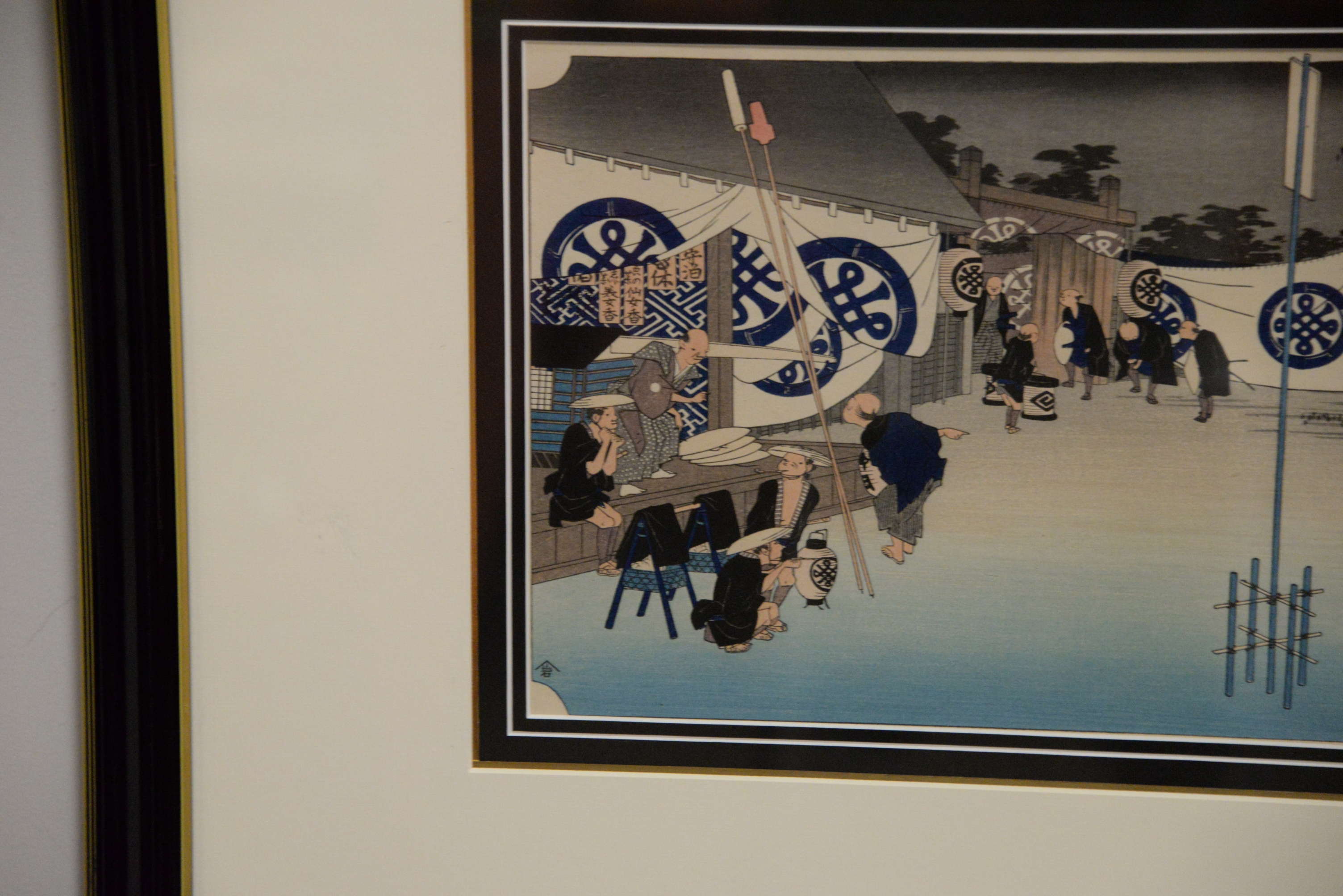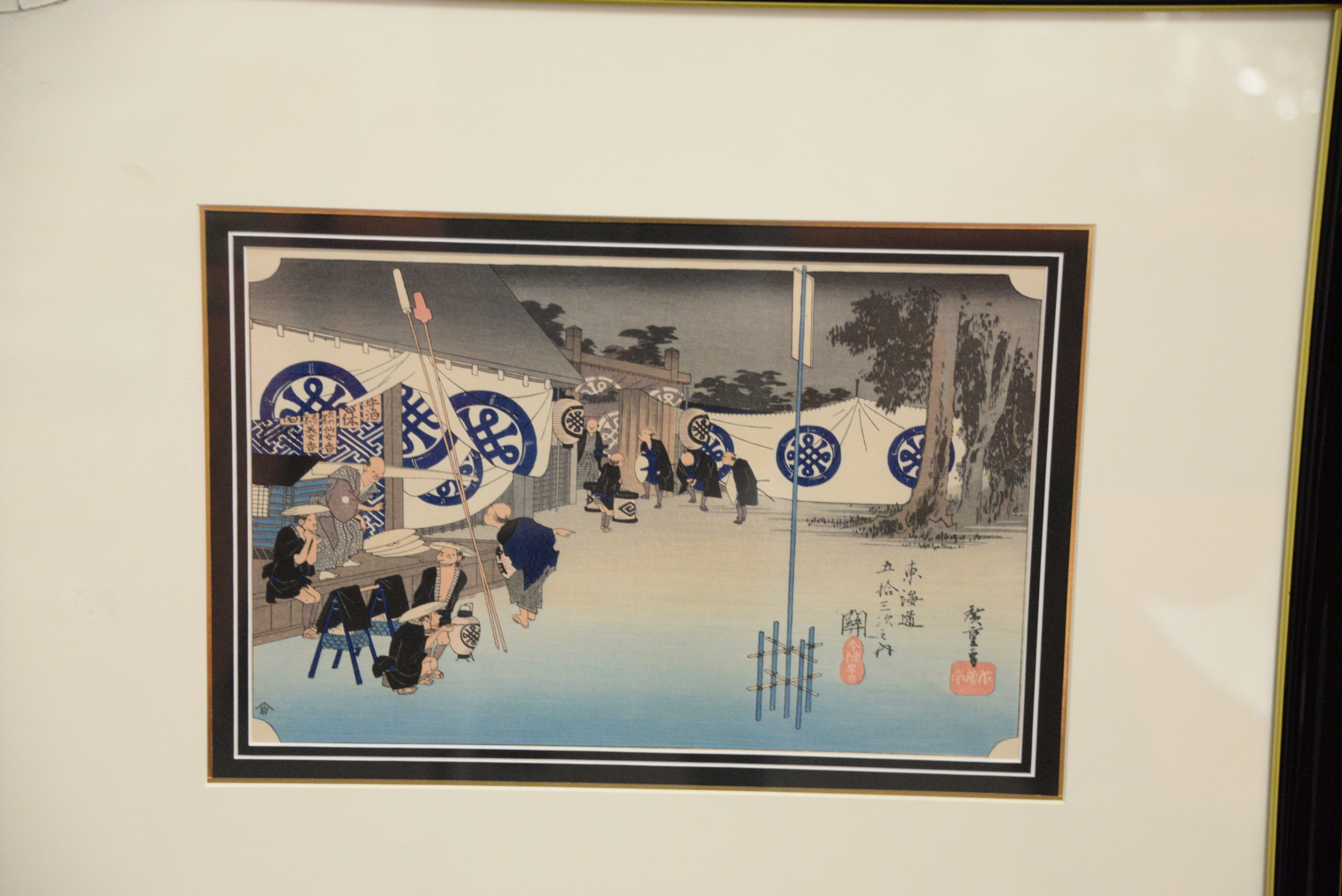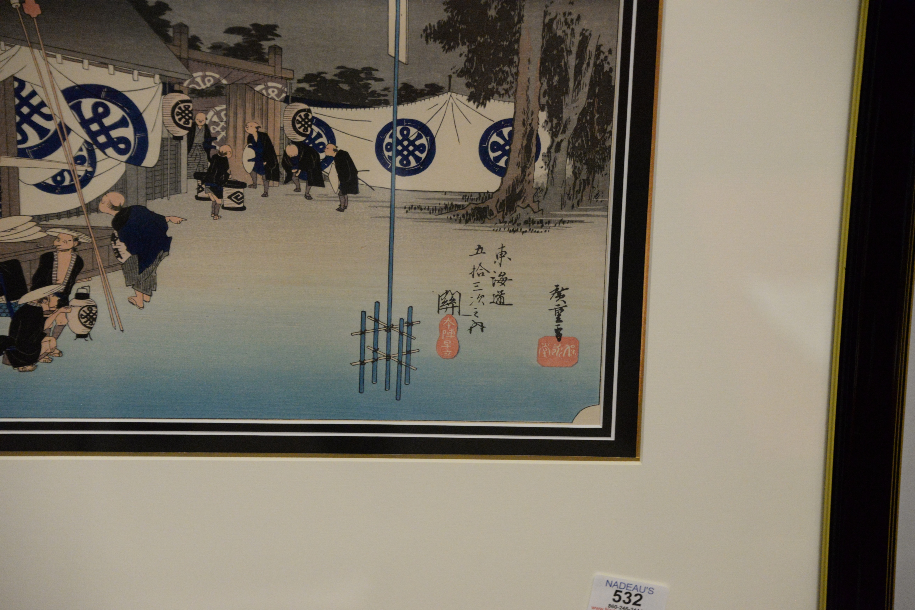 Two Japanese Woodblock Prints Tokaido Gojusan-tsugi no Uchi “Fifty-Three Stations of the Tokaido” after Hiroshige by Goyo circa 1915, station 6 and 48 each matted in contemporary frame each 9″ x 14″.