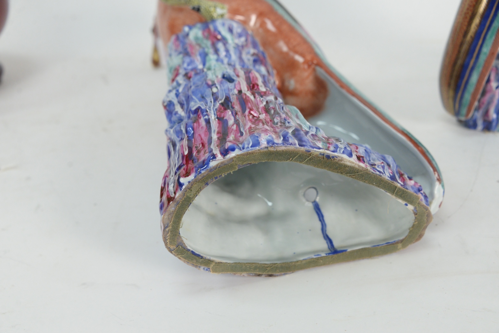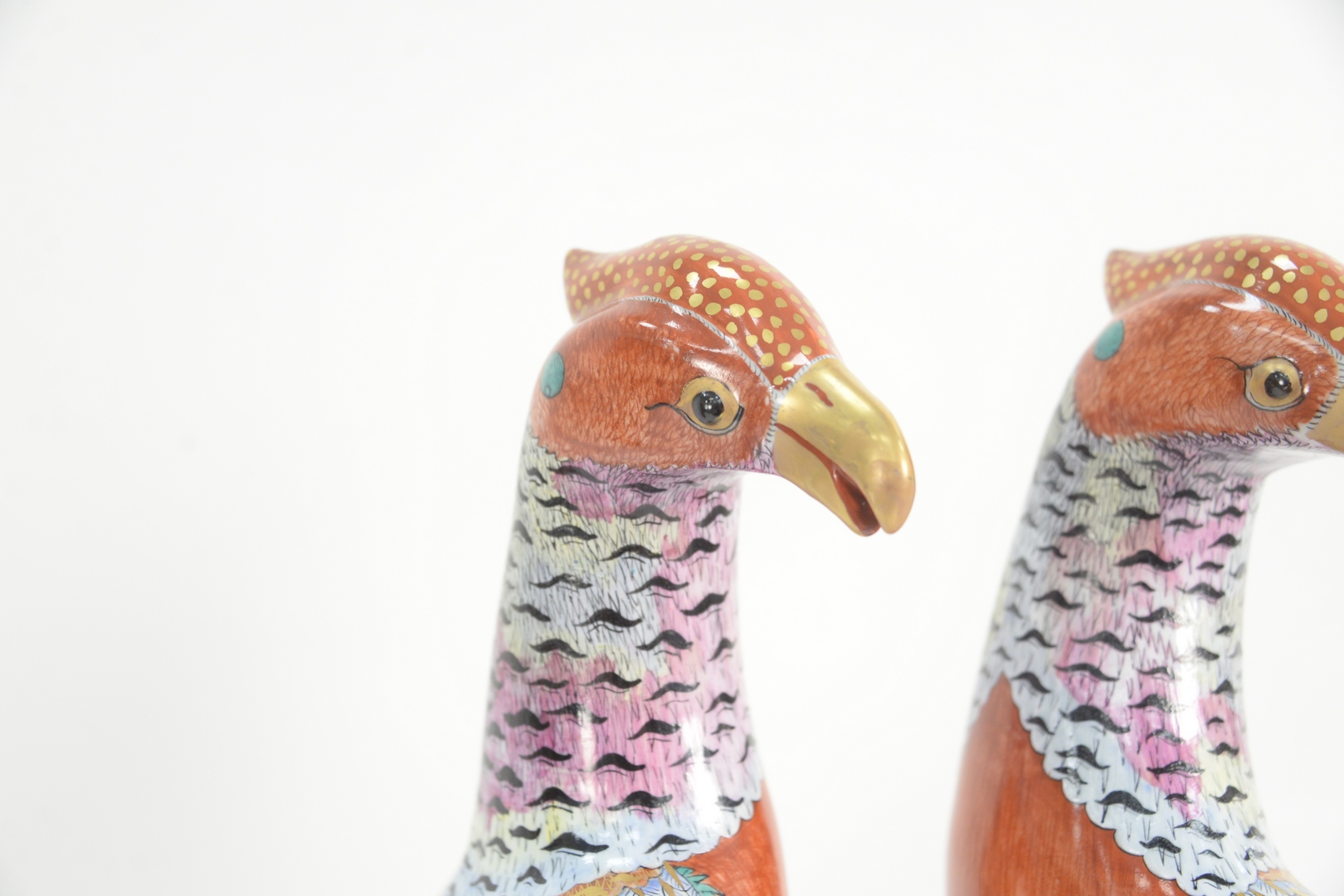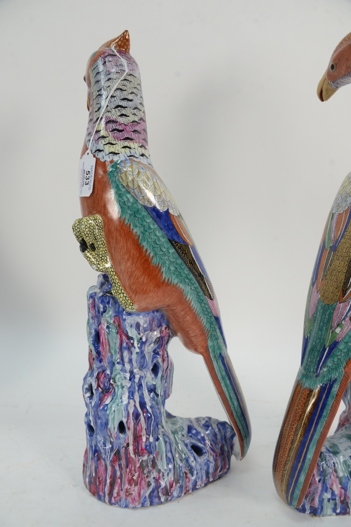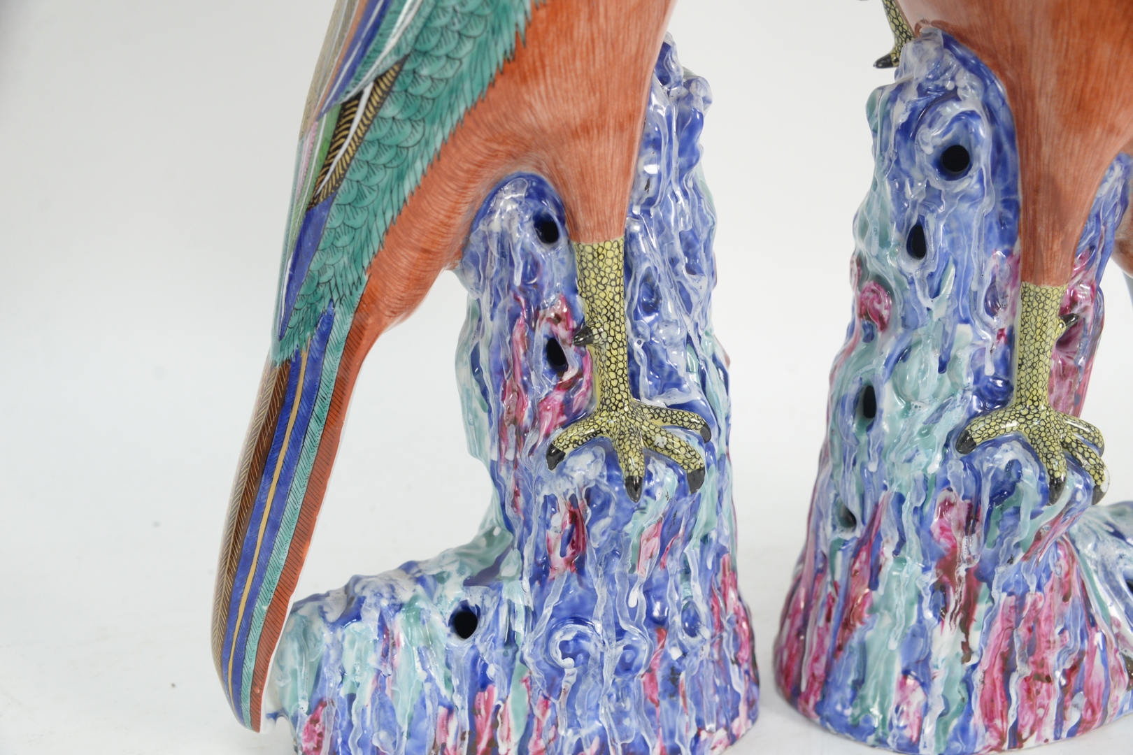 Lot 533: Pair of Contemporary Chinese Style Porcelain Birds with multicolor glaze, heights 21 1/2 inches as is with a few chips.