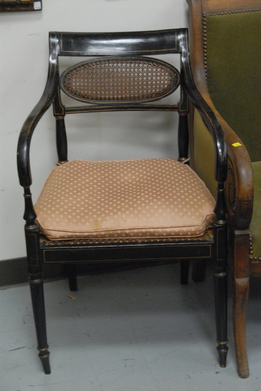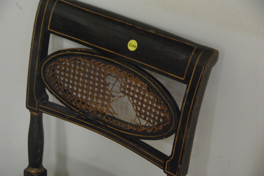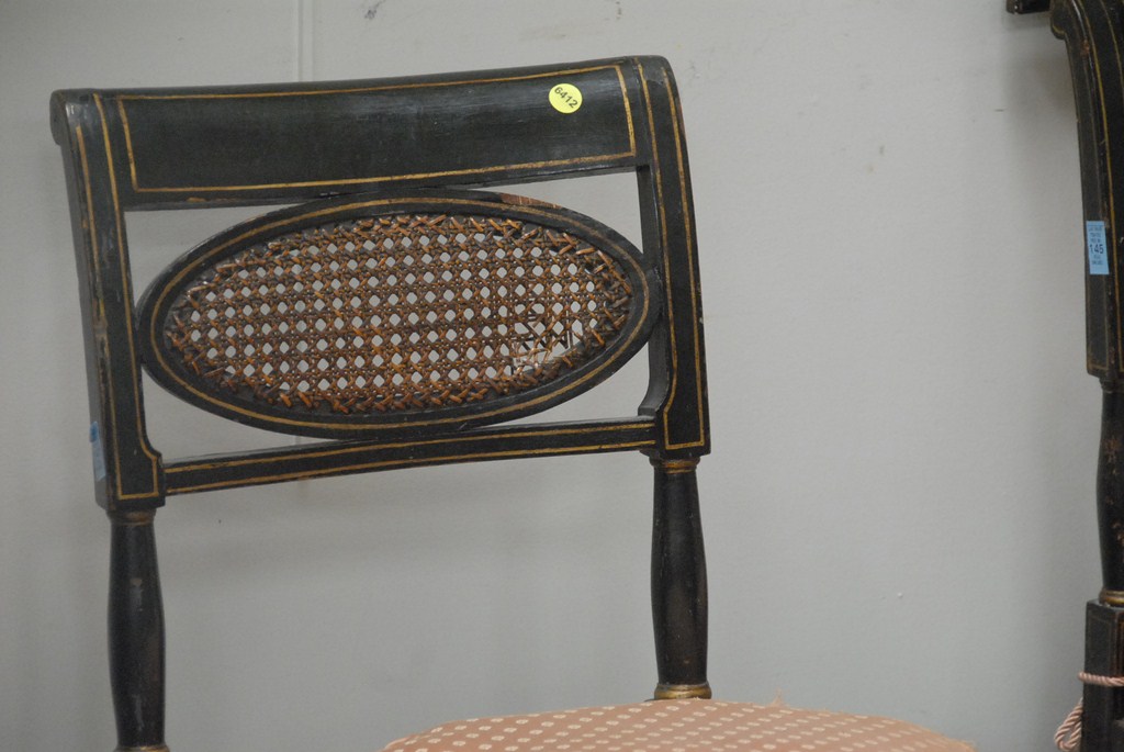 Lot 533: Set of fourteen George IV dining chairs, all in black with gold stenciling, oval backs and cane seats set on turned tapered legs so…