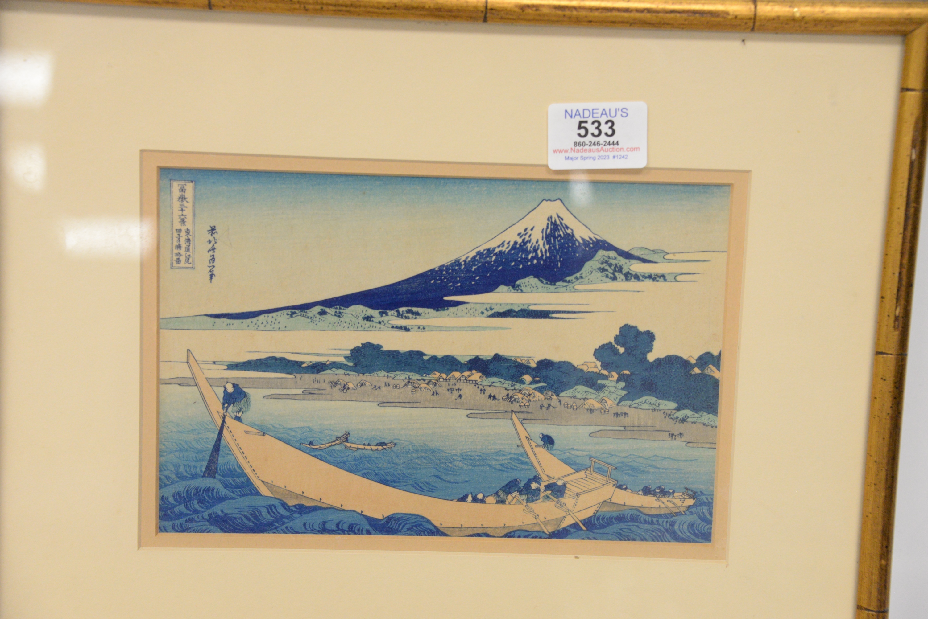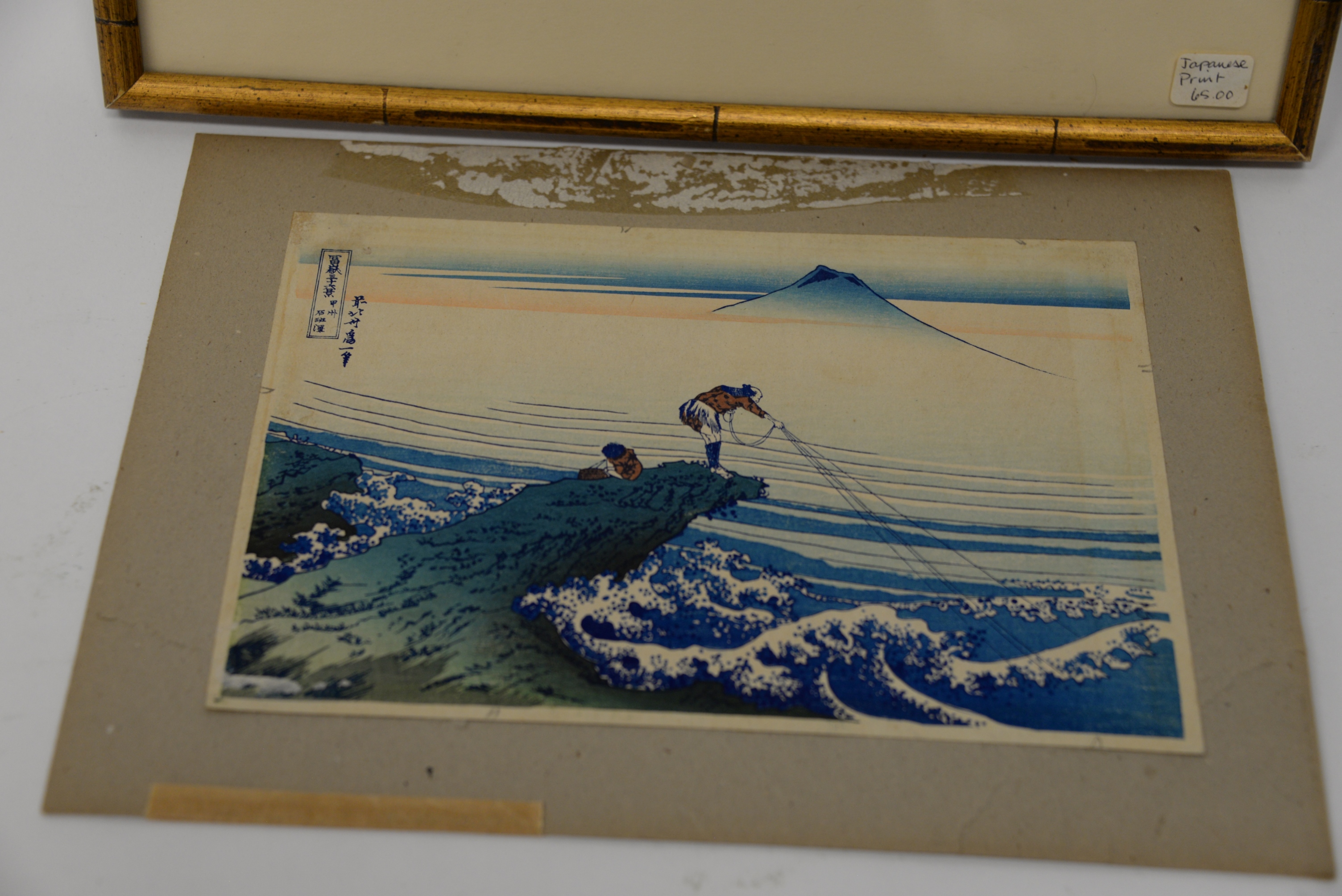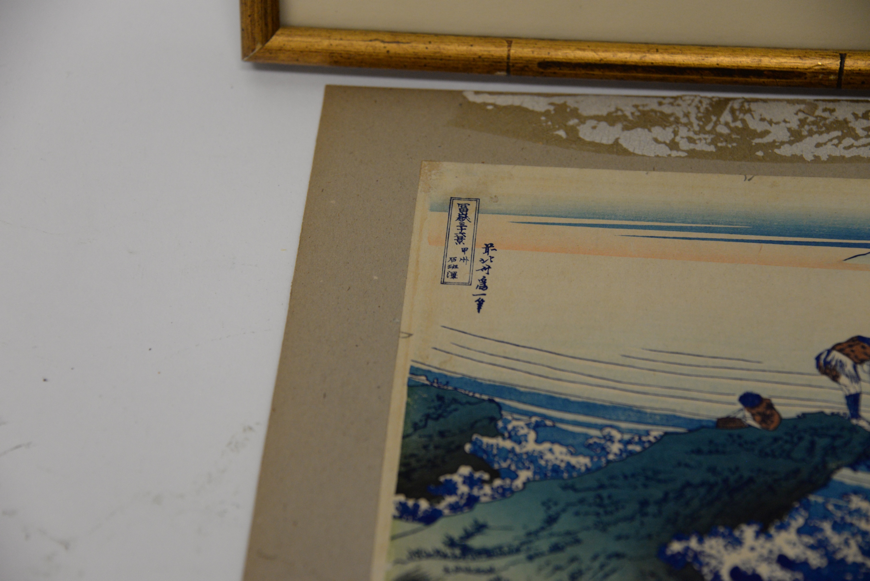Two Katsushika Hokusai (1760 – 1849), woodblock prints, “Fishing” “Shore of Tago Bay Ejiri” 7″ x 10″.