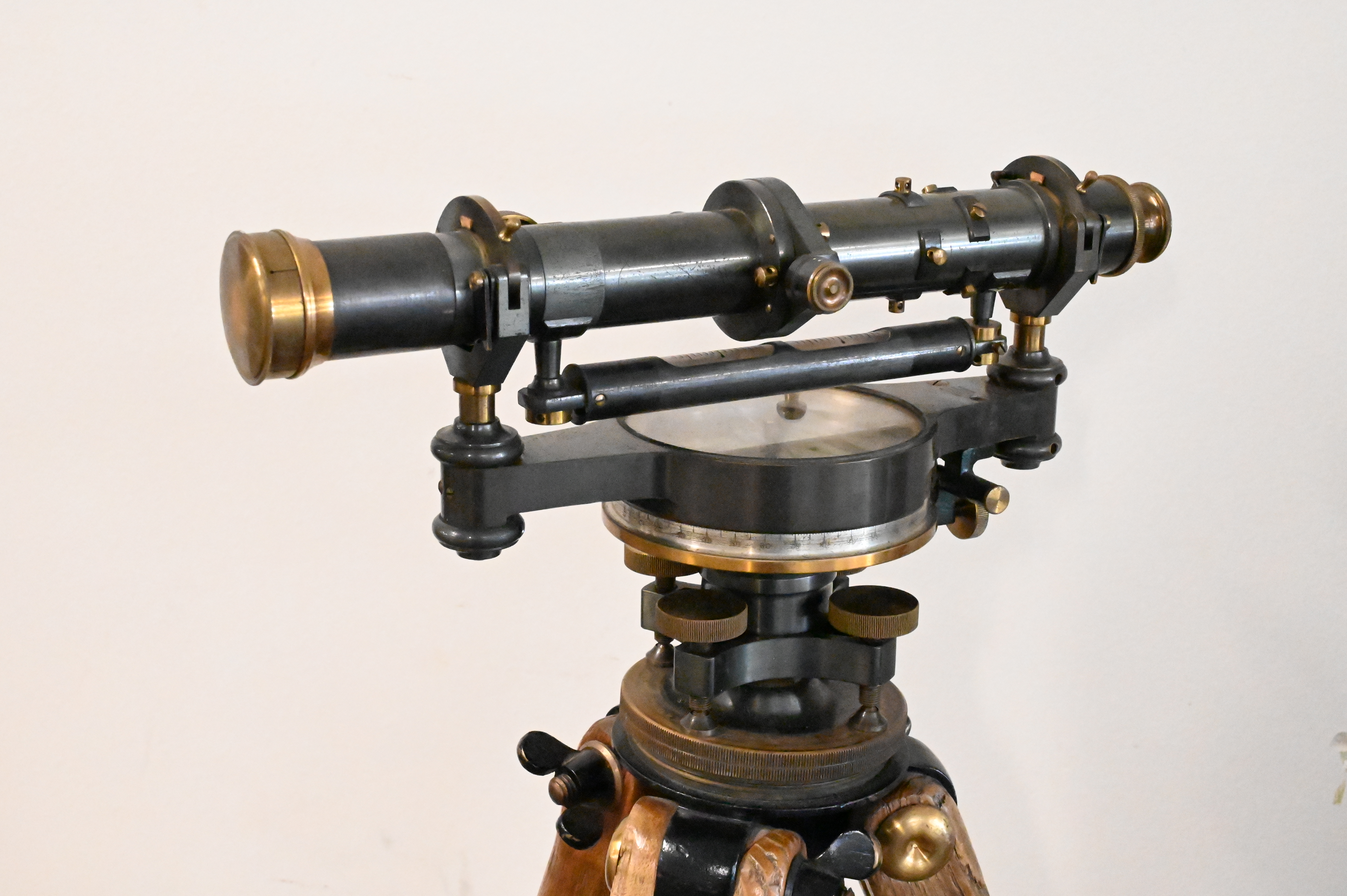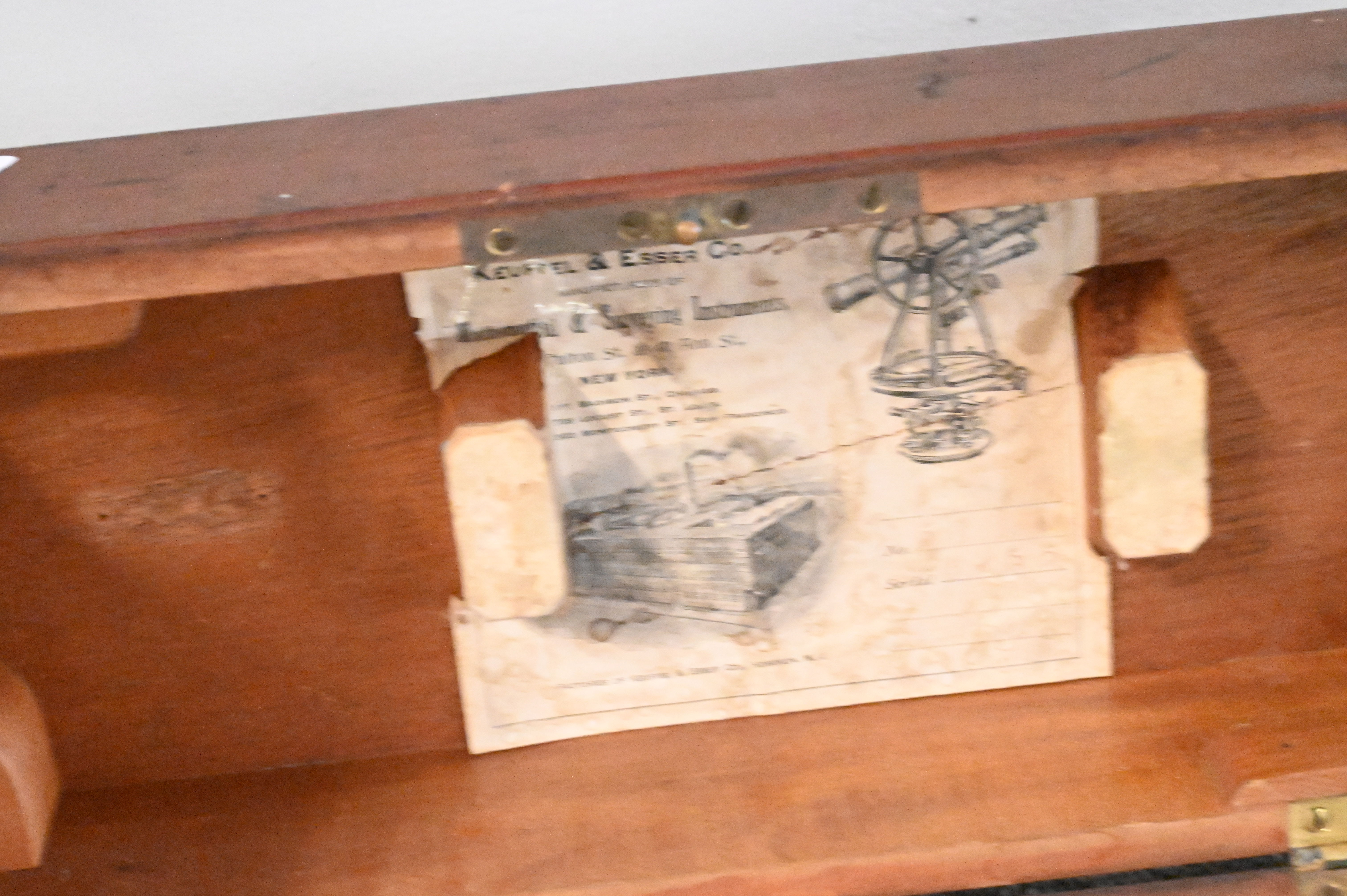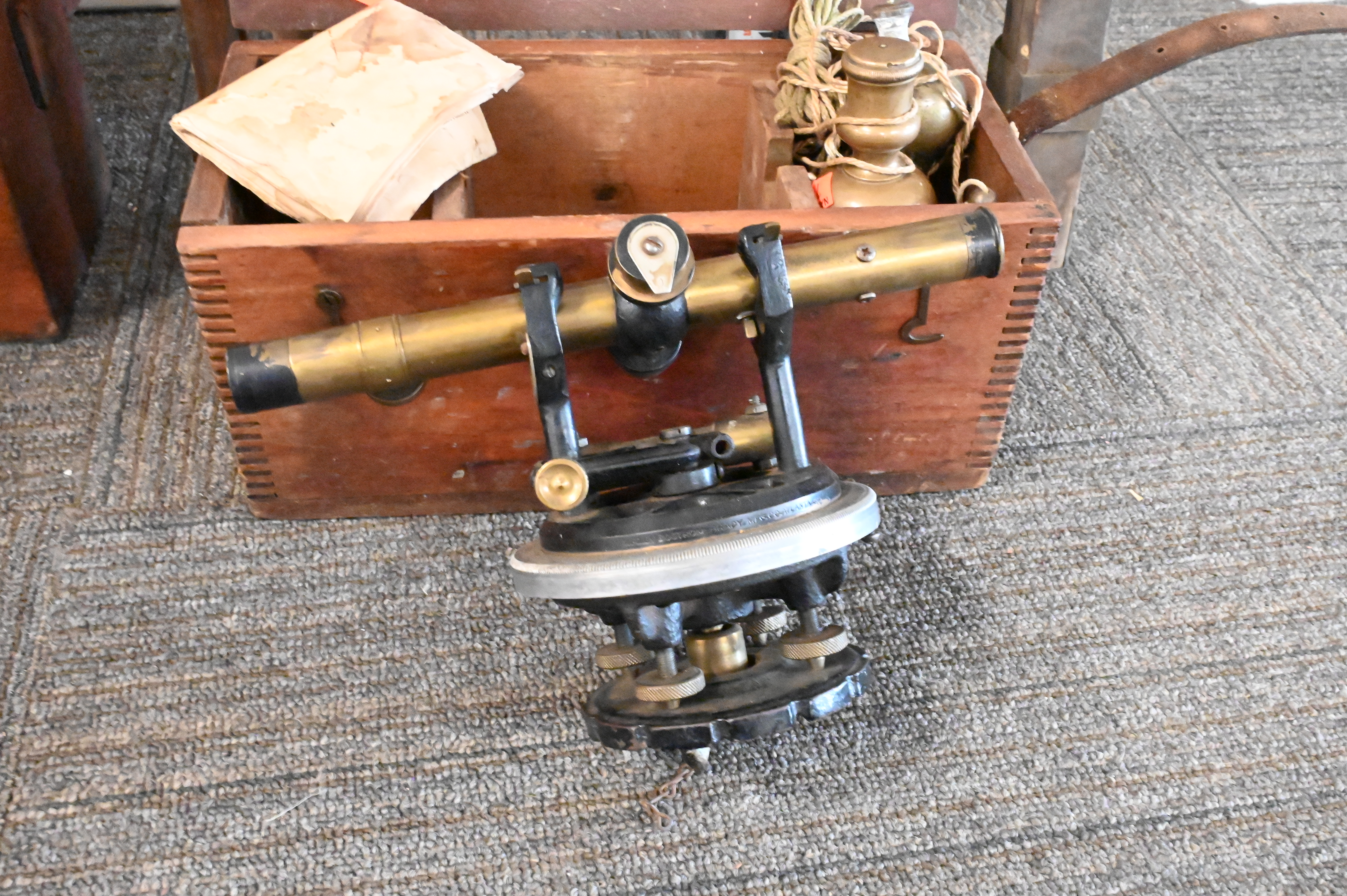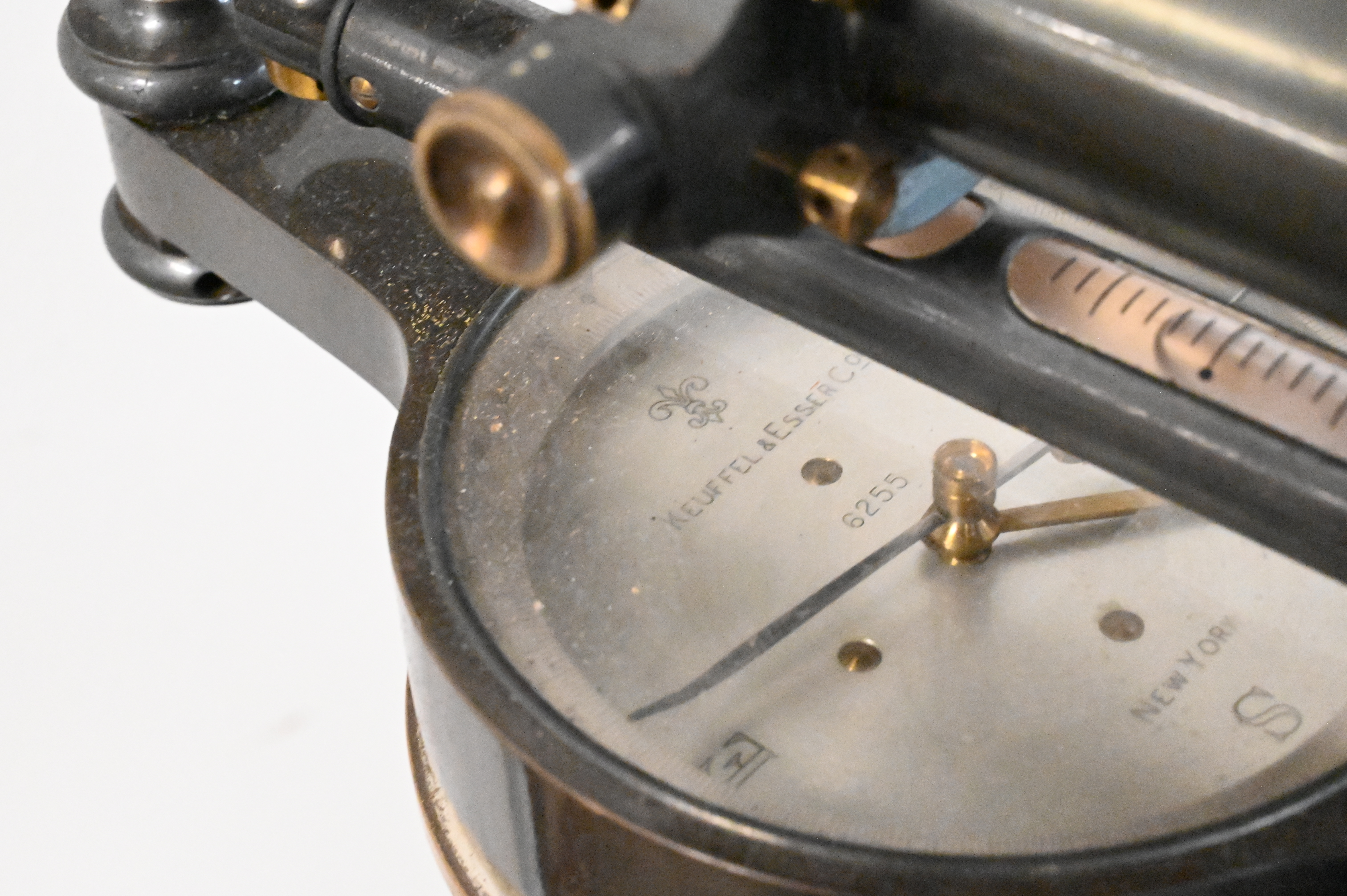 Vintage Surveying Lot, to include, two tripods, a Keuffel and Esser 6255 surveyors scope in original box, Geier and Bluhm, Troy, NY junior convertible scope circa 1900, brass surveying instrument in box c. 1898 with original manual, etc..