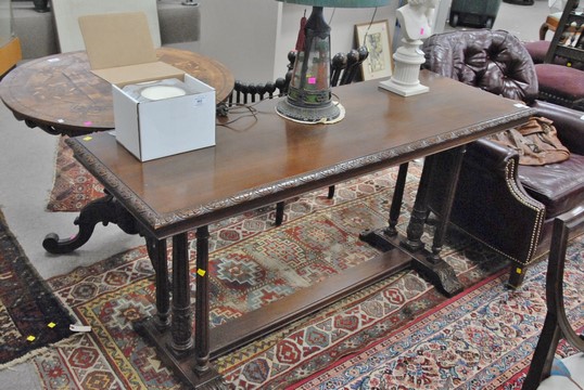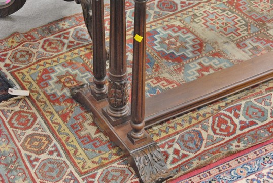 Walnut hall table signed Monage Co. Chicago. top: 21 x 59 1/2, ht. 30in.