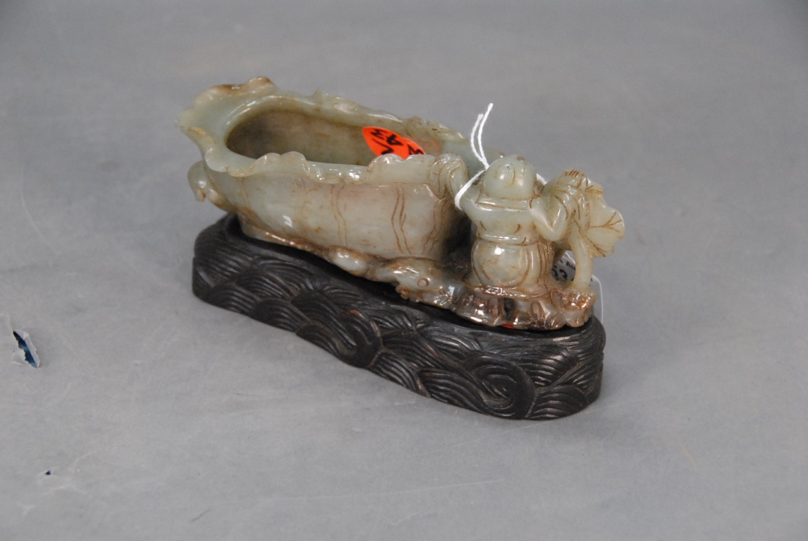 Chinese jade brush washer in the form of a lotus leaf boat and a boy on fitted wood base carved as waves, 20th century.