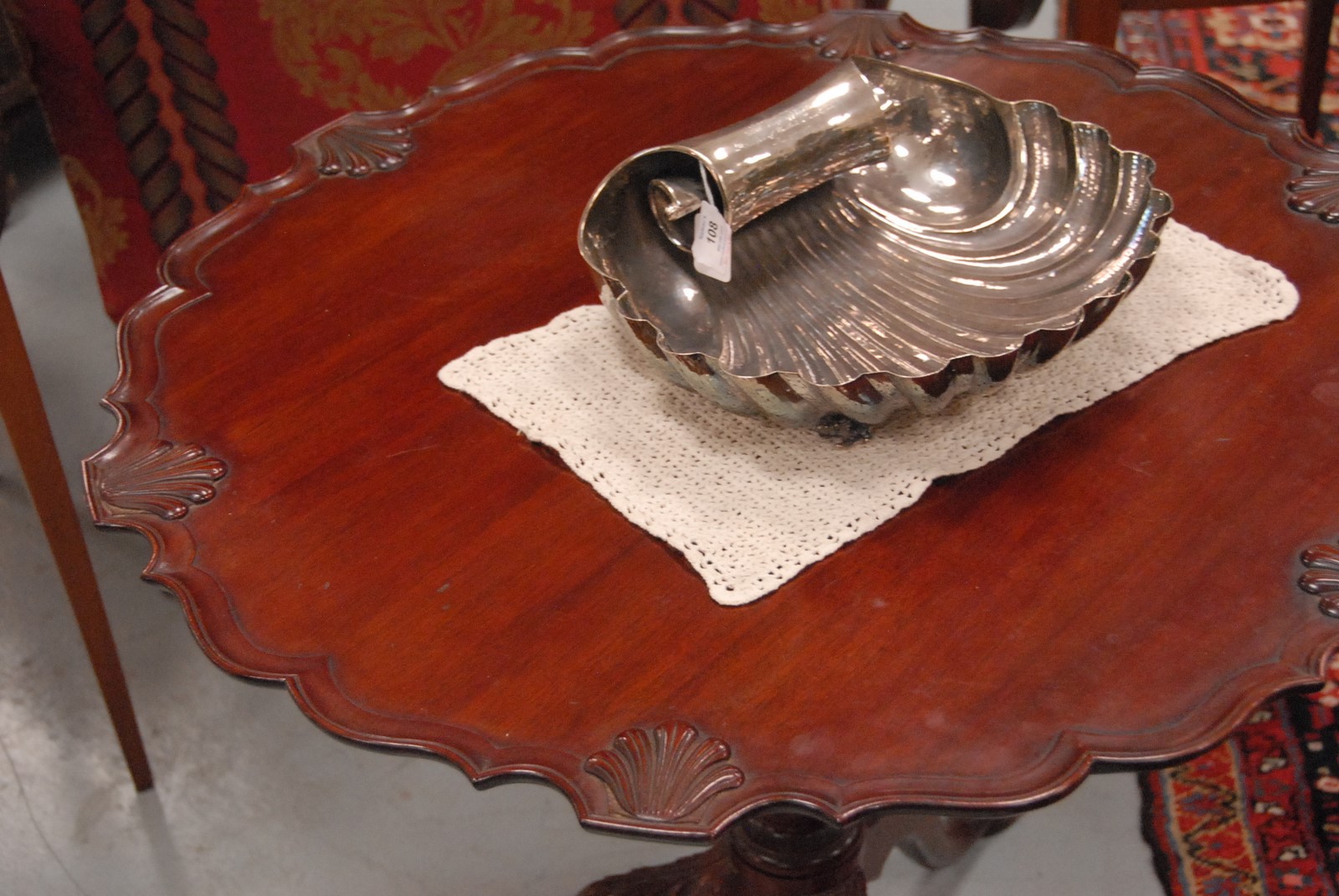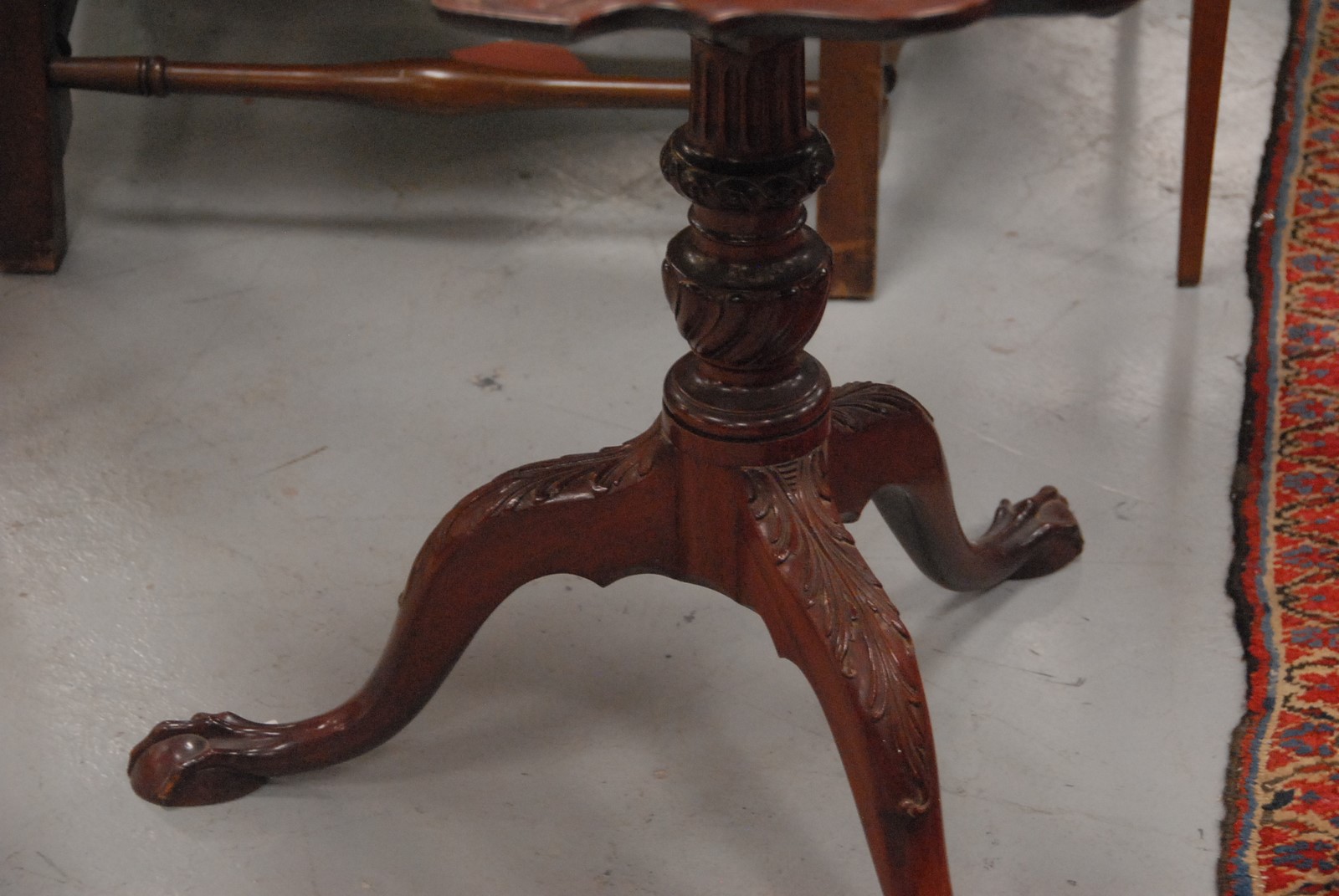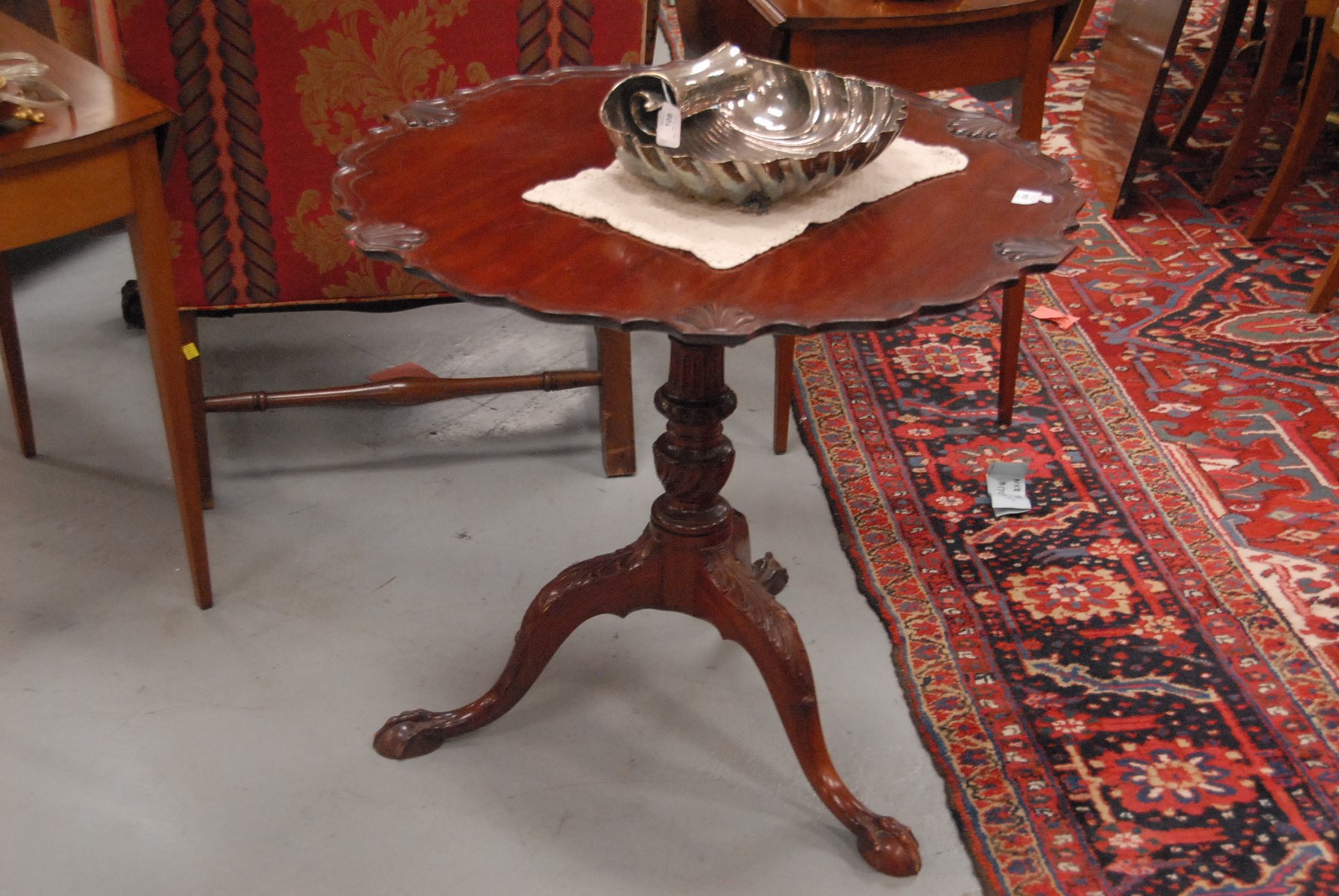 Lot 534: Custom mahogany piecrust tip top table with shell carved top on birdcage with carved shaft set on tripod base with ball and claw feet. ht 28 in 32 in.