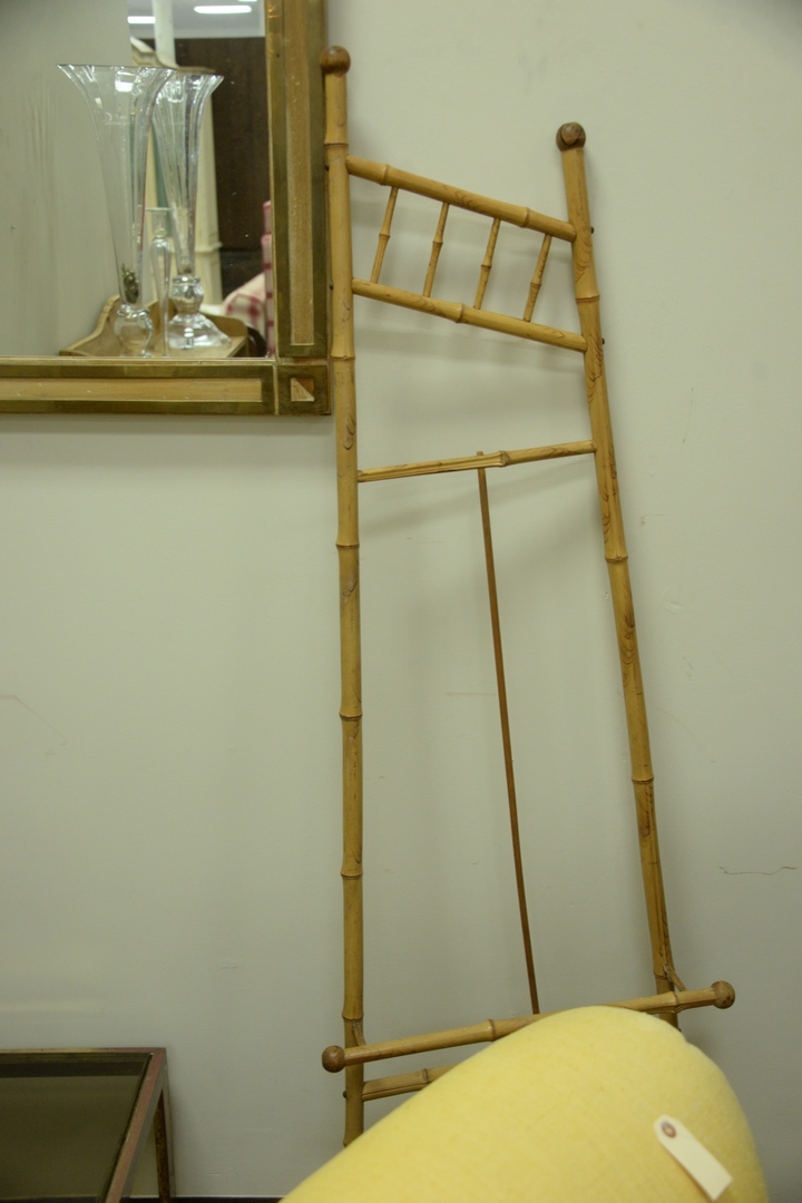 Eight Piece Lot, to include pine bookcase, height 48 inches oak pedestal glass top coffee table bamboo easel a brass mirror, along with pair of tall glass vases one with large chip and one blown candlestick.