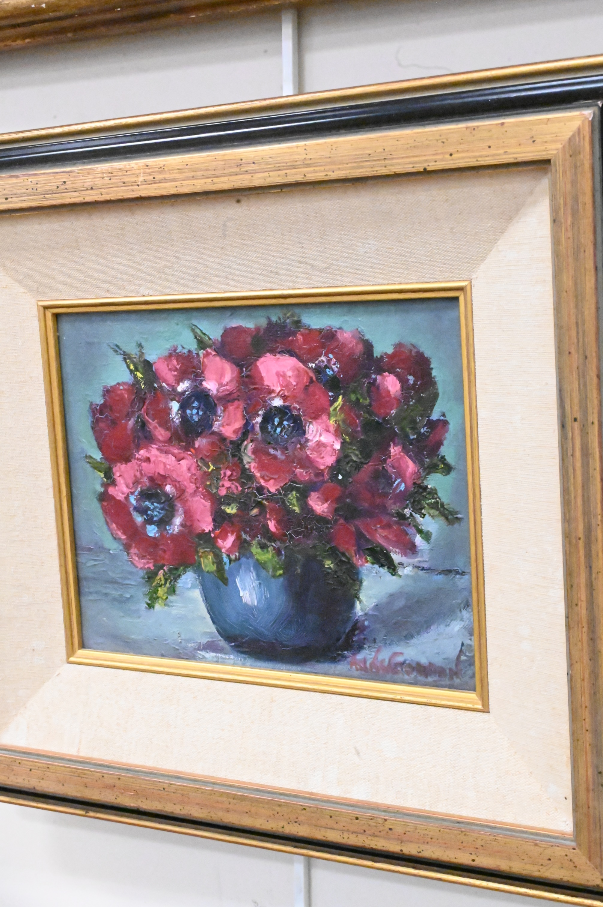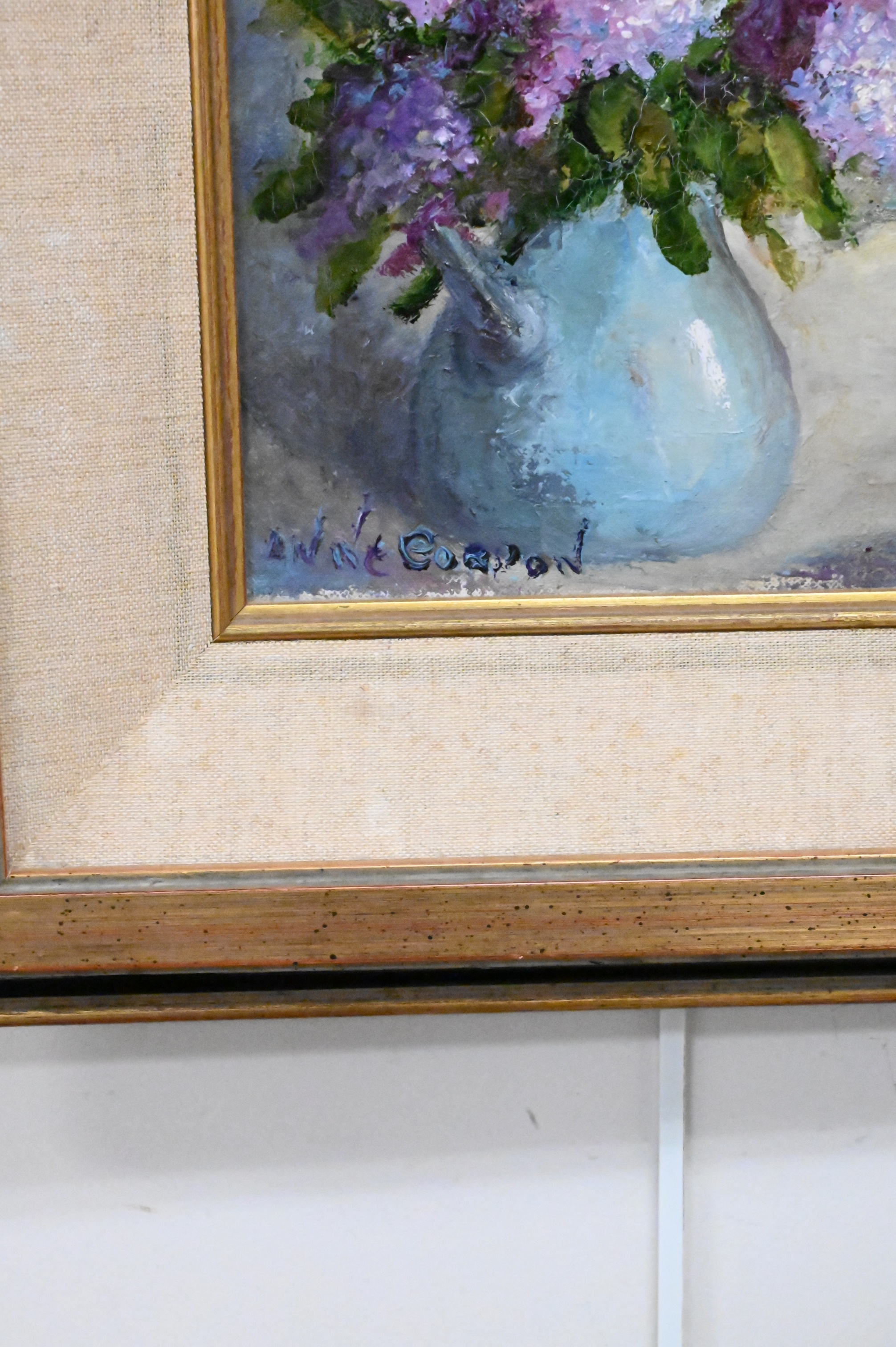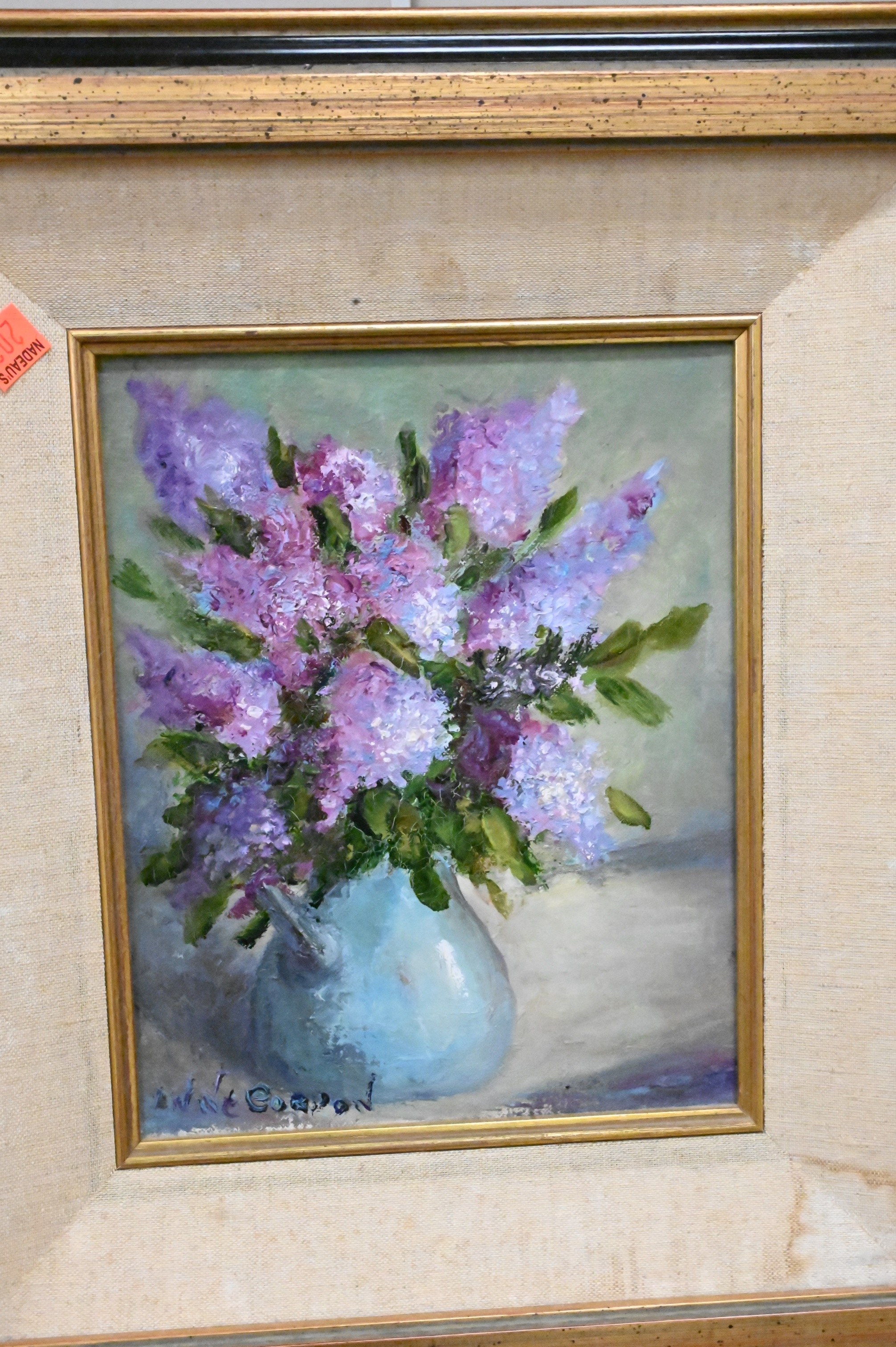 Four Still Life of Flowers Oil on Canvas, two in matching frames, signed illegibly lower right “Colley 1946″, 22″ x 18”, along with a smaller pair of still lifes, signed lower right “Anne Gordon?”, 10″ x 8″.