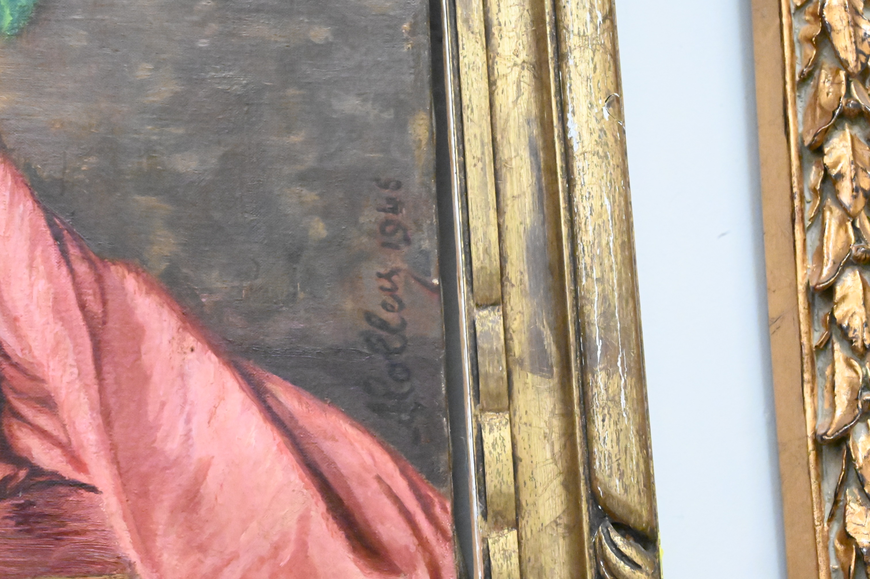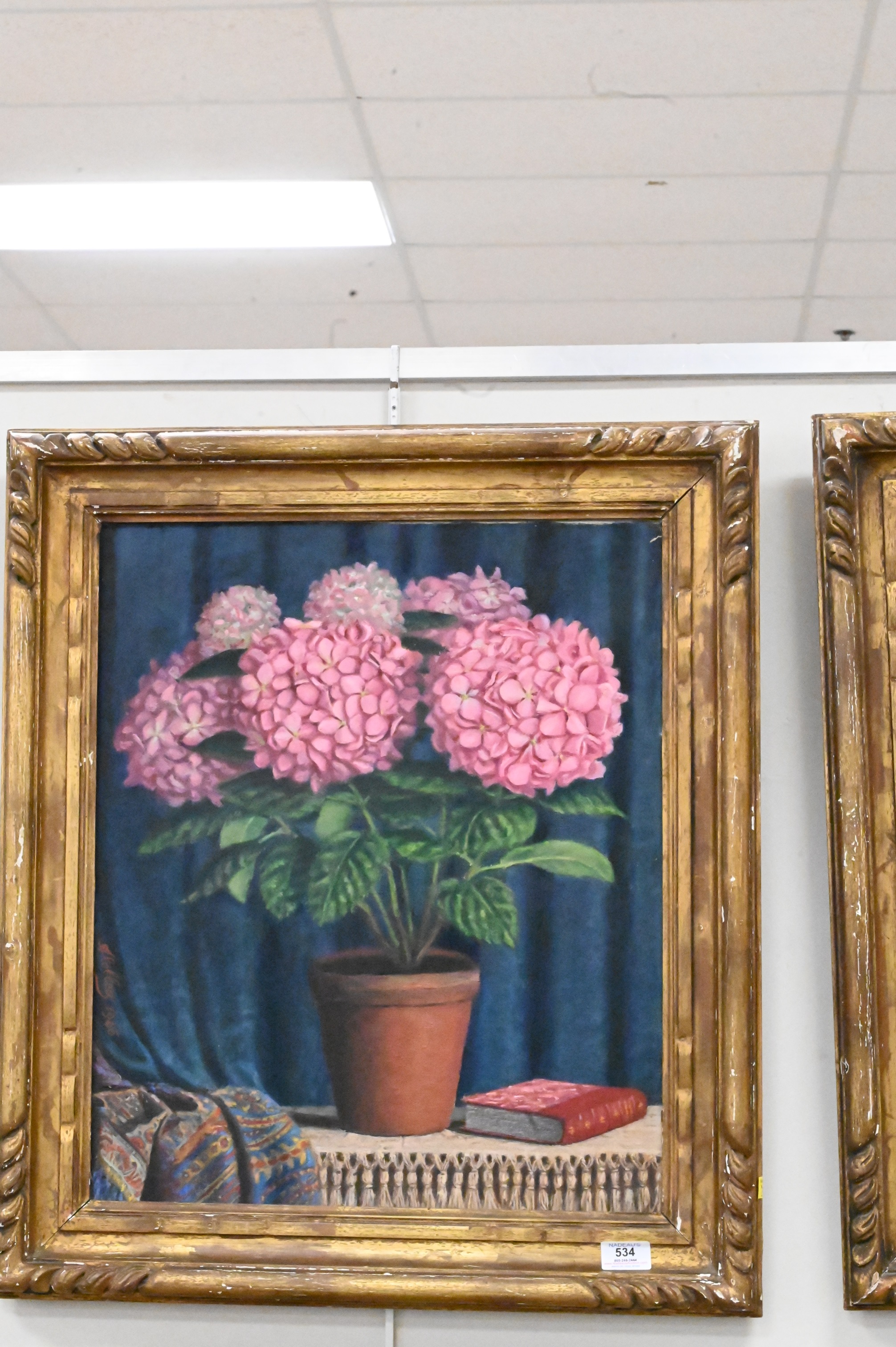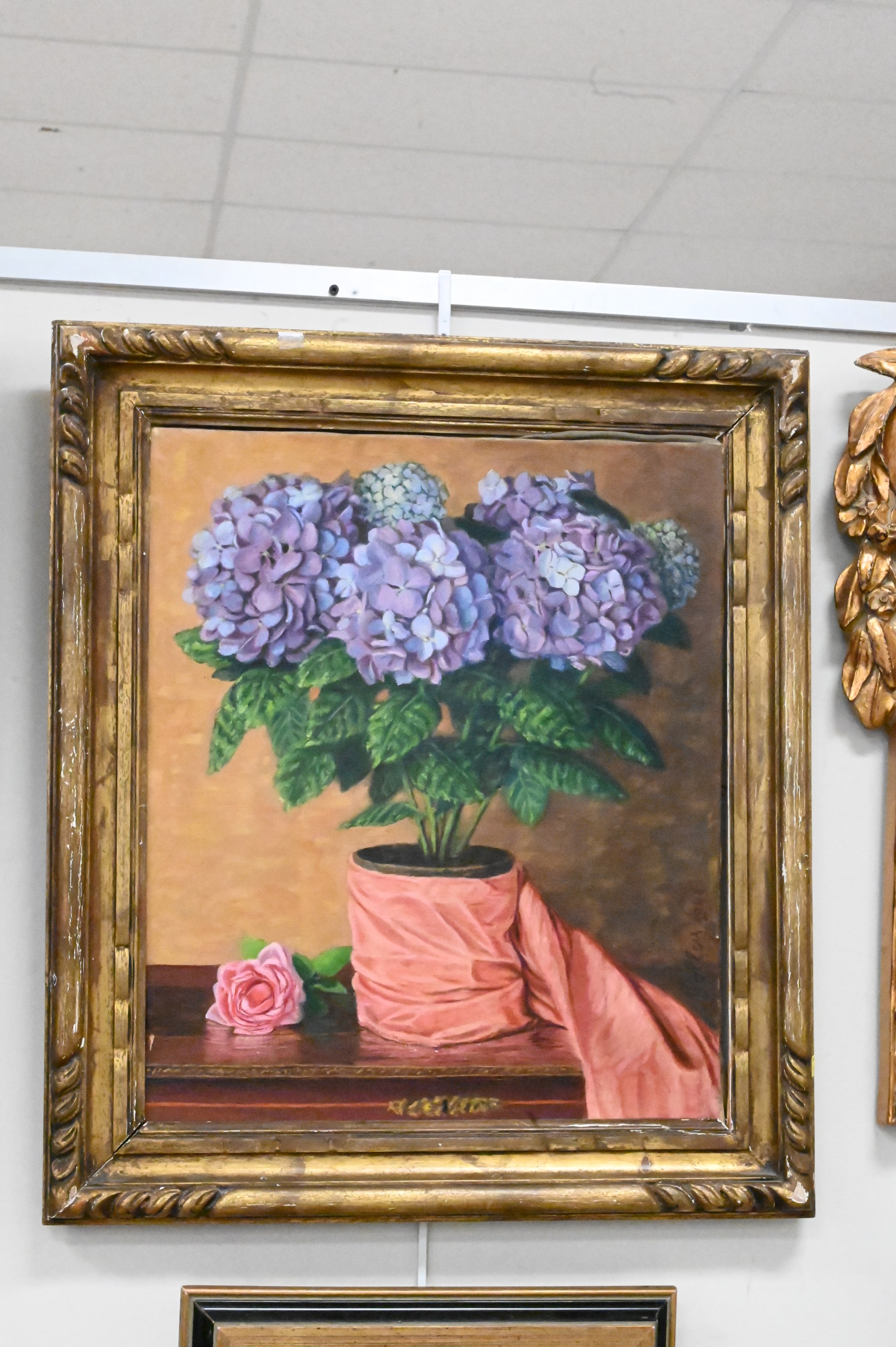 Four Still Life of Flowers Oil on Canvas, two in matching frames, signed illegibly lower right “Colley 1946″, 22″ x 18”, along with a smaller pair of still lifes, signed lower right “Anne Gordon?”, 10″ x 8″.