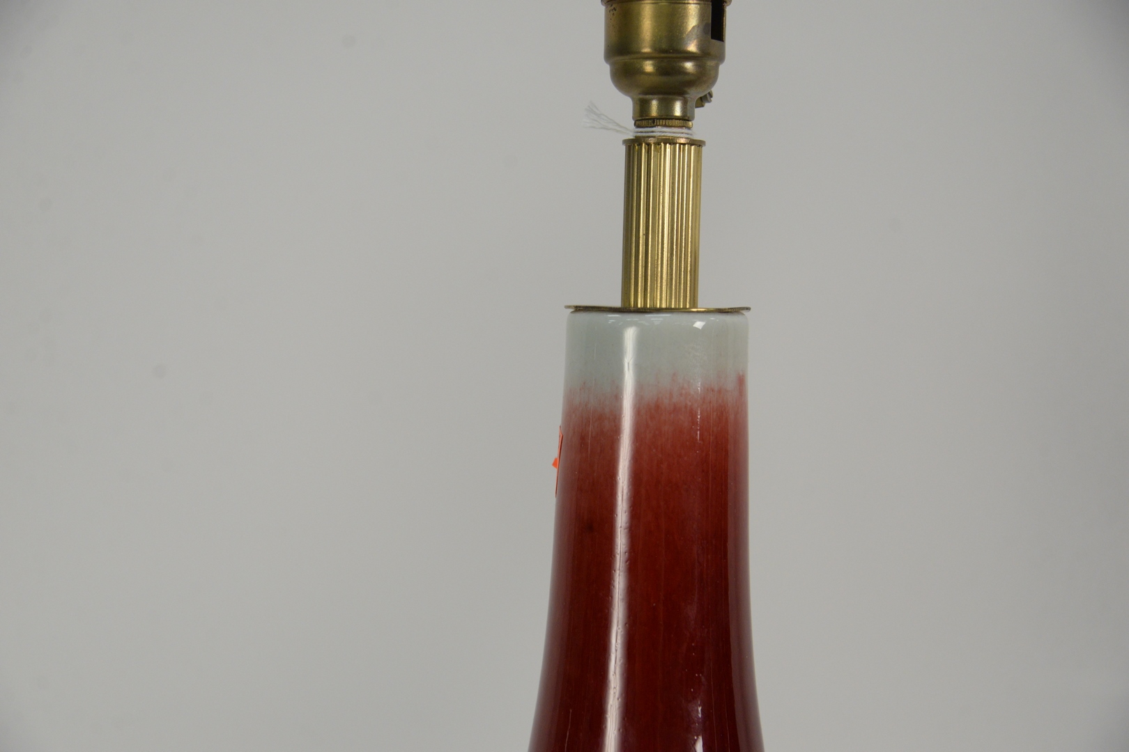 Lot 534: Pair of Oxblood Vases on black wood bases drilled into table lamps, height 20 inches. Provenance: Collection from Mr. and Mrs. Fowler, West Hartford, Connecticut.