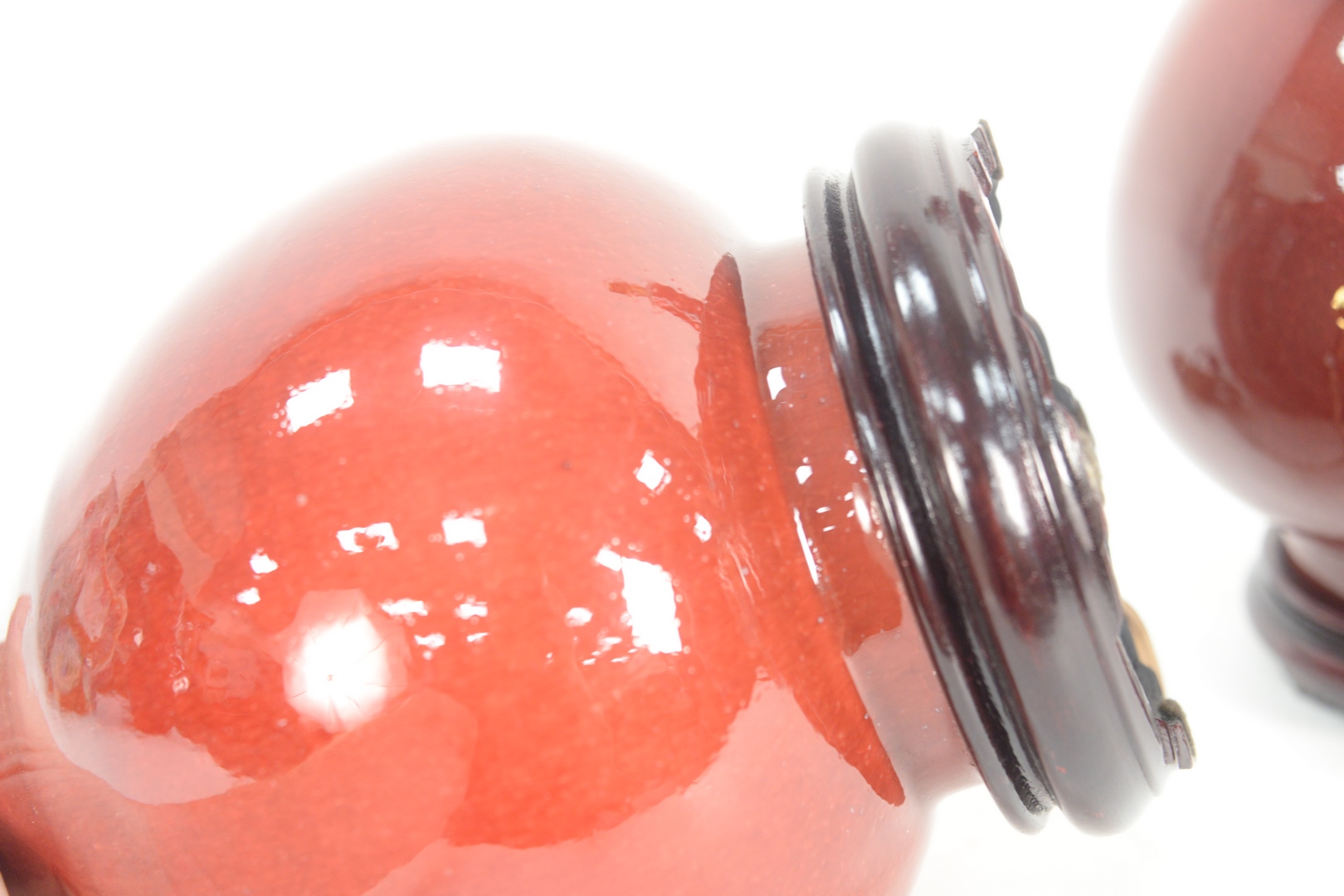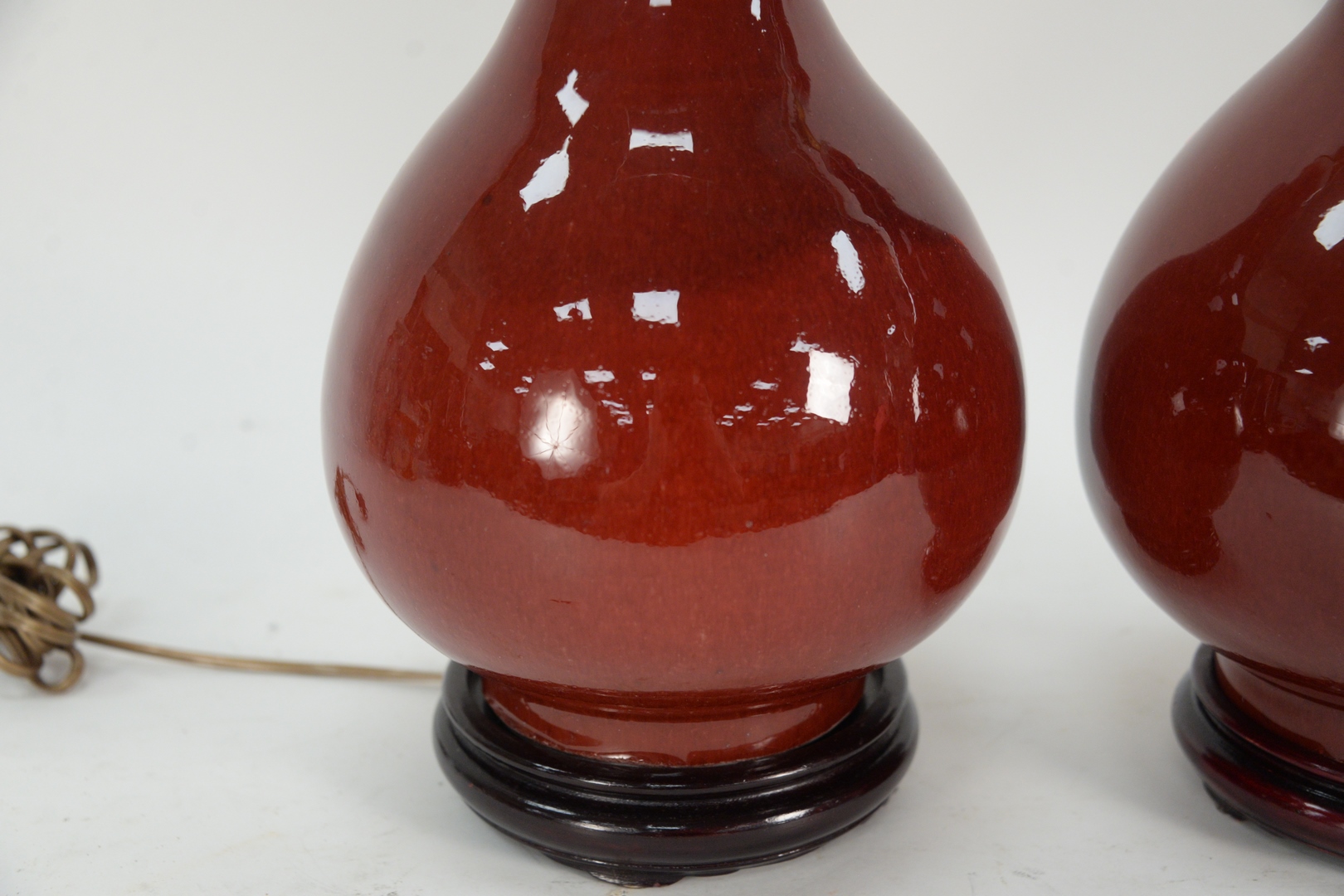 Pair of Oxblood Vases on black wood bases drilled into table lamps, height 20 inches. Provenance: Collection from Mr. and Mrs. Fowler, West Hartford, Connecticut.