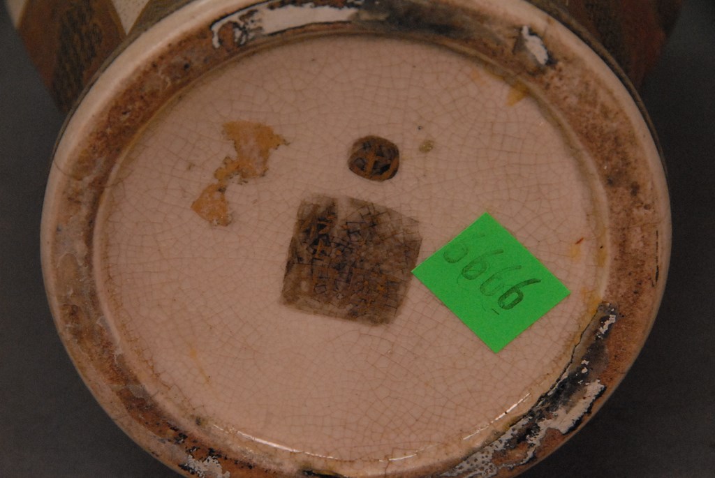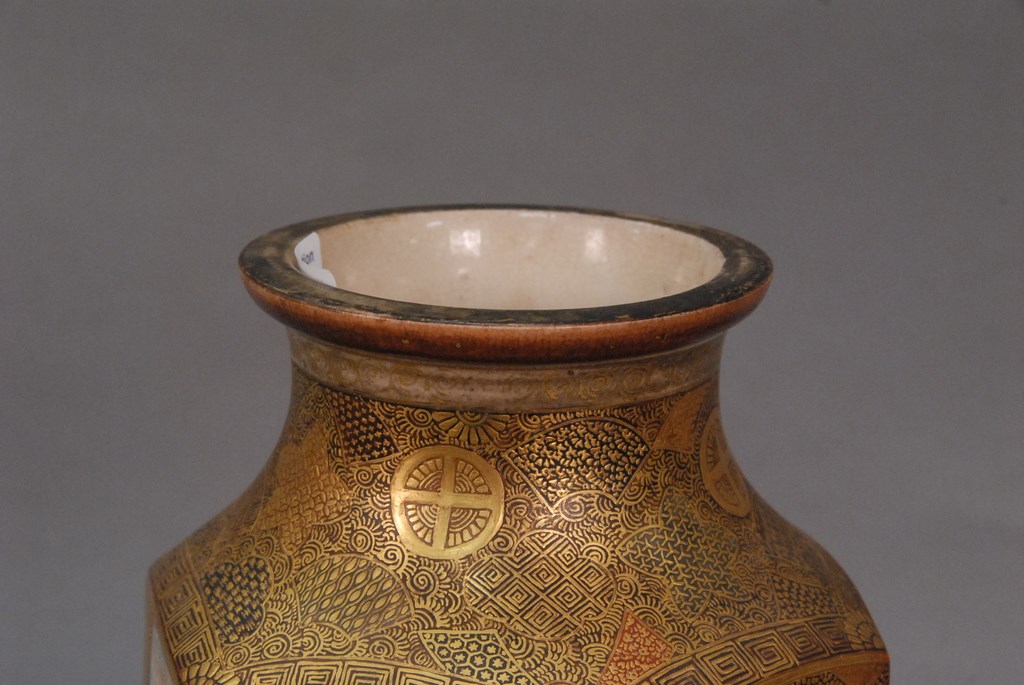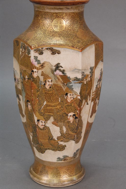Lot 534: Satsuma vase, six sided, gold relief decorated, one side with warriors, one side with Geisha, signed on bottom. ht. 12in.