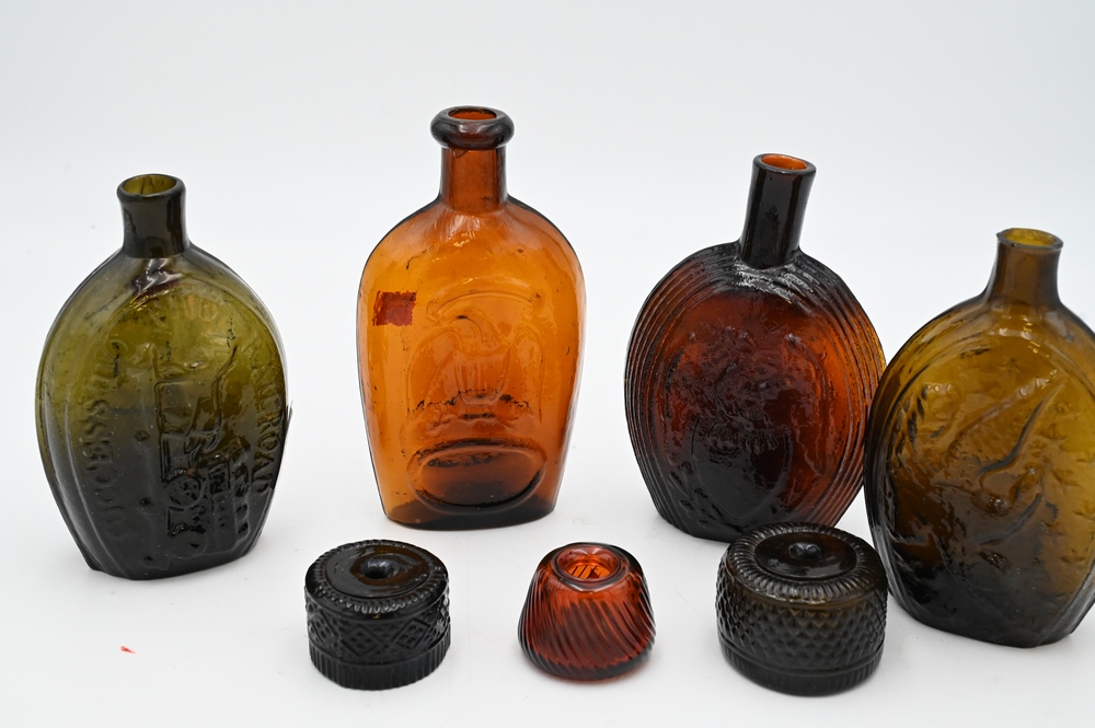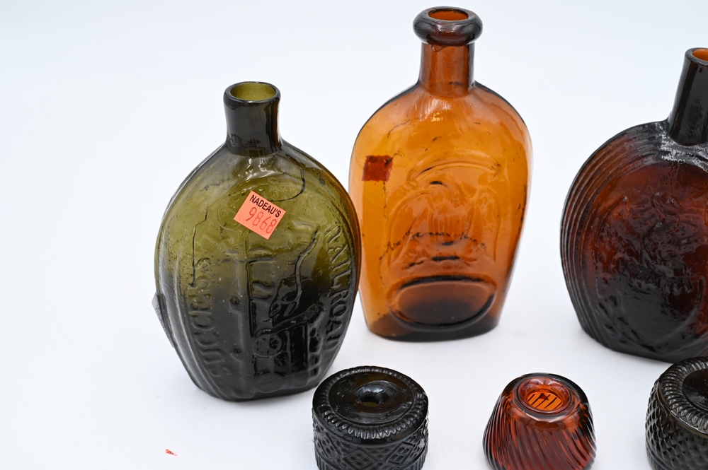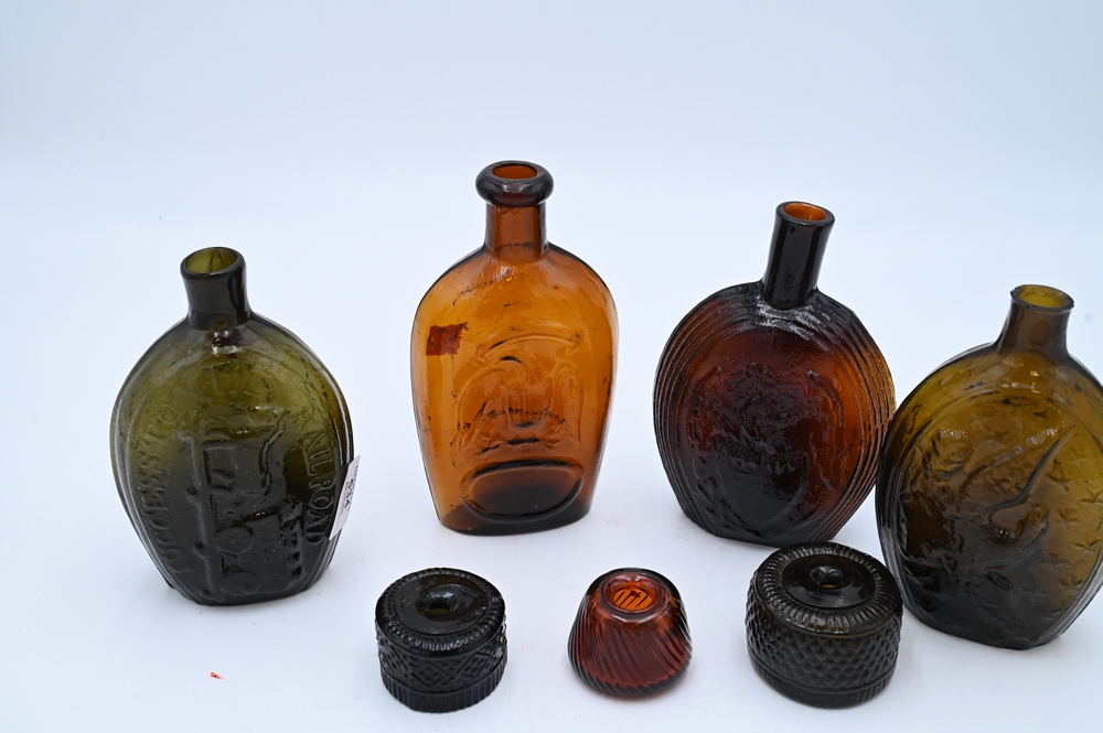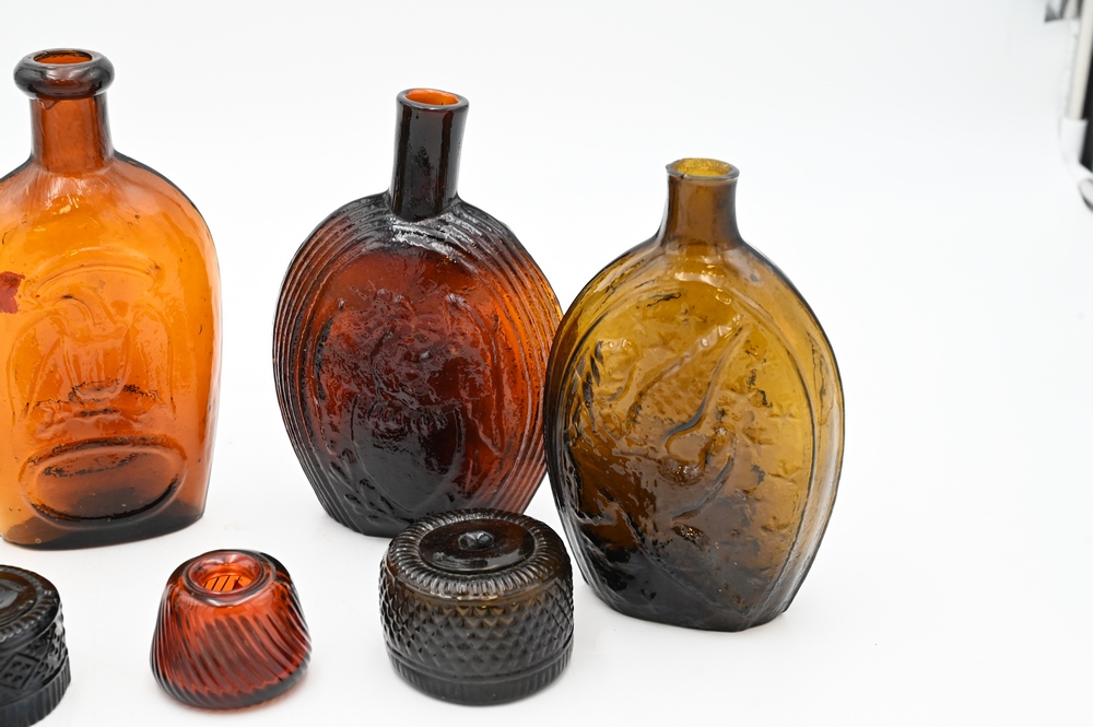 Lot 534: Seven Blown Glass Items, to include three inkwells, two flasks, a flask with an eagle on a shield on one side and a flag on the opposite side, along with a flask with an eagle on each side, some old, some newer, tallest 7 1/2 inches. Provenance: Estate of Bruce Sasalla, East Hartford, Connecticut.