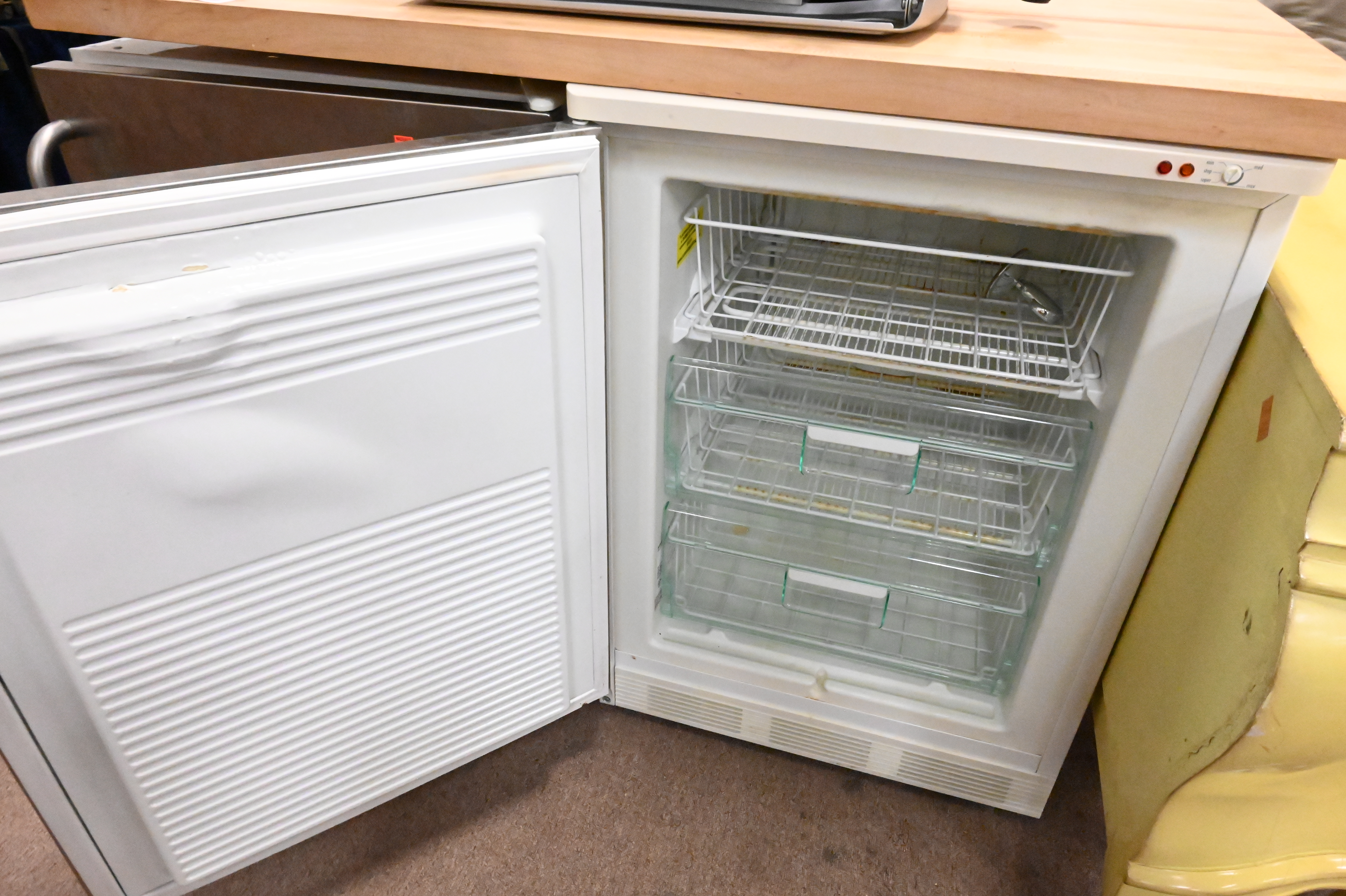 Two Piece Lot, to include, stainless under the counter refrigerator/freezer, fitted with a butcher block top