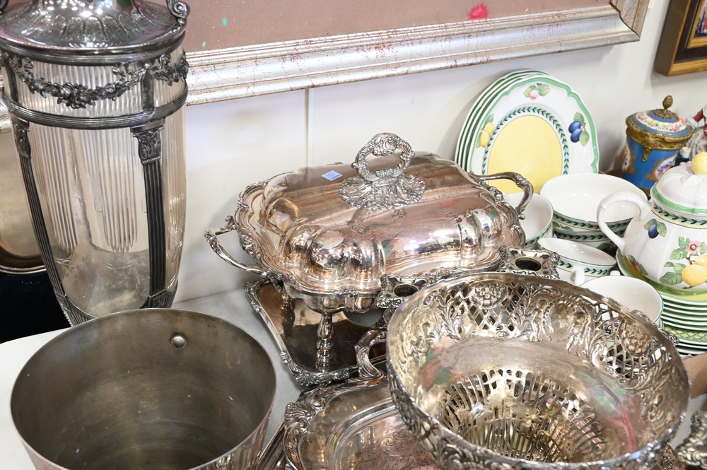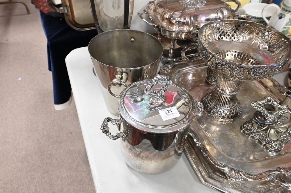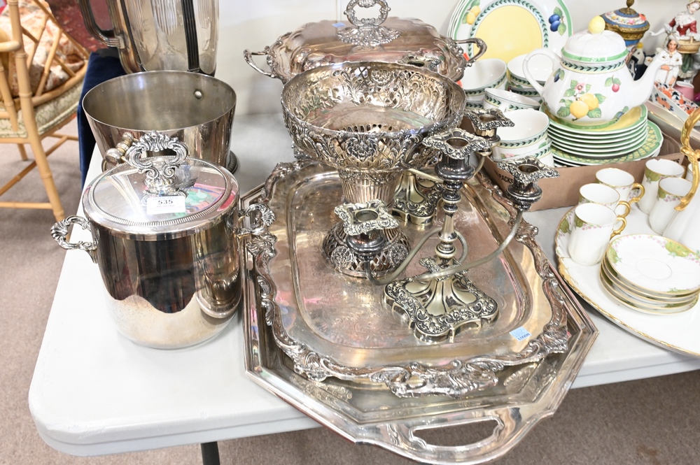 Lot 535: Assorted Silver Plate Group, to include ice buckets, trays, tureens, vase, etc.