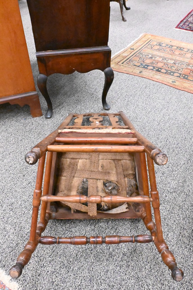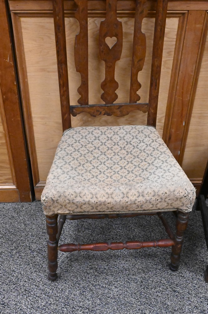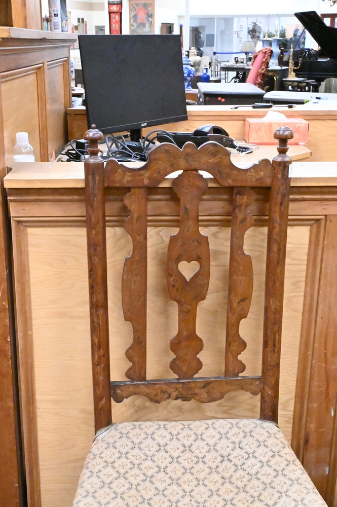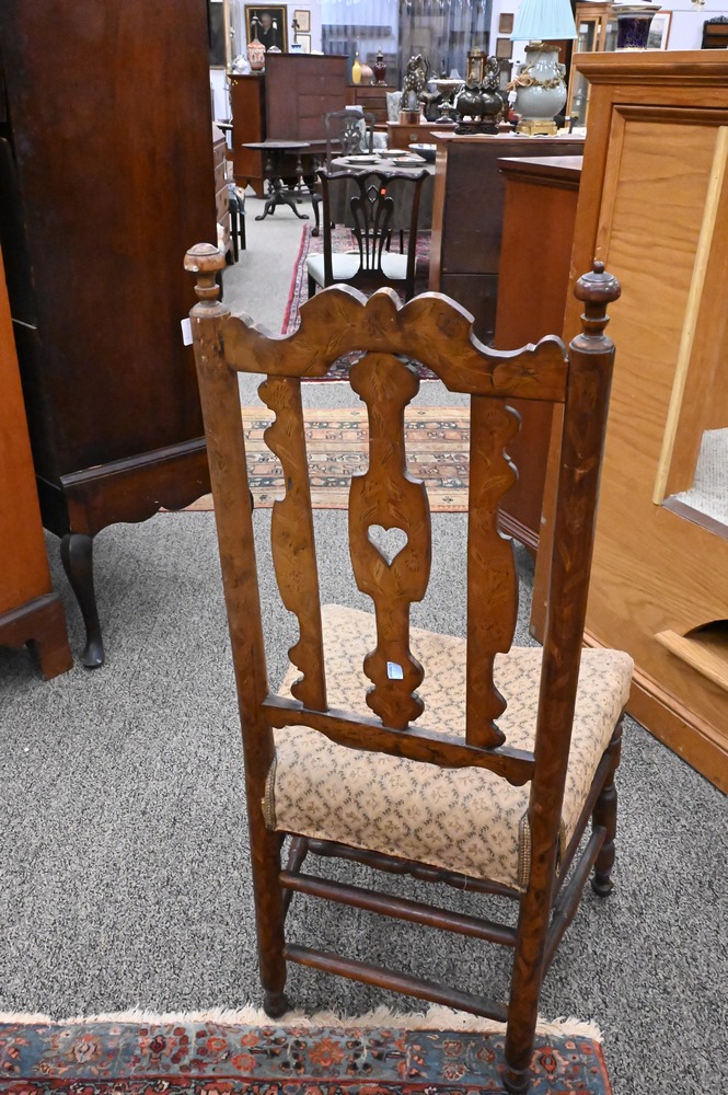 Lot 535: Continental Marquetry Inlaid Side Chair, having heart cutout, upholstered seat having fur/hair interior, on turned legs, 18th century, height 44 1/2 inches, seat height 19 inches. Provenance: An estate from Redding, CT.
