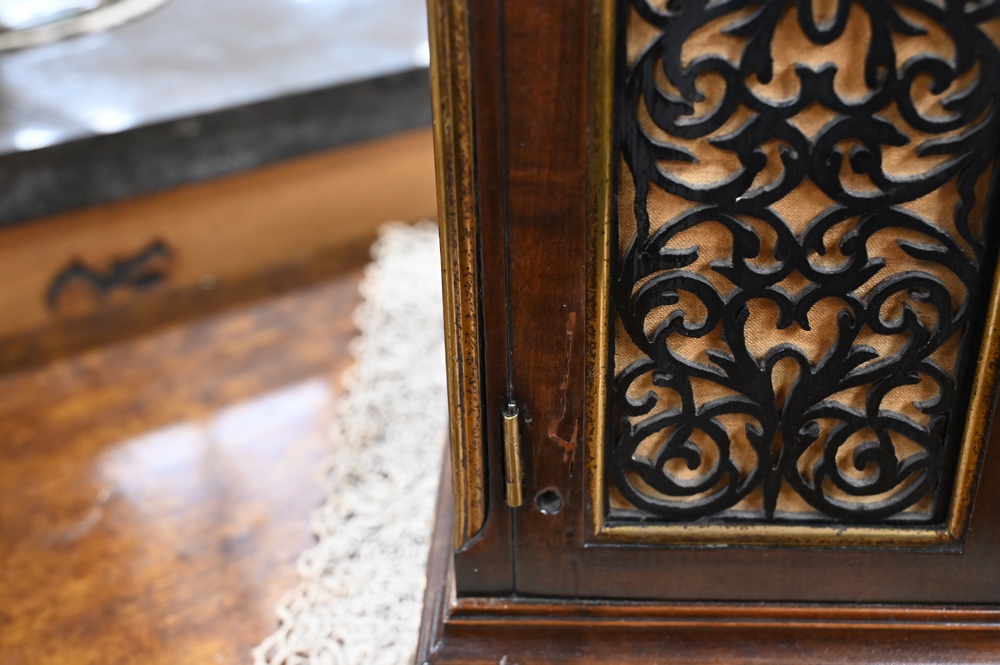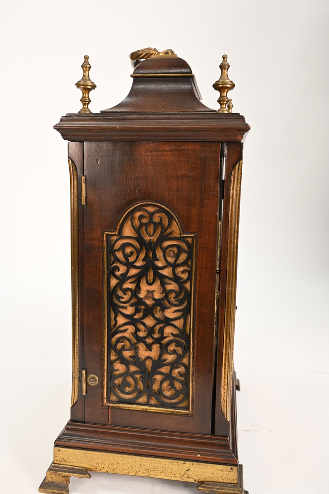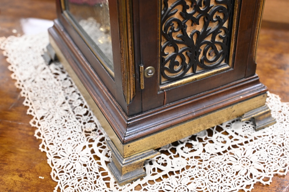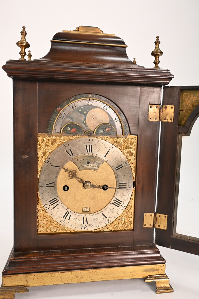 Dutch Walnut Repeating Alarm Chime Clock, dial marked J.P. Kroese & Zoon, Amsterdam, mid 18th century, having brass dial with pierced foliate spandrels, engraved silvered chapter ring, silvered alarm disc, apertures for date and moonphase in arch, Fuseo movement with foliate engraved and signed backplate, walnut case with finials, blind carved fretwork, glazed front and back doors, on bracket feet, along with fitted carrying case, clock height 15 1/2 inches.Provenance: Collection of Anton Peek previously from the Hague.