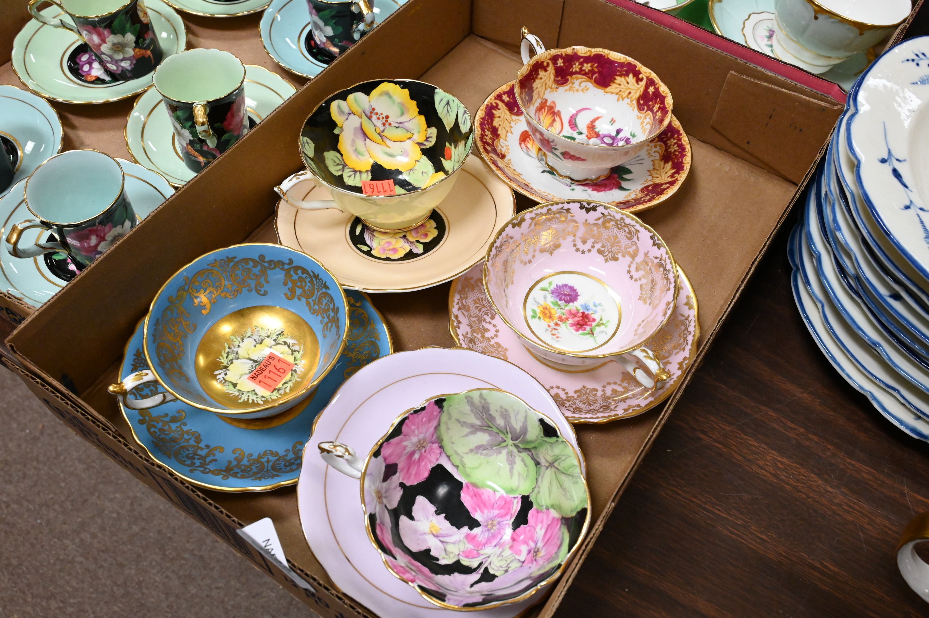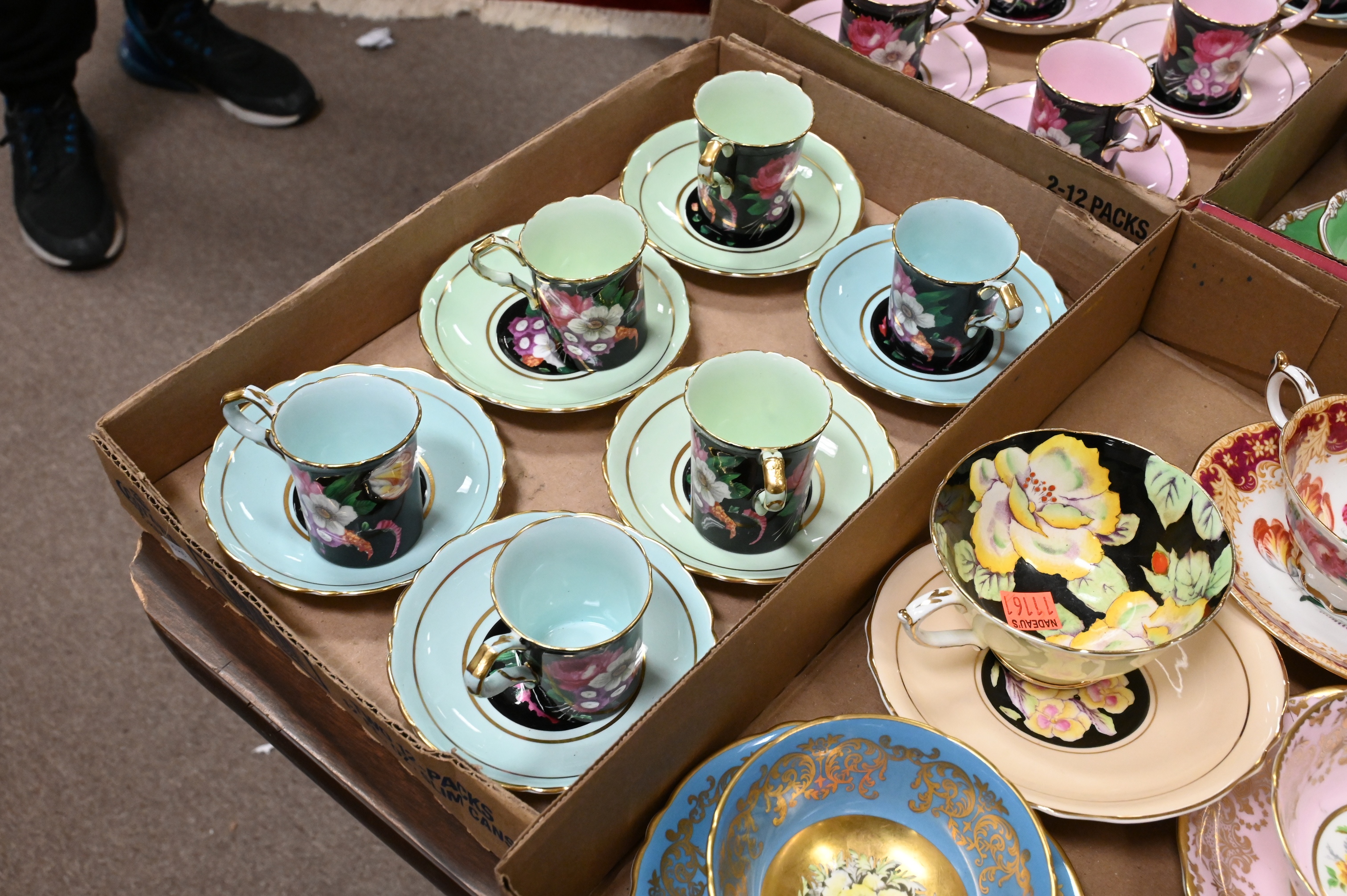 including assorted floral-decorated patterns. Examples feature hand-painted roses and mixed flowers on black, pale green, turquoise, pink, and powder-blue grounds, many heightened with gilt rims and handles.