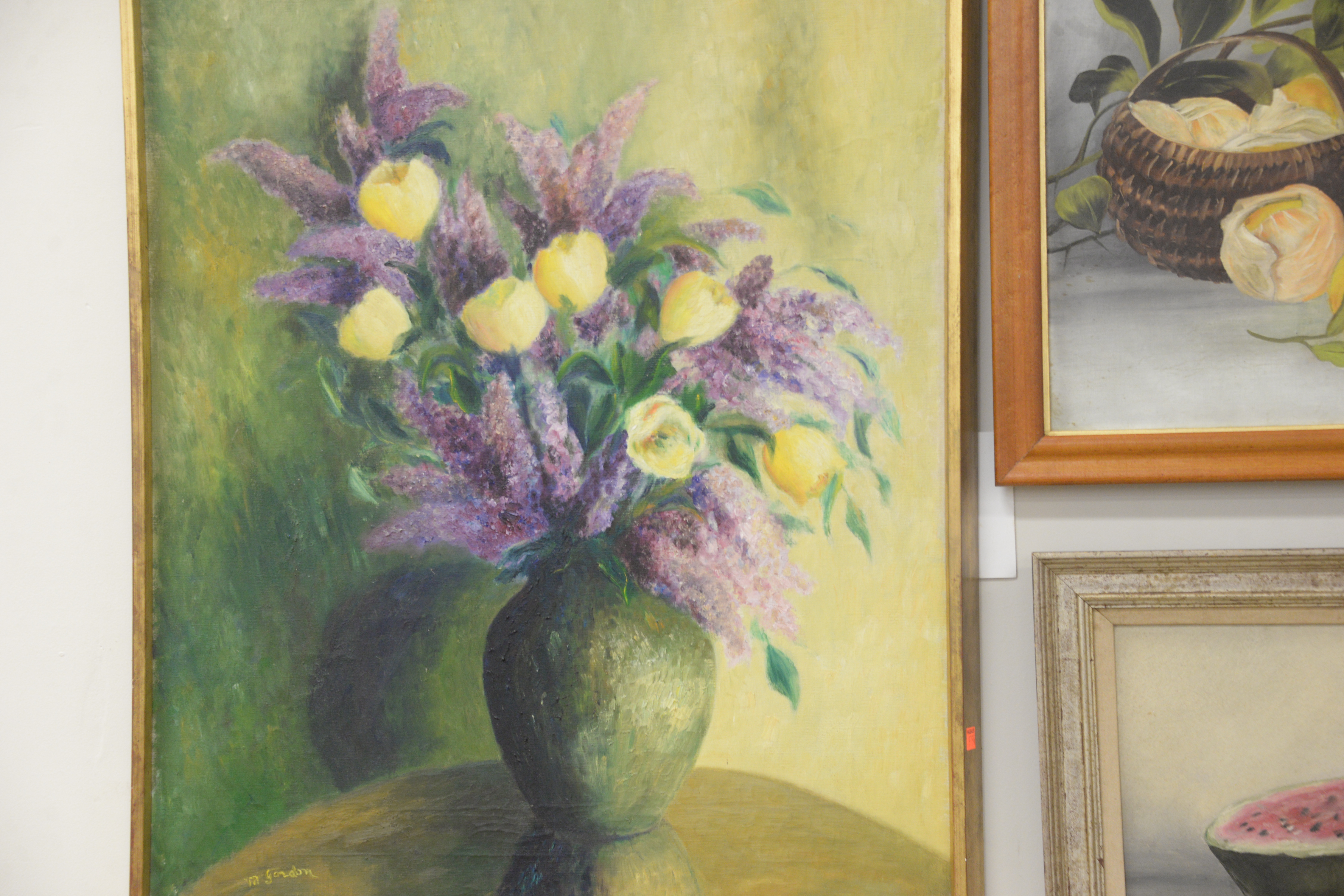 Four Piece Group of Paintings, to include White Rose, oil on canvas still life with watermelons, oil on panel still life of fruit along with still life with tulips, oil on canvas, signed lower left ‘M. Gordon’, each early 20th Century, 13 1/2 x 18 1/2, 24 x 18, and 30 x 25.
