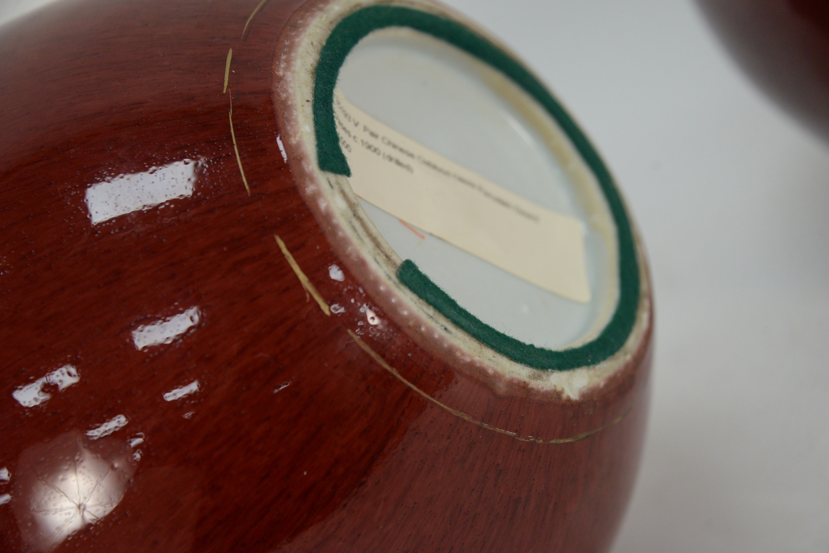 Lot 535: Pair of Chinese Oxblood Glazed Porcelain Gourd Vases, drilled, height 15 1/2 inches. Provenance: Collection from Mr. and Mrs. Fowler, West Hartford, Connecticut.