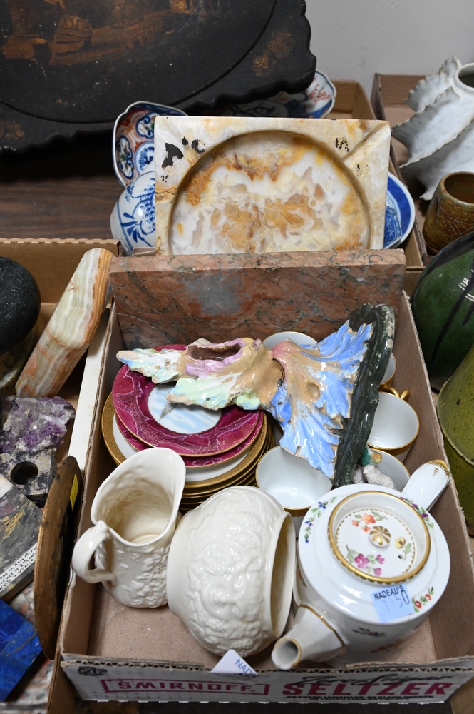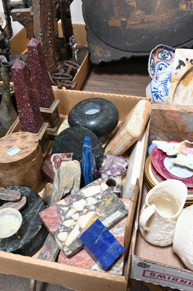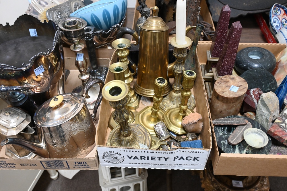 Seven Tray Lots of Metals and Porcelain, to include Chinese porcelain, brass candlesticks (18th and 19th century), silverplate, pair of brass mounted obelisks and bluestone obelisk, four large antique keys, etc.