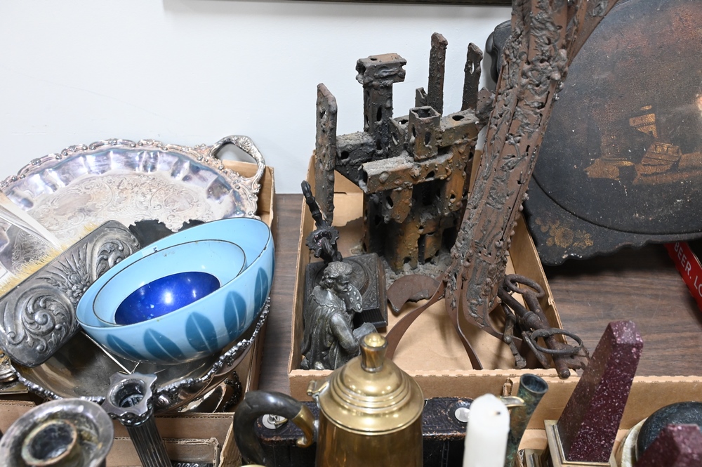 Lot 535: Seven Tray Lots of Metals and Porcelain, to include Chinese porcelain, brass candlesticks (18th and 19th century), silverplate, pair…