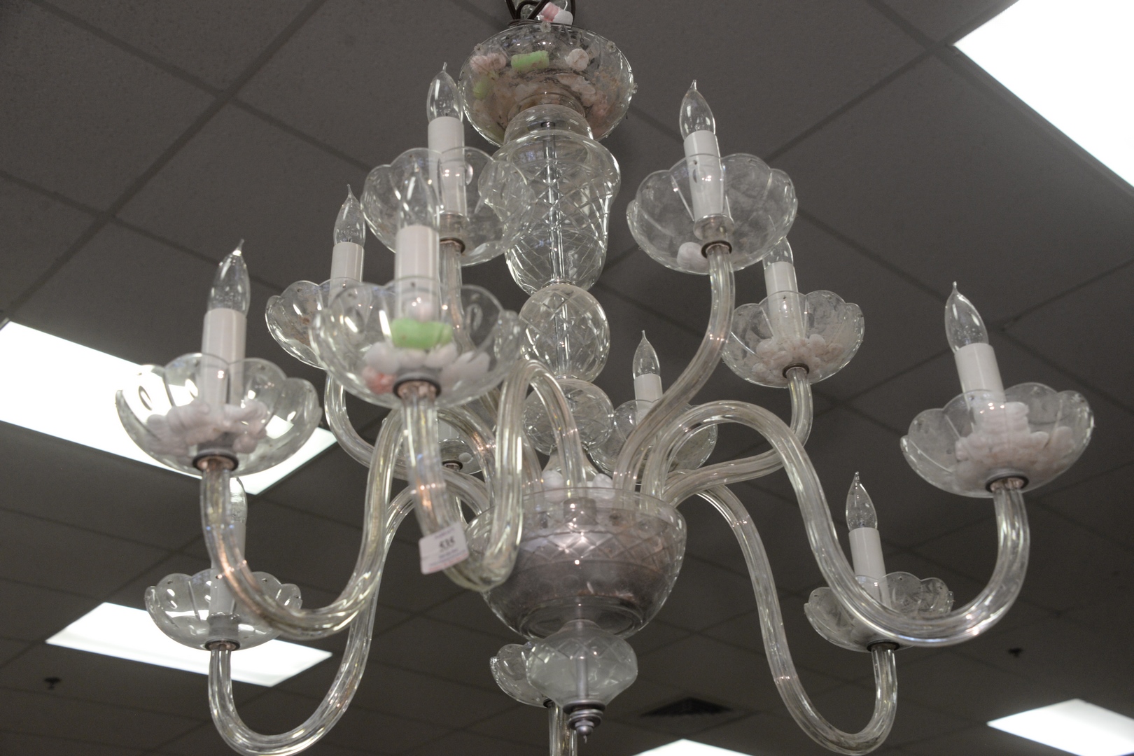 Lot 535: Two piece lighting lot to include Twelve Light Glass Chandelier, along with a square glass four light hanging light approximate l…