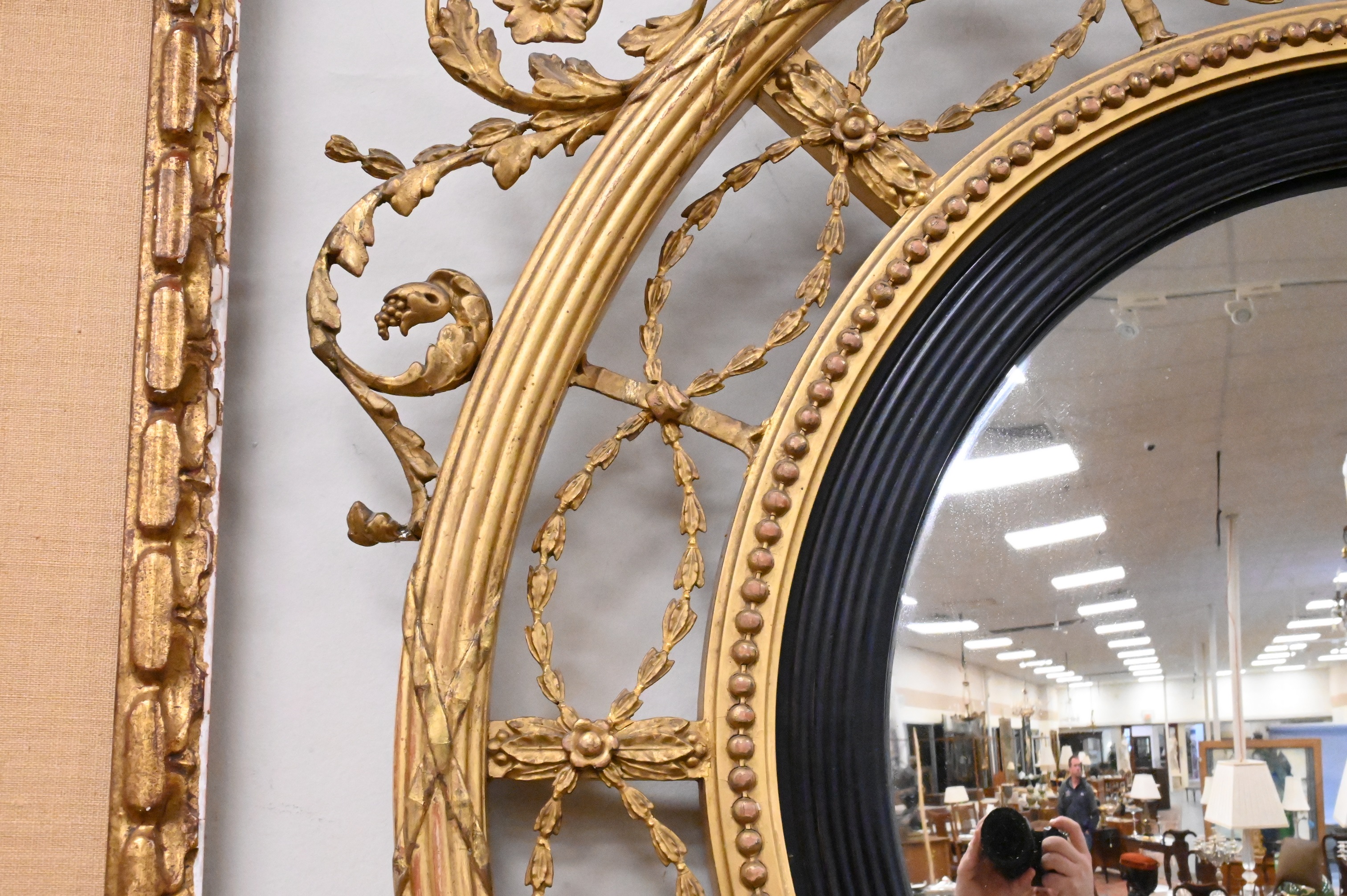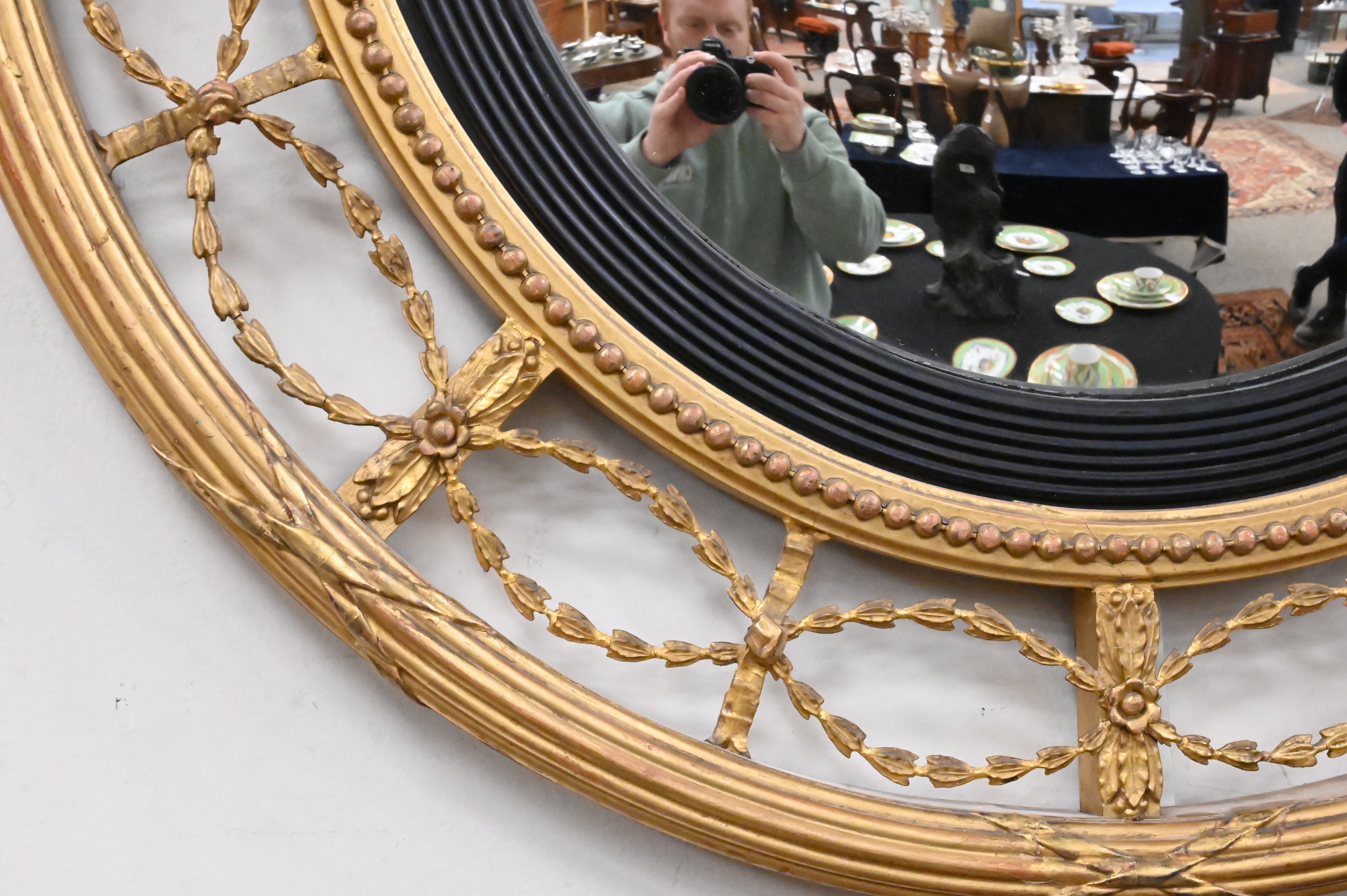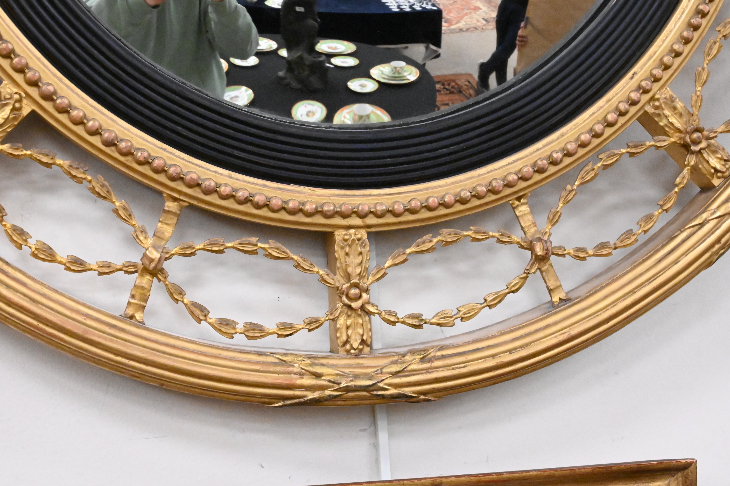 the whole surmounted by scrolling stylized foliate cresting set on circular fasces border, with pierced band of undulating garlands interspersed with ribbon ties, flower heads, and leaf form decoration, all around convex mirror plate within reeded ebony slip, and bead-moulded border circa 1830