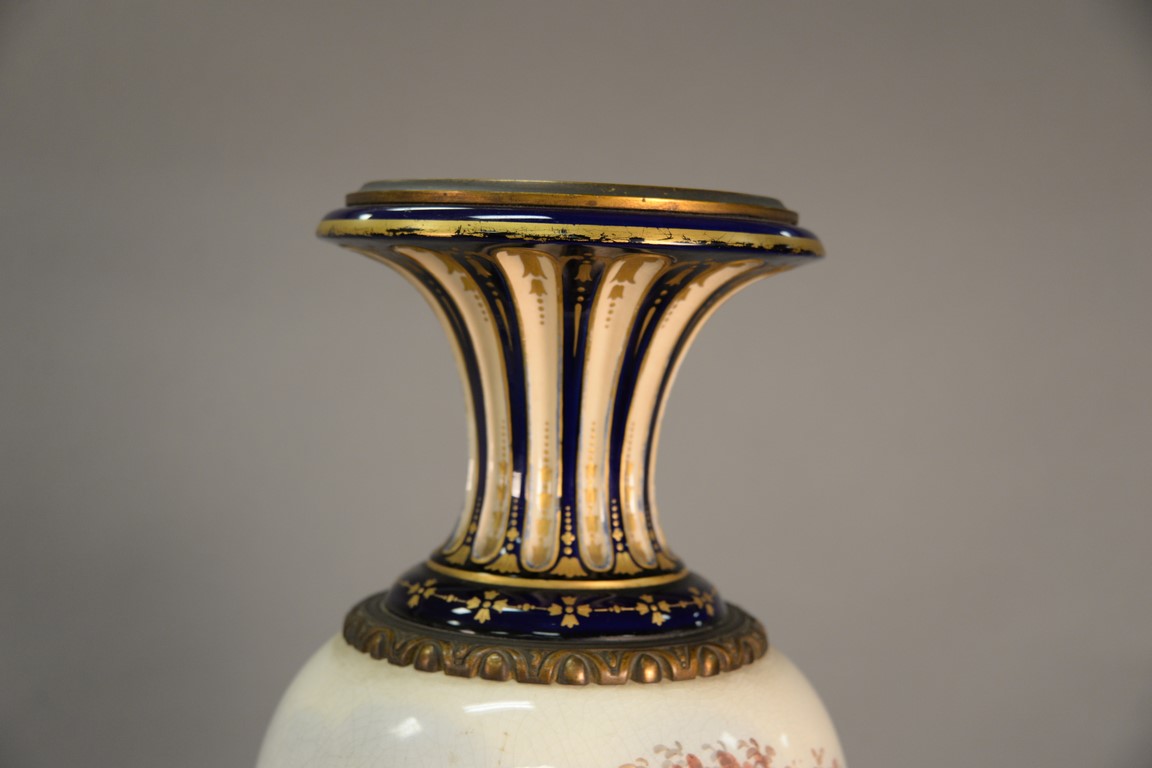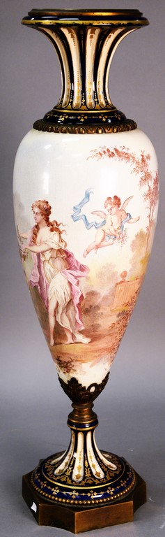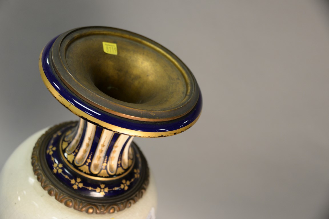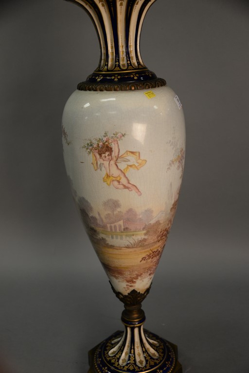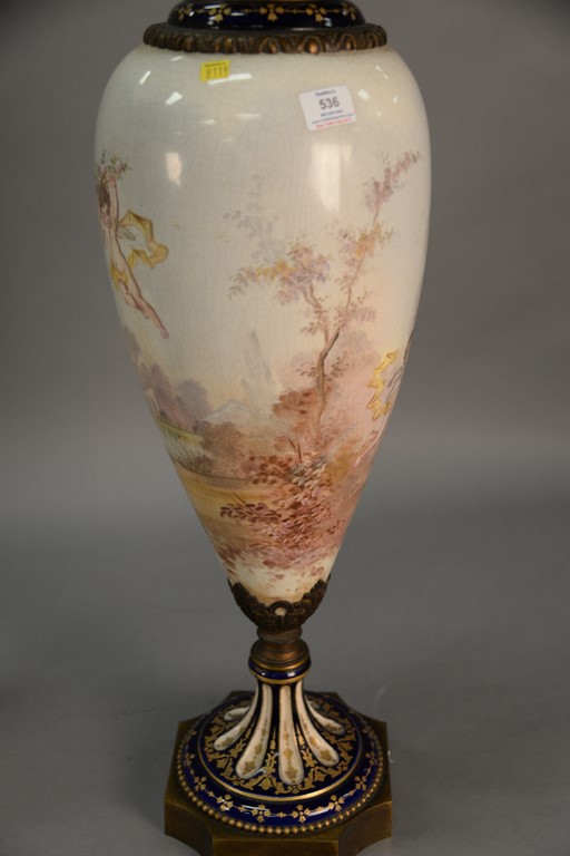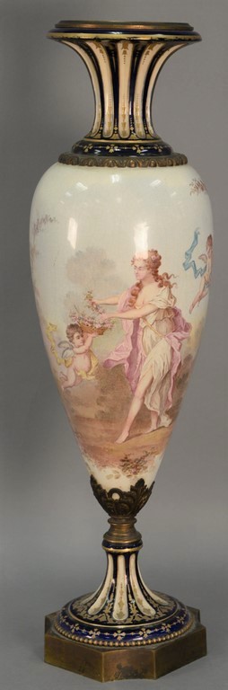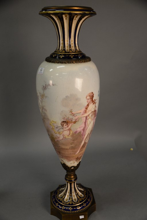 Lot 536: 19th century monumental French Sevres style bronze and porcelain urn vase with painted elegant woman and cherubs having heavy gilt d…