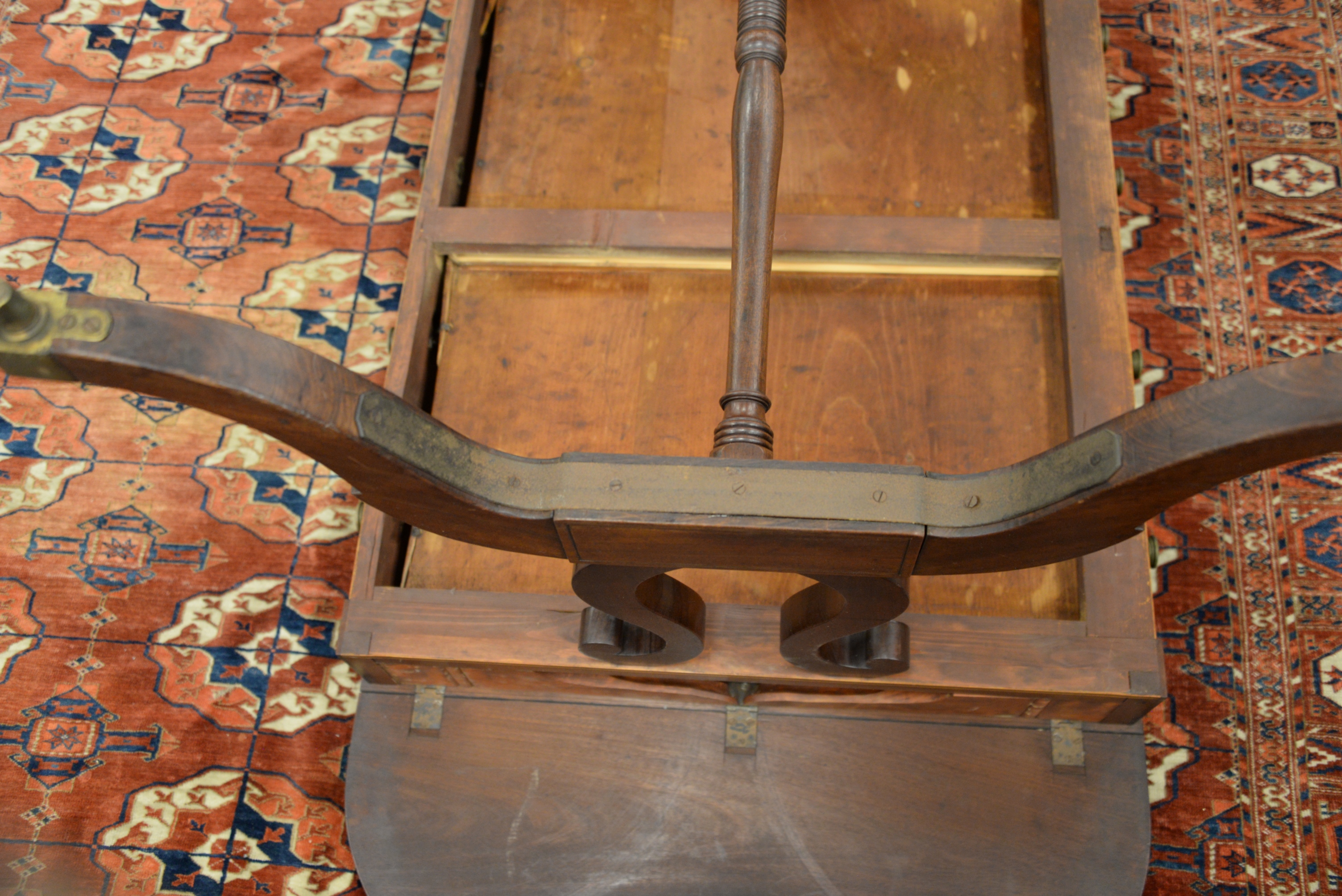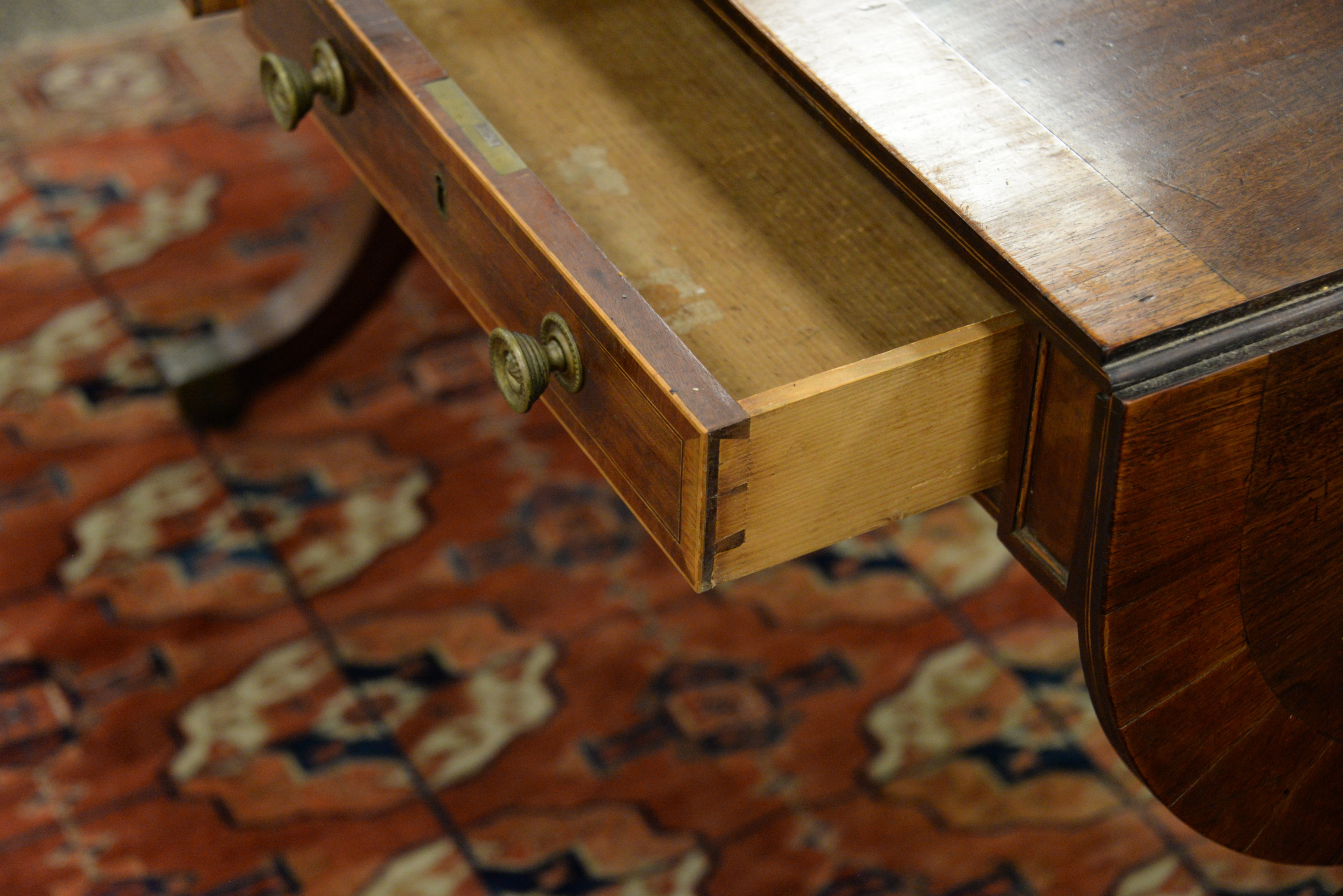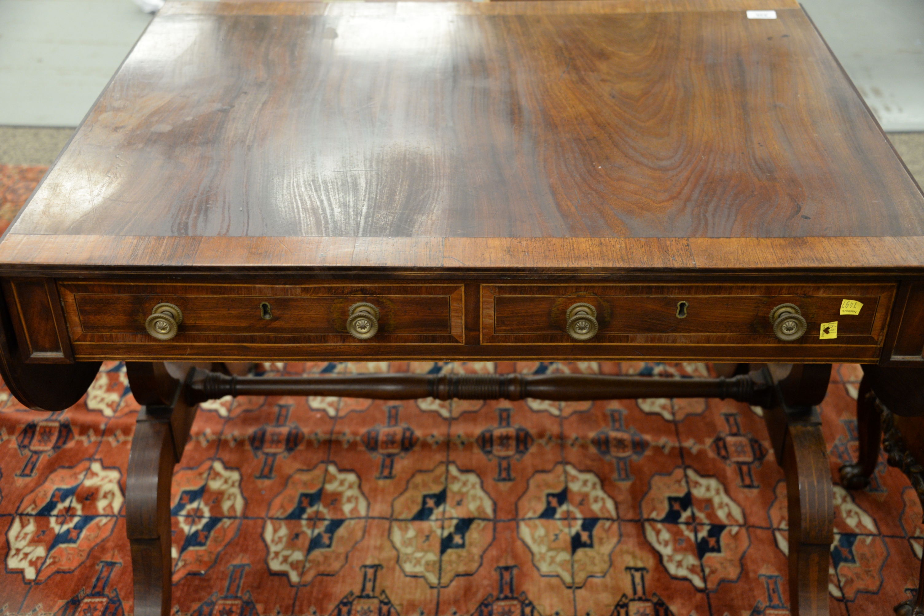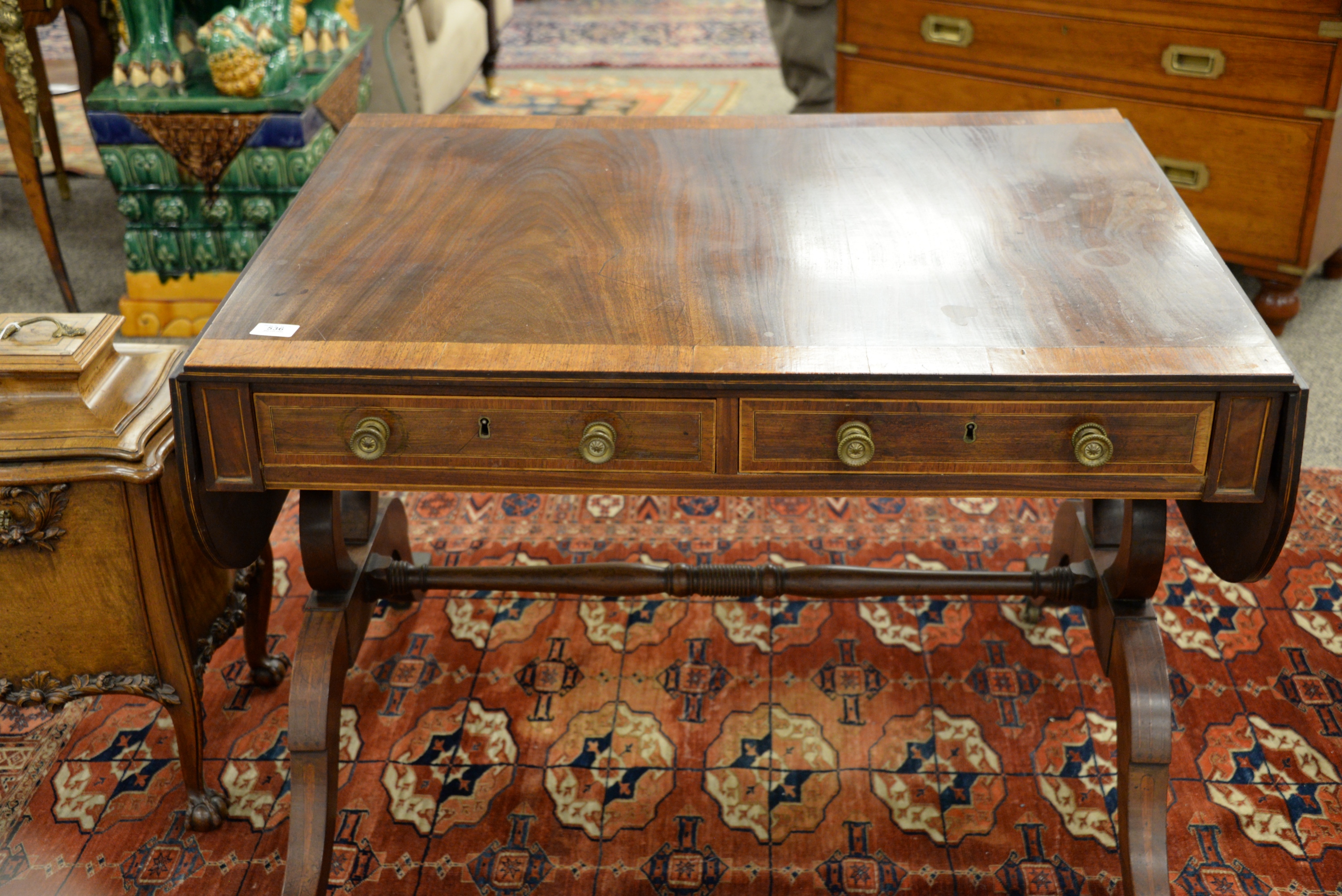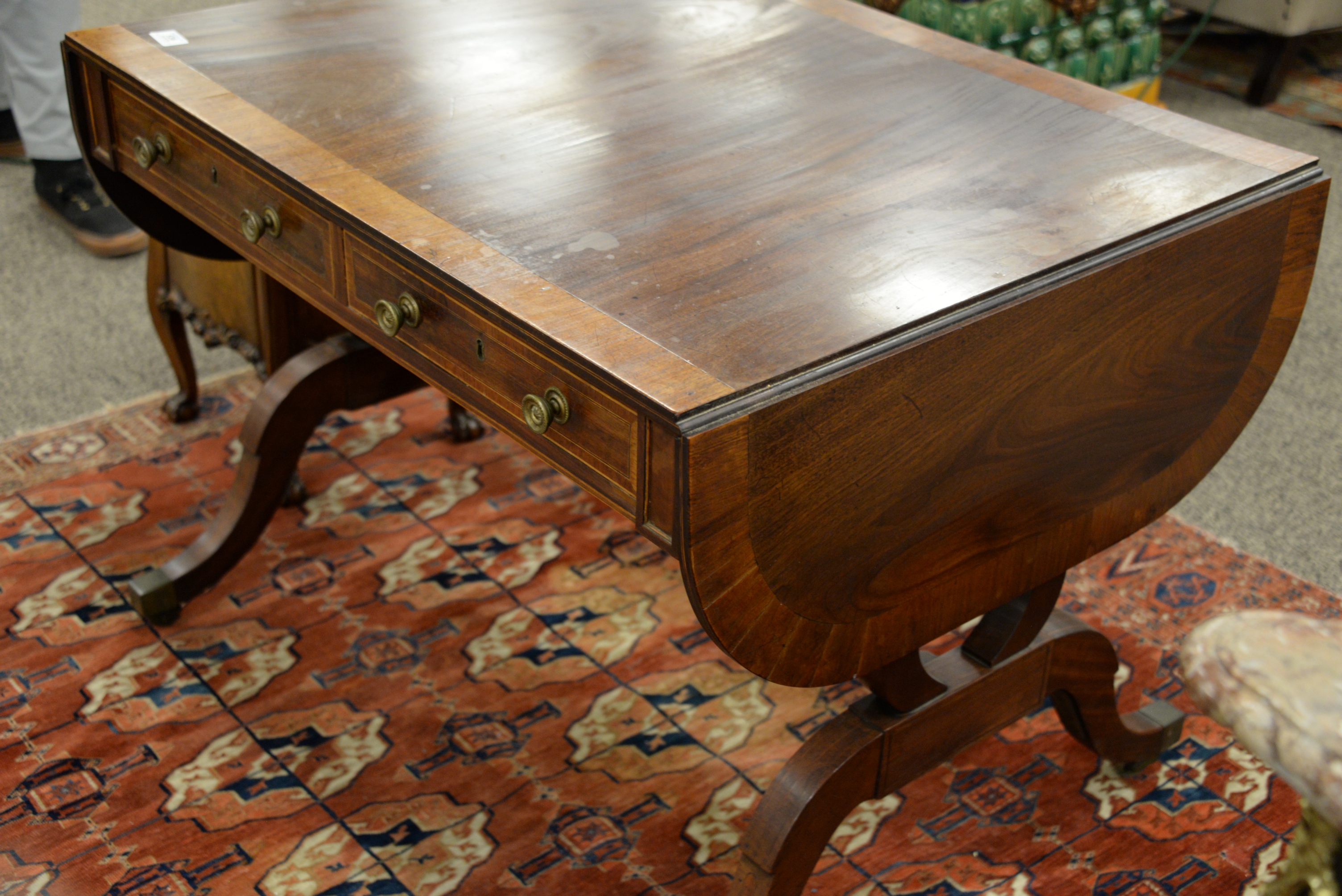 Duncan Phyfe Sofa Table, mahogany having banded inlaid top having rounded drop leaves and two inlaid drawers, two false drawers all by lyre style supports on four inlaid downswept members, ending in brass feet, probably New York, circa 1820, height 28 inches, top 29 1/2″ x 36 3/4″, opens to 60 inches.