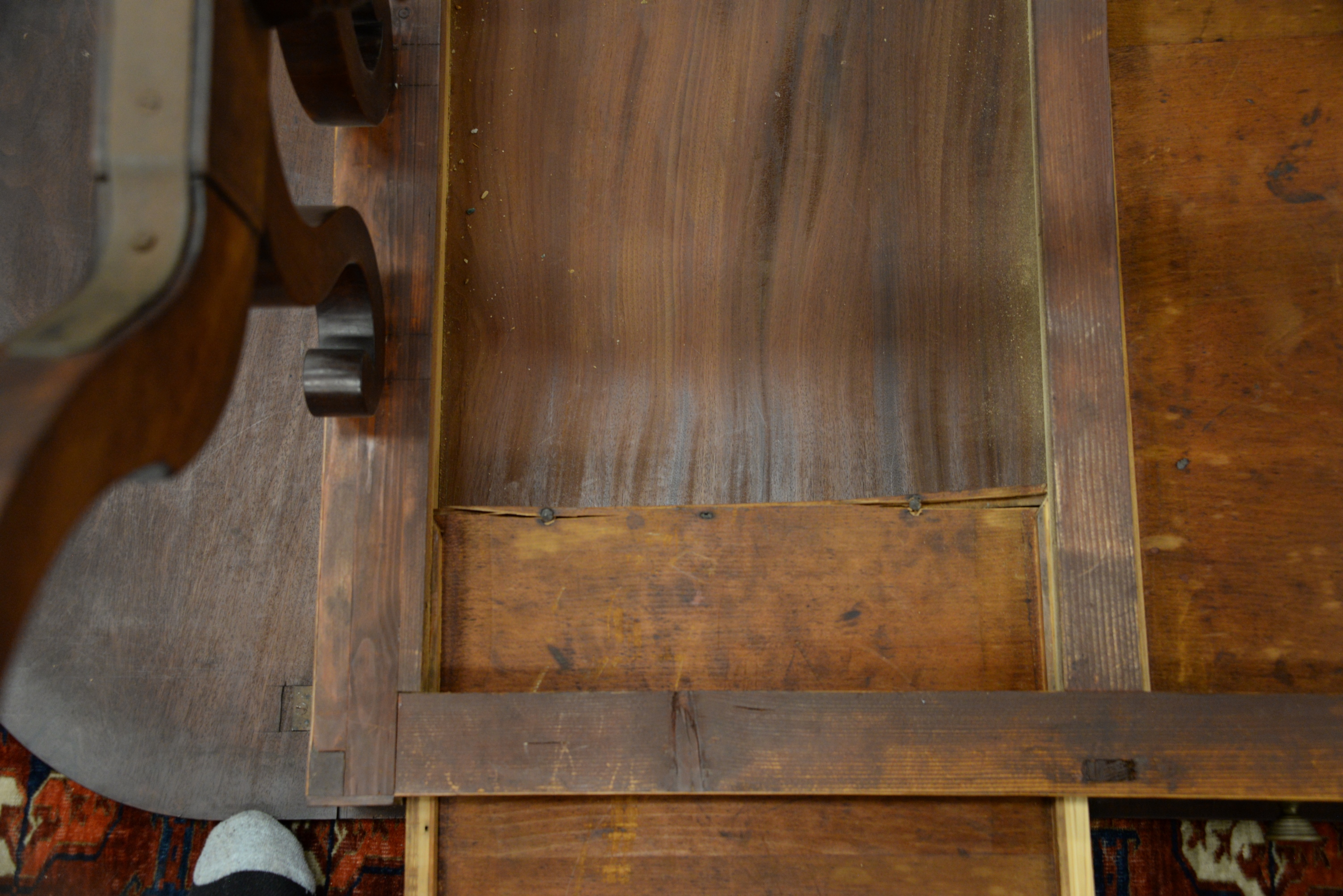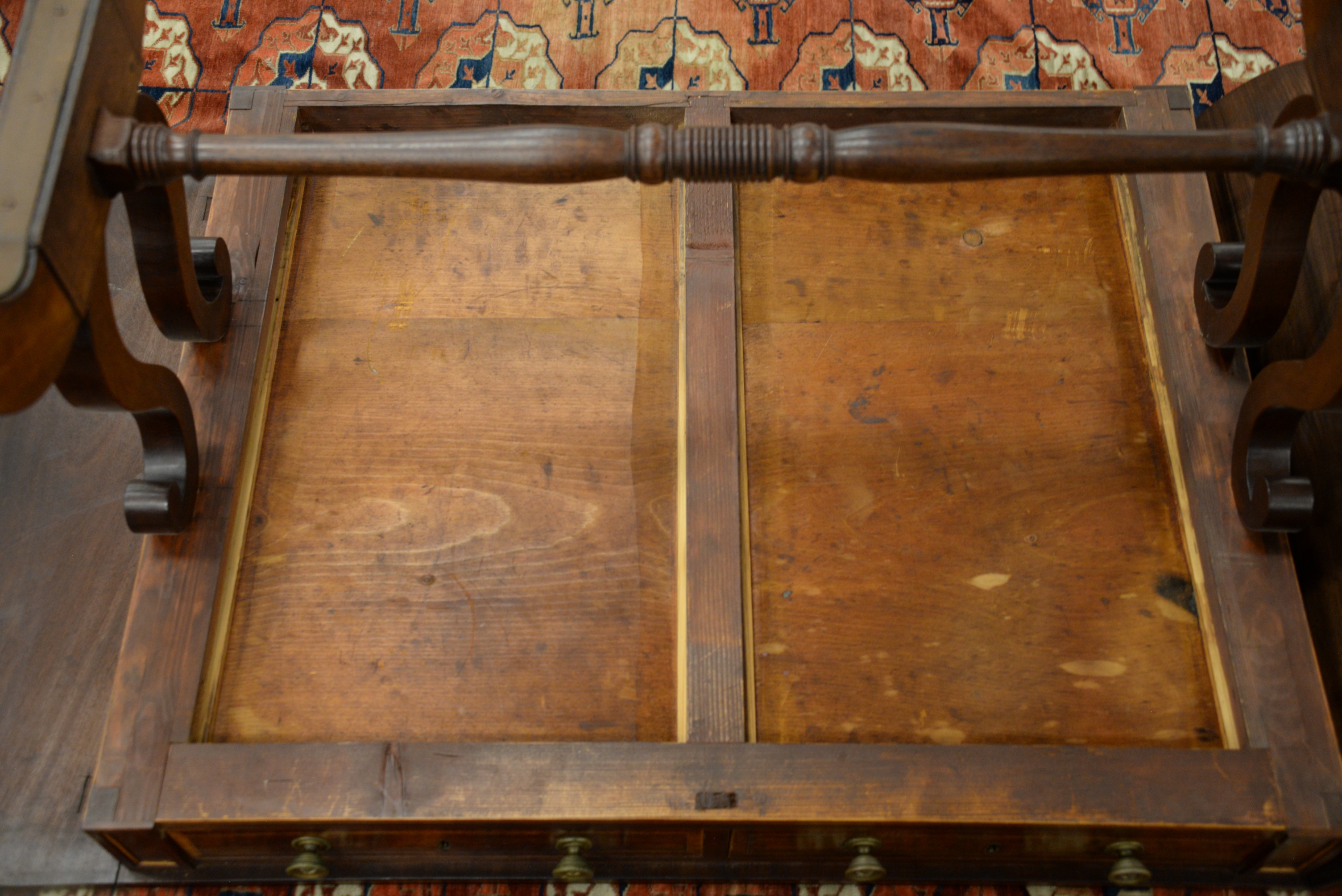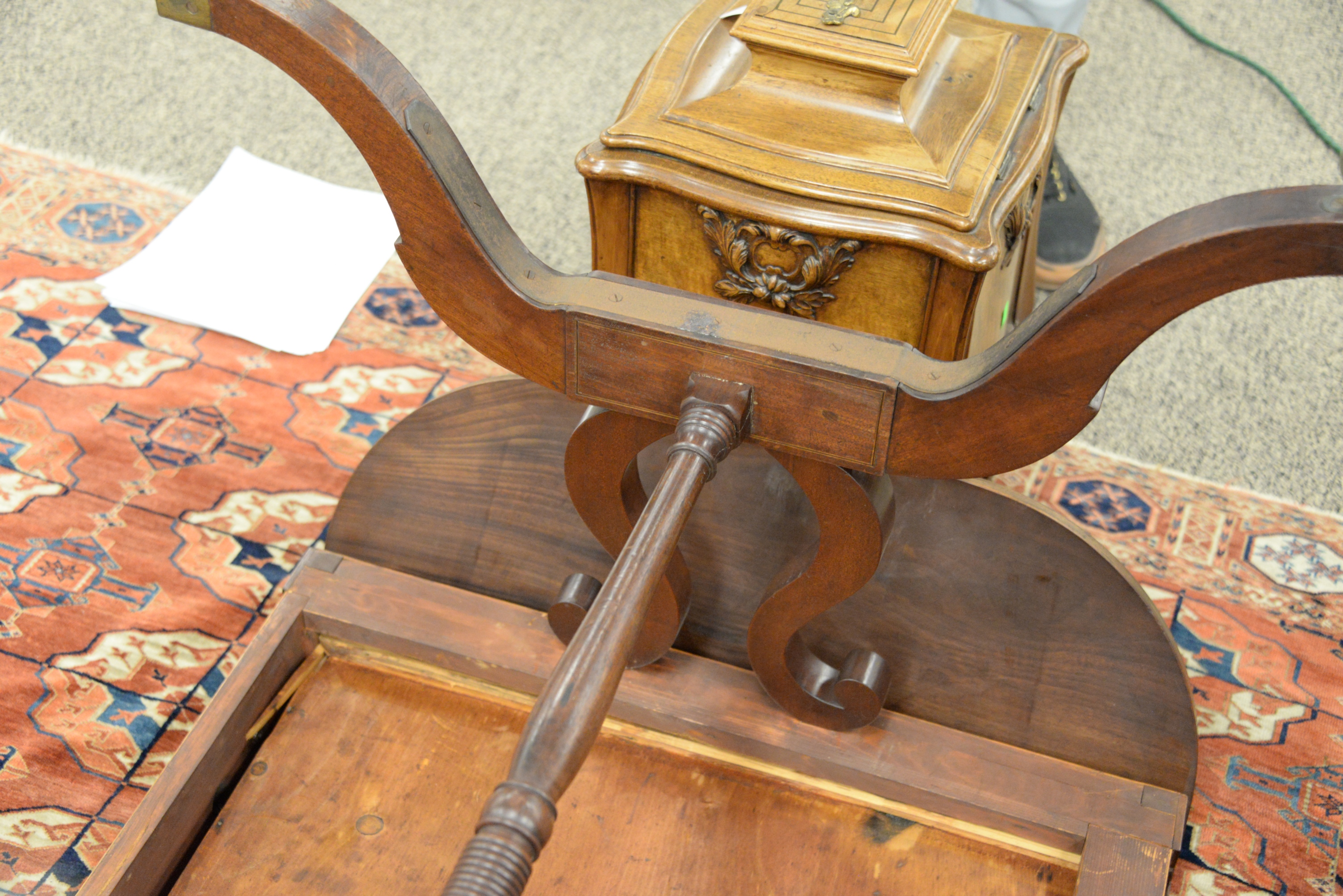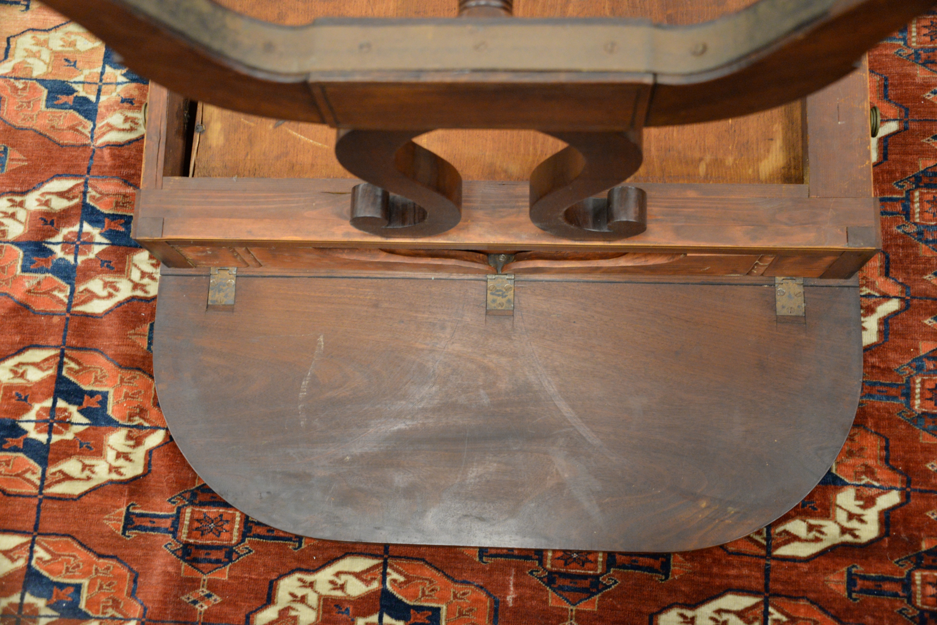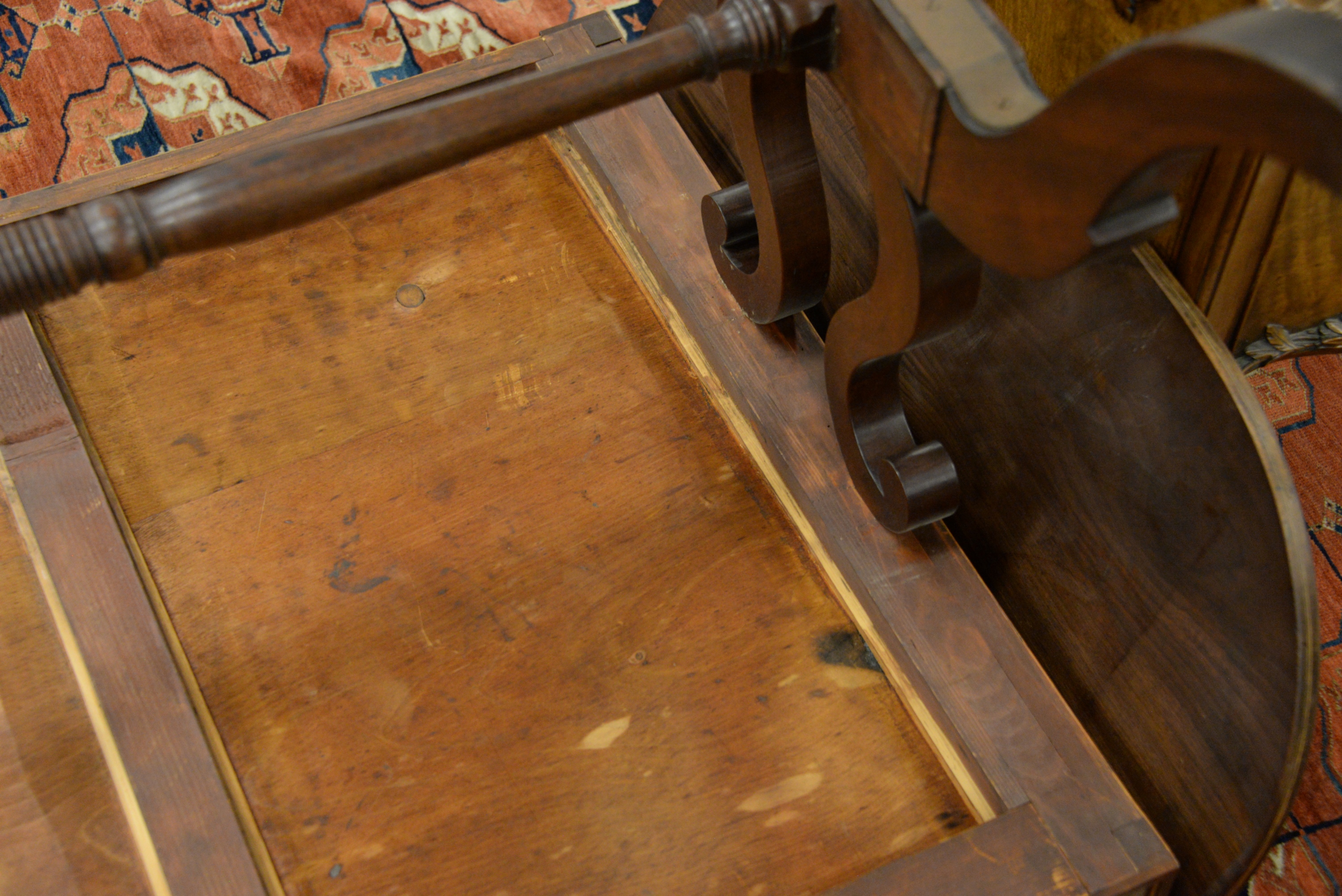 Duncan Phyfe Sofa Table, mahogany having banded inlaid top having rounded drop leaves and two inlaid drawers, two false drawers all by lyre style supports on four inlaid downswept members, ending in brass feet, probably New York, circa 1820, height 28 inches, top 29 1/2″ x 36 3/4″, opens to 60 inches.