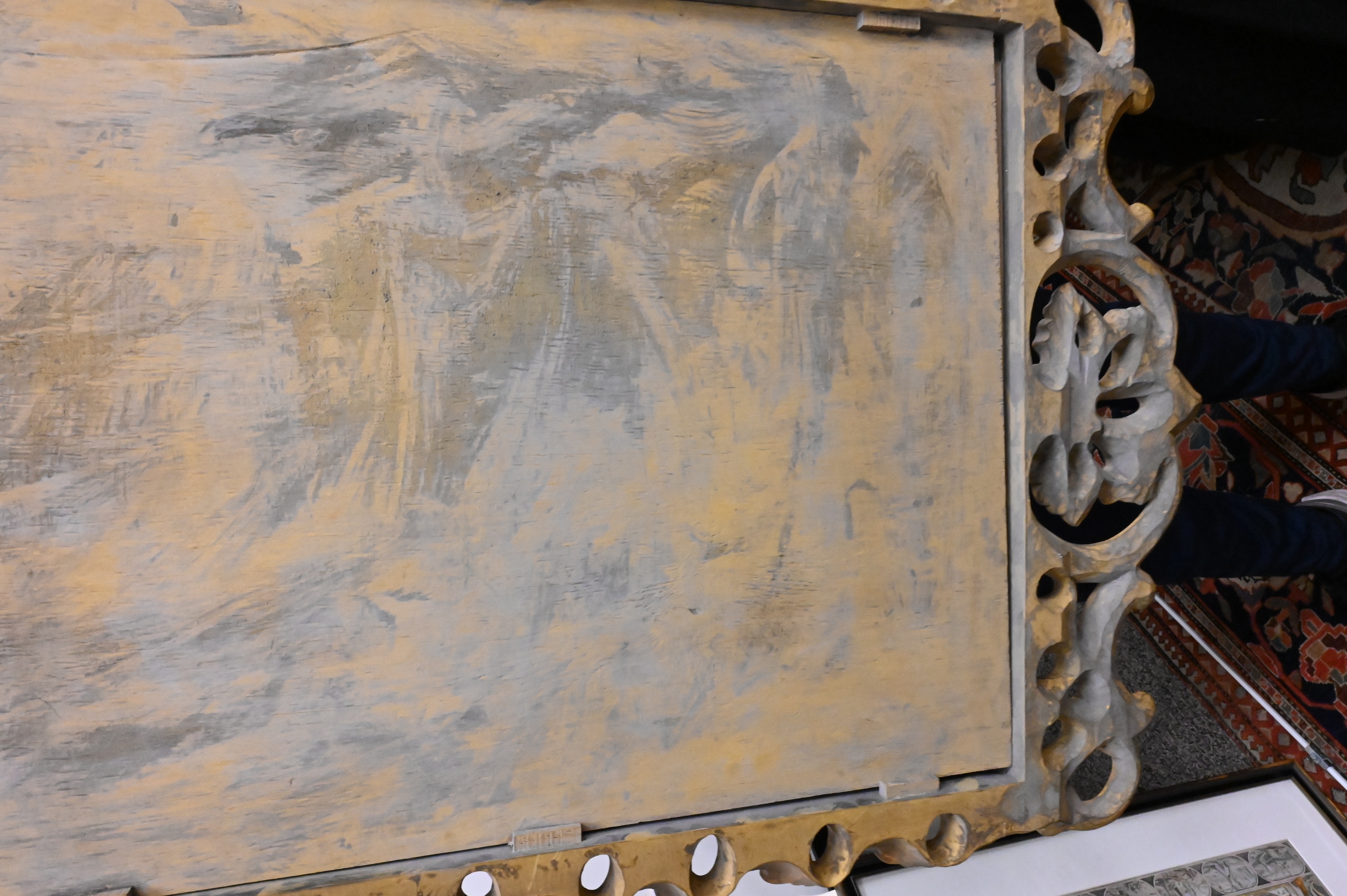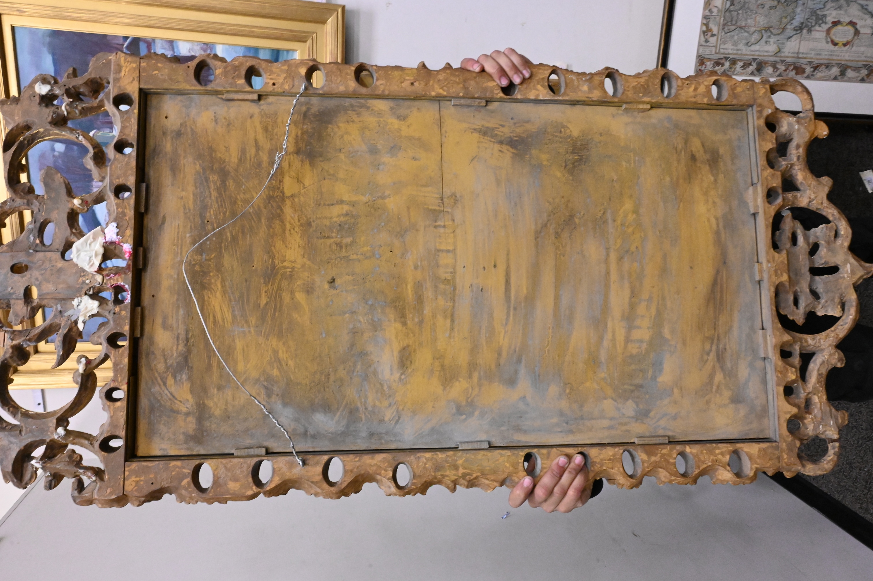 one 20th century, the other mid 18th century, rectangular mirror plate having carved frame of ribbons, foliage, and acorns, having wear, top of one having professional repair