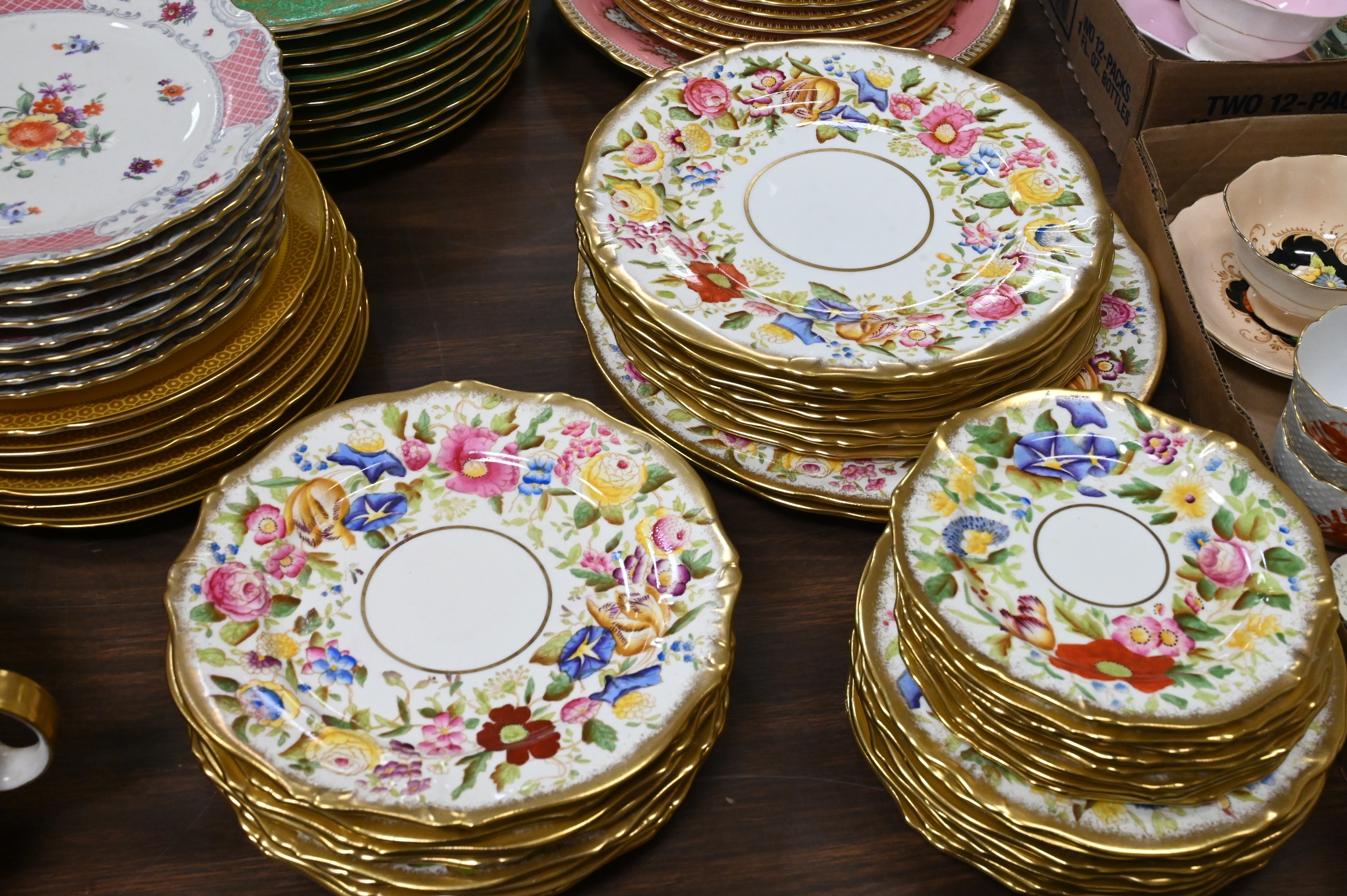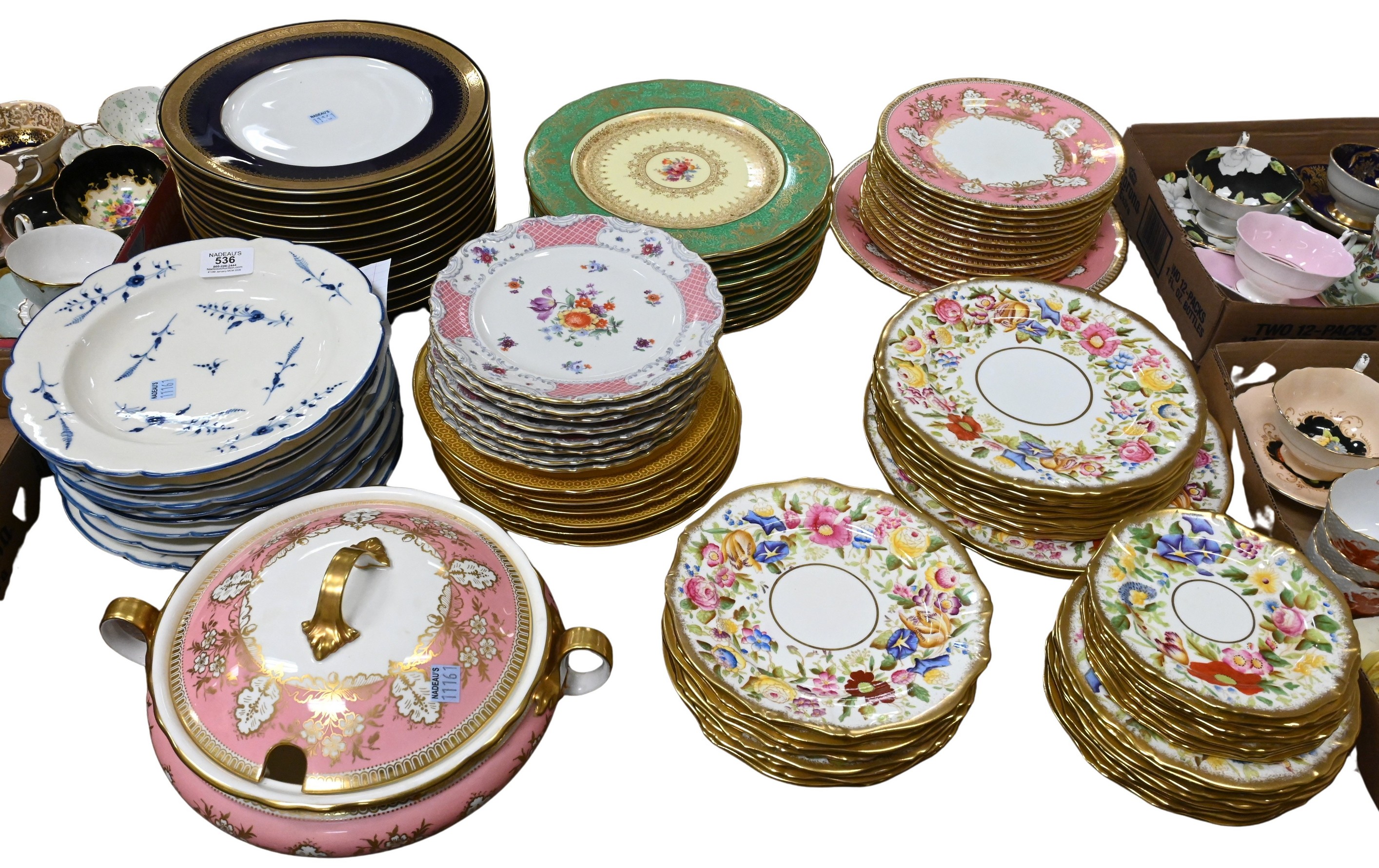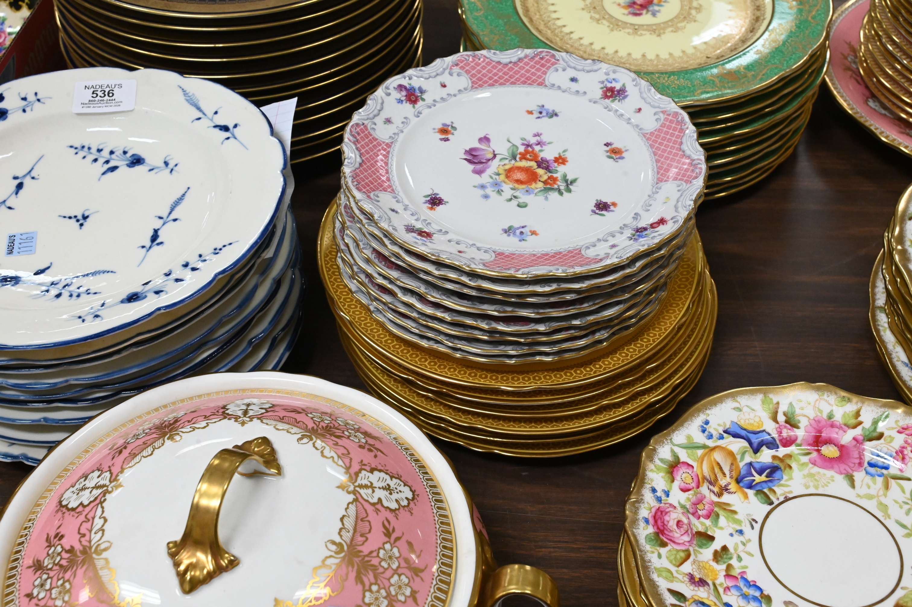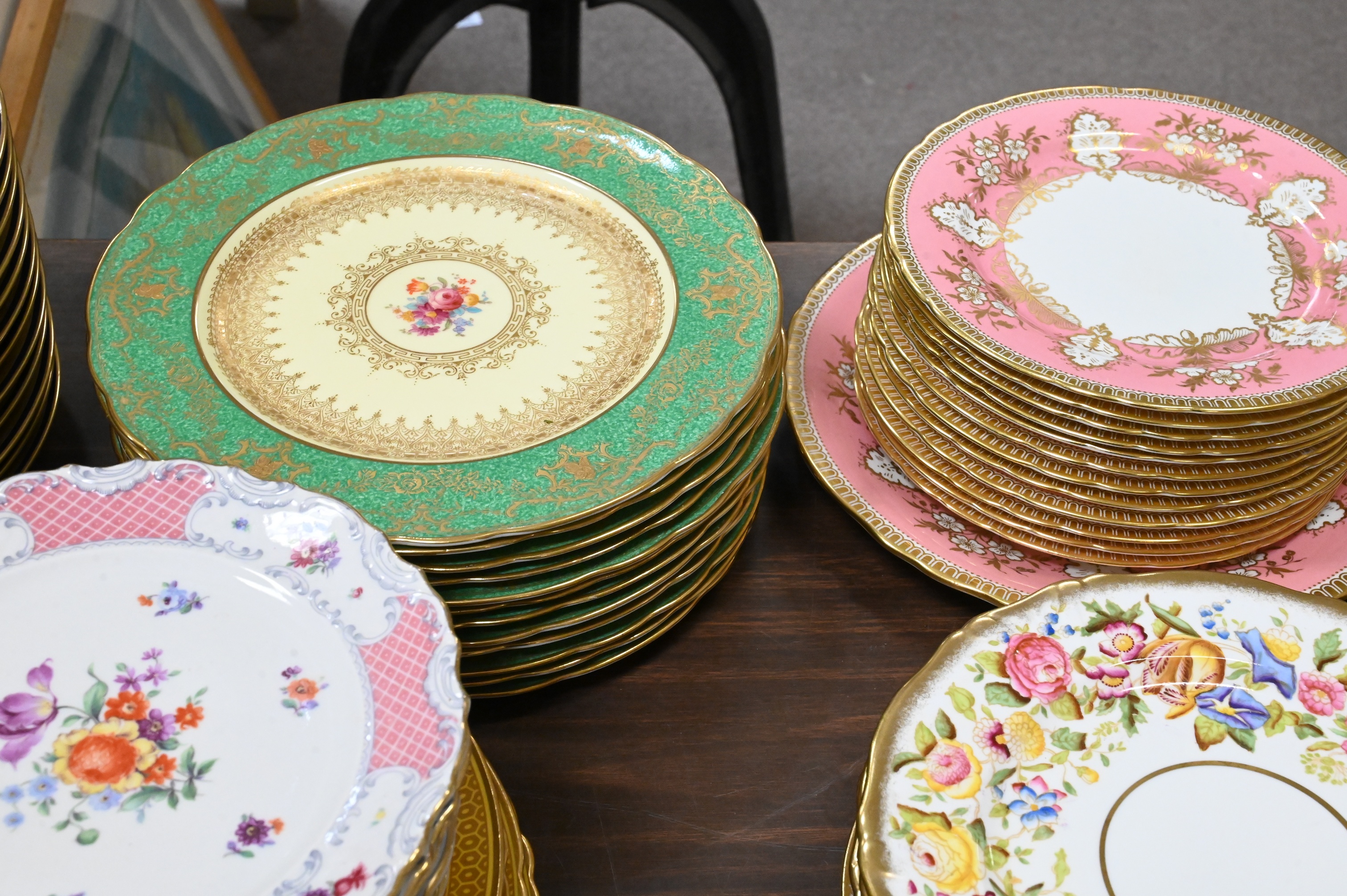 including Bavarian examples with cobalt and gilt borders; Spode / Copeland yellow-ground plates with gilt decoration; and additional floral and gilt-decorated wares, Aynsley, England floral and gilt pink-ground floral and gilt set with a covered serving dish.
