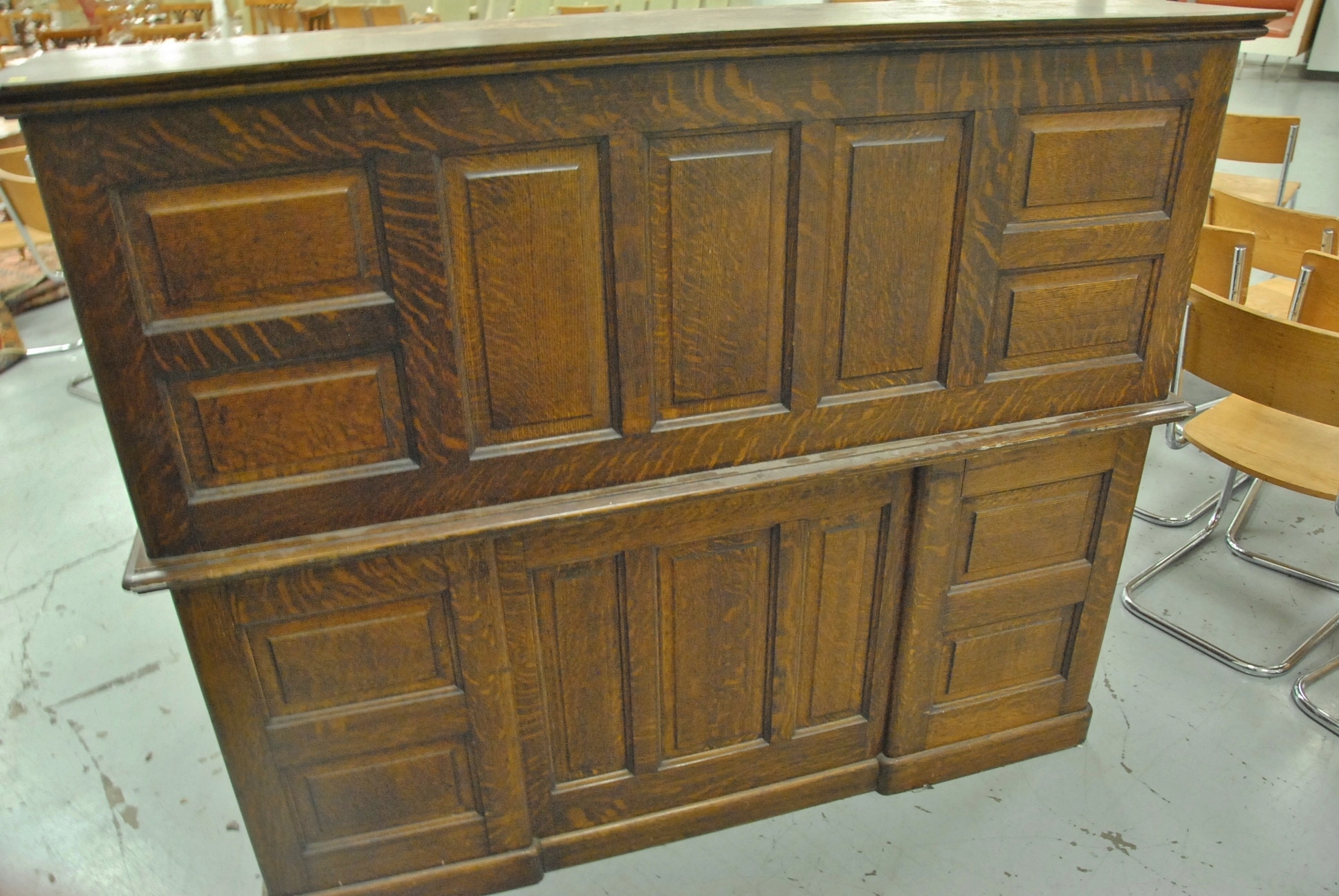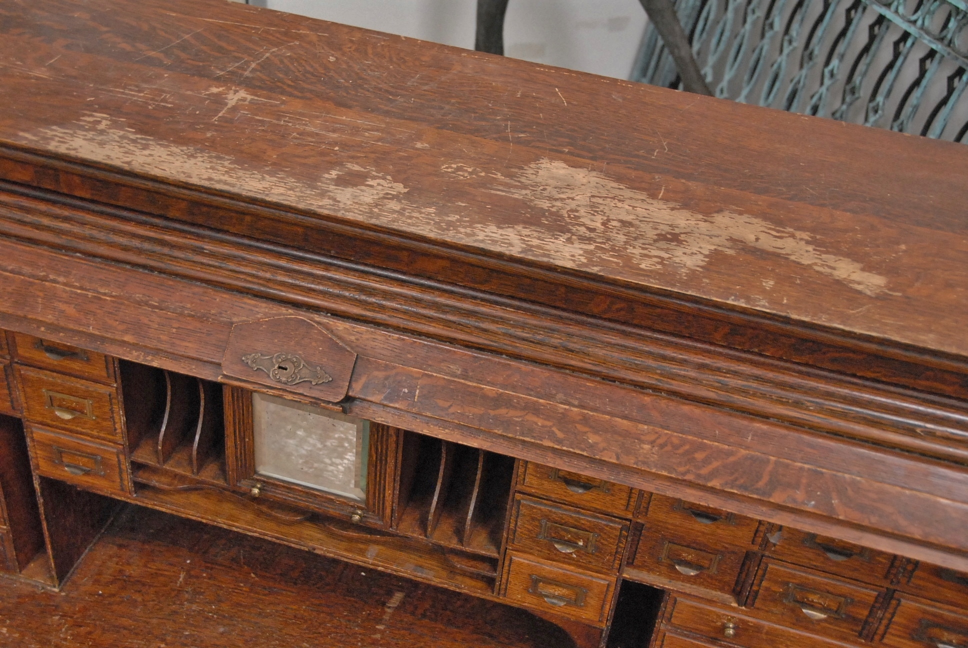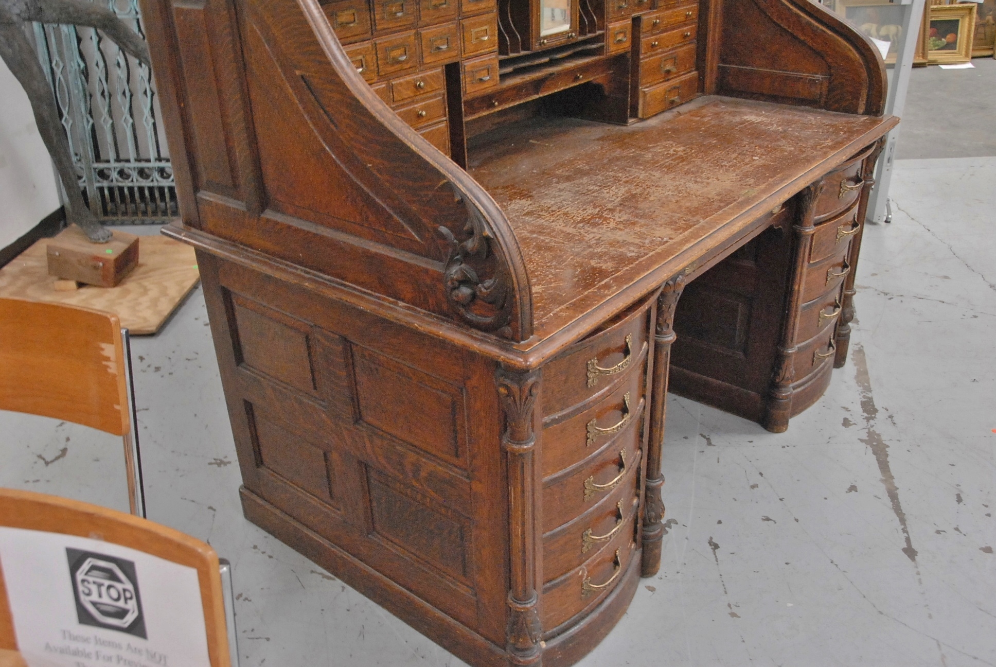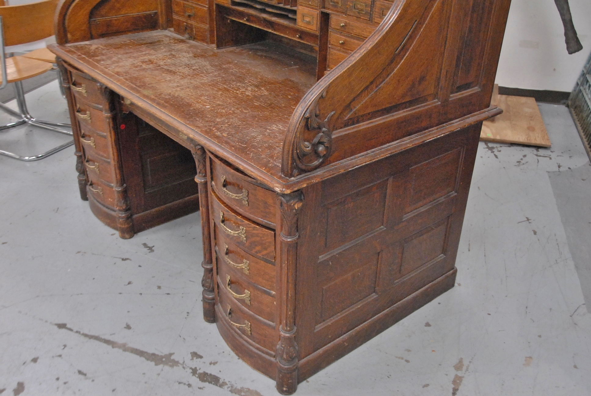 Oak desk having high S roll top, carved sides, and carved and fluted columns, having double bank of bowed drawers with brass handles and interior with thirty-one drawers, center drawer is mirrored, sides and back with raised panels top surfaces in need of refinishing. ht. 54 1/2 in. wd. 66 in. dp. 38 1/2 in. Provenance: Originally at Stanley Works. Being sold to benefit the New Britain Museum of Art