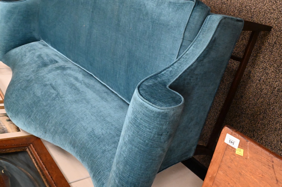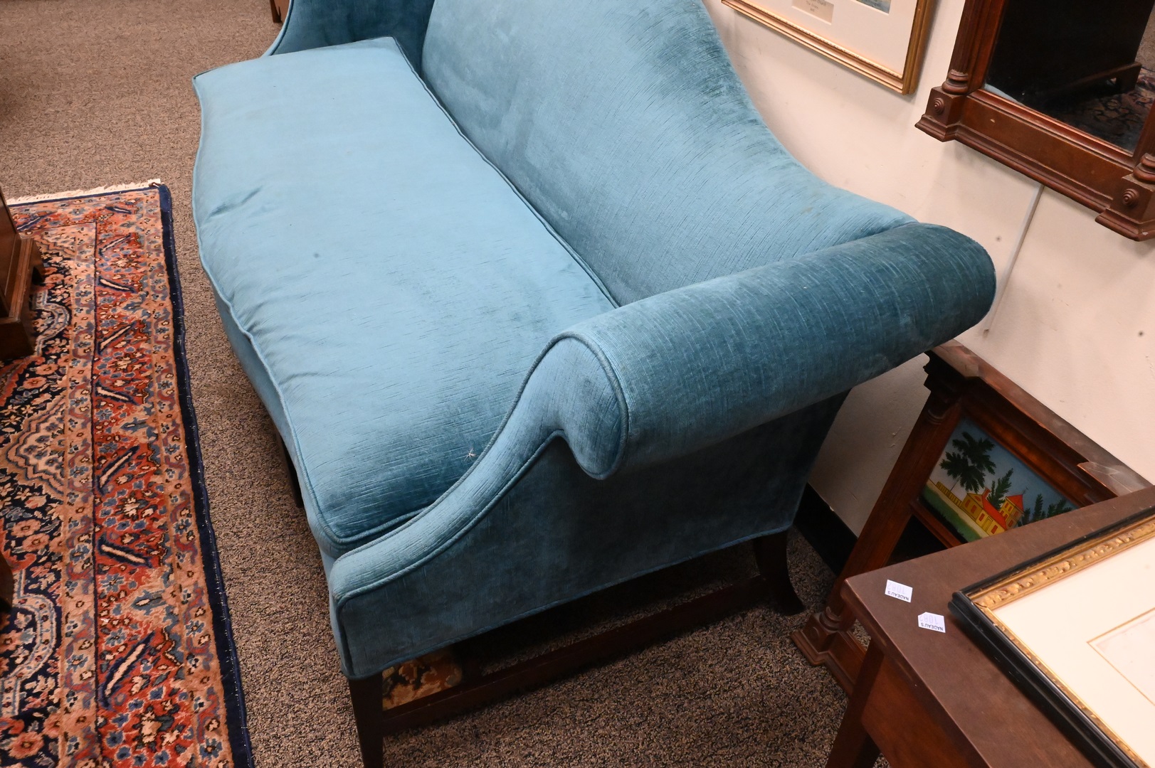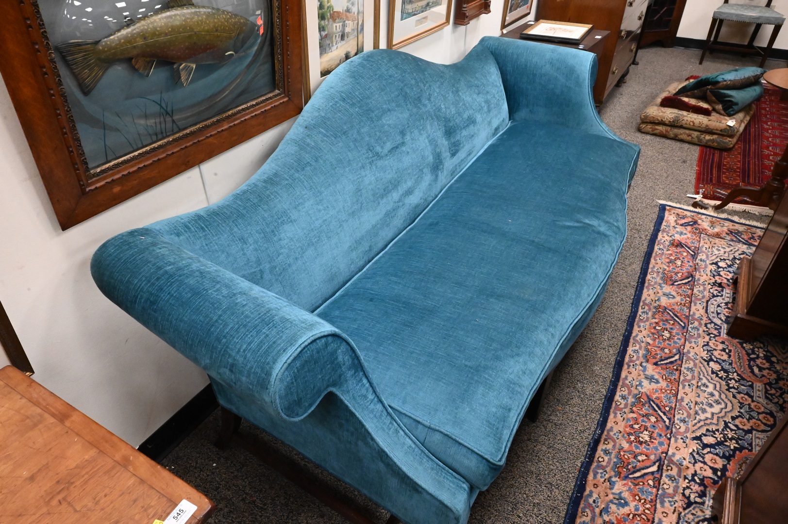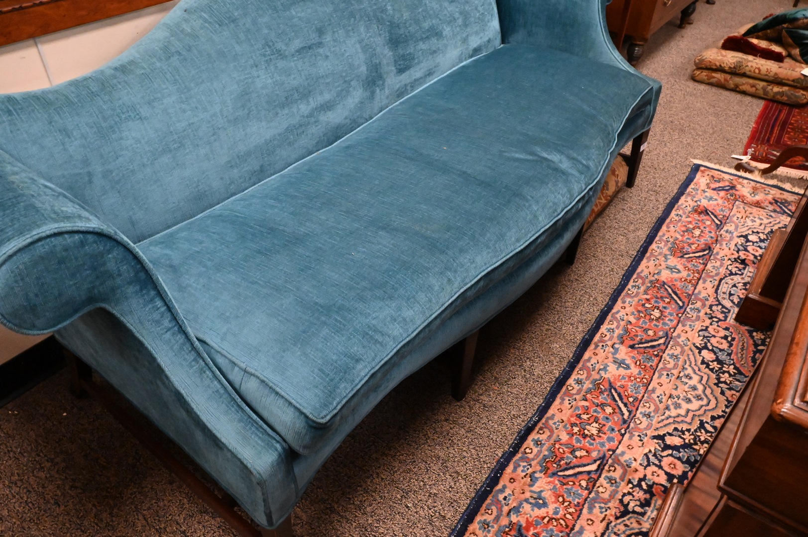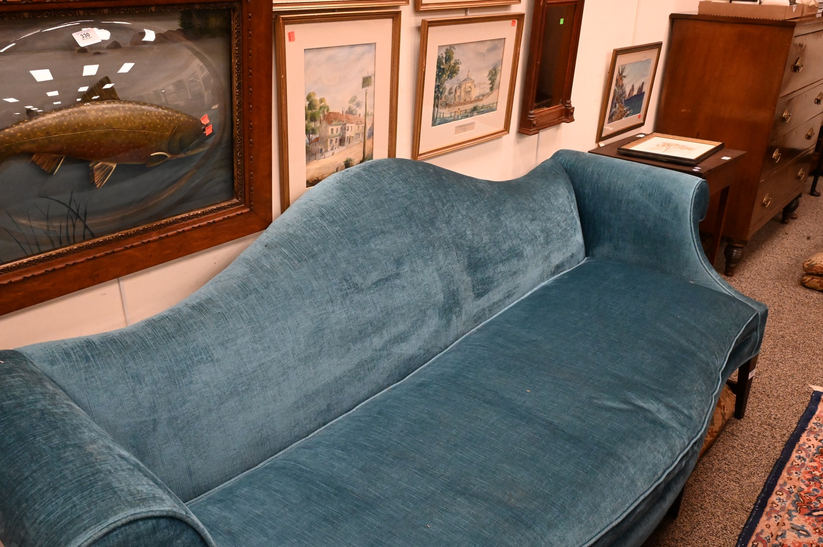 Federal Style Camelback Sofa, height 35 inches, length 82 inches.